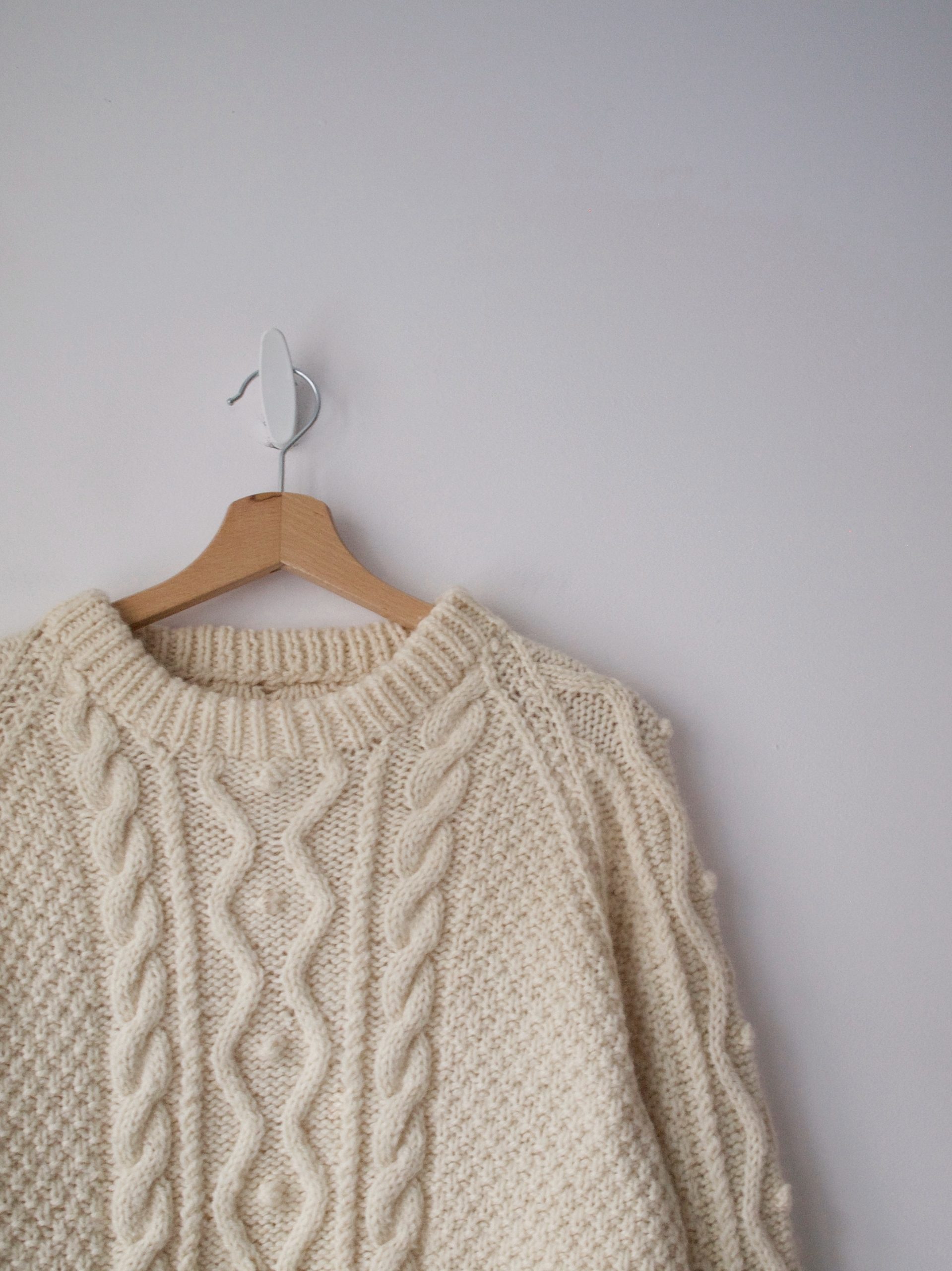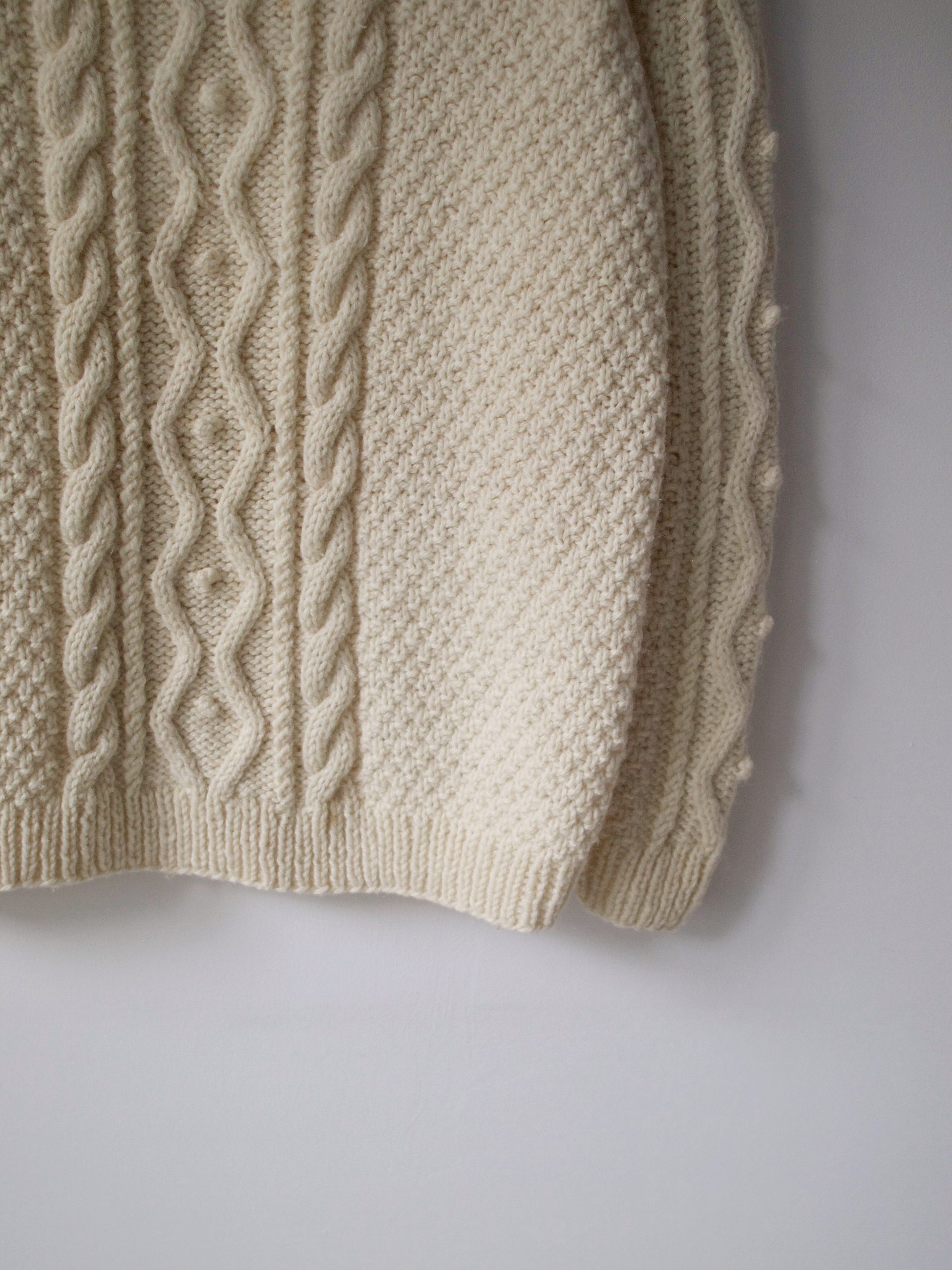 Sweter o grubym splocie, wykonany ręcznie. Rozmiar z metki: brak Skład: brak metki, 100% wełna Stan: bardzo dobry Szerokość w klatce 53 cm Długośćcałkowita 63 cm
