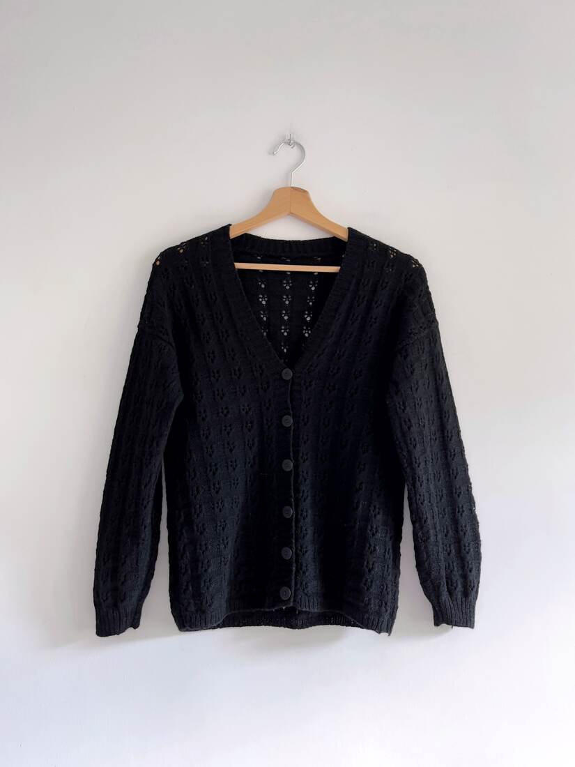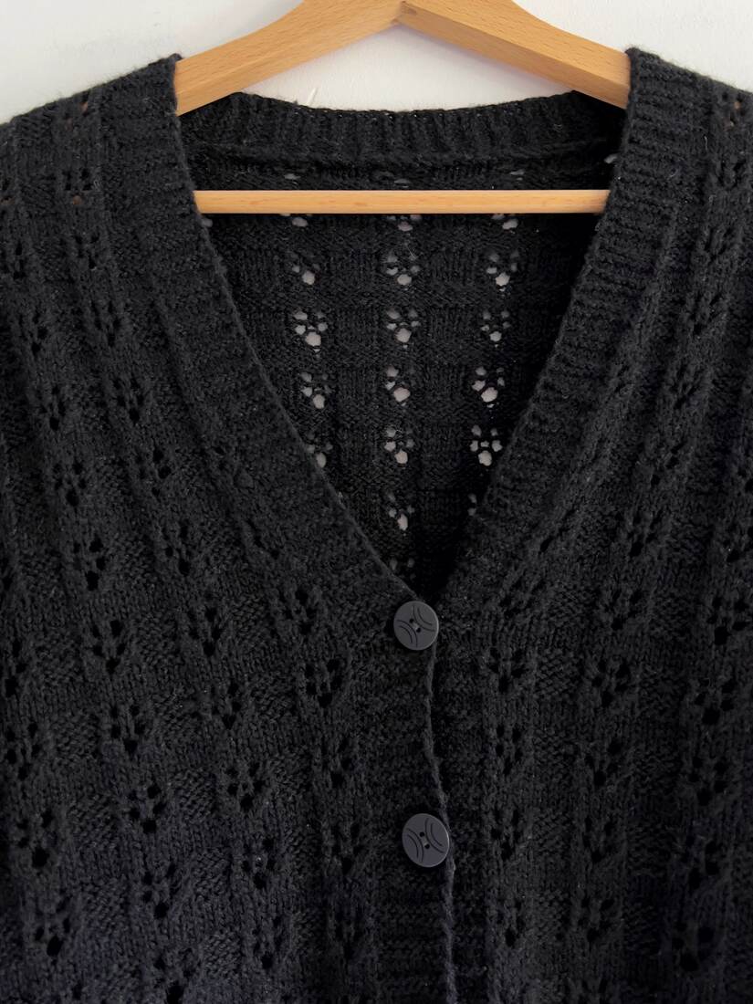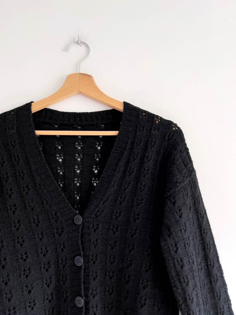 Ręcznie robiony ażurowy sweter. Brak metki ze składem, najprawdopodobniej mieszanka wełny, moheru i poliamidu. Polecam na XS-S. Bez wad.