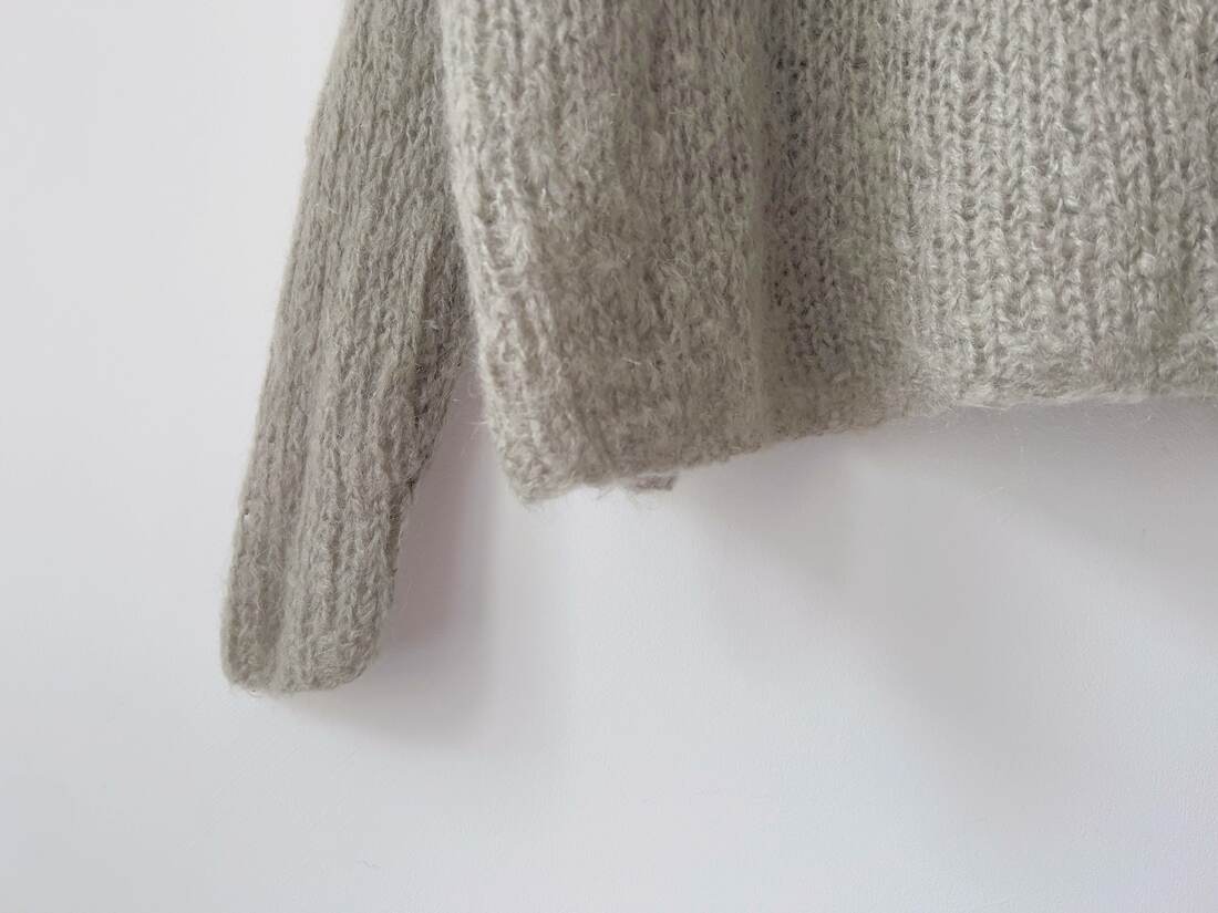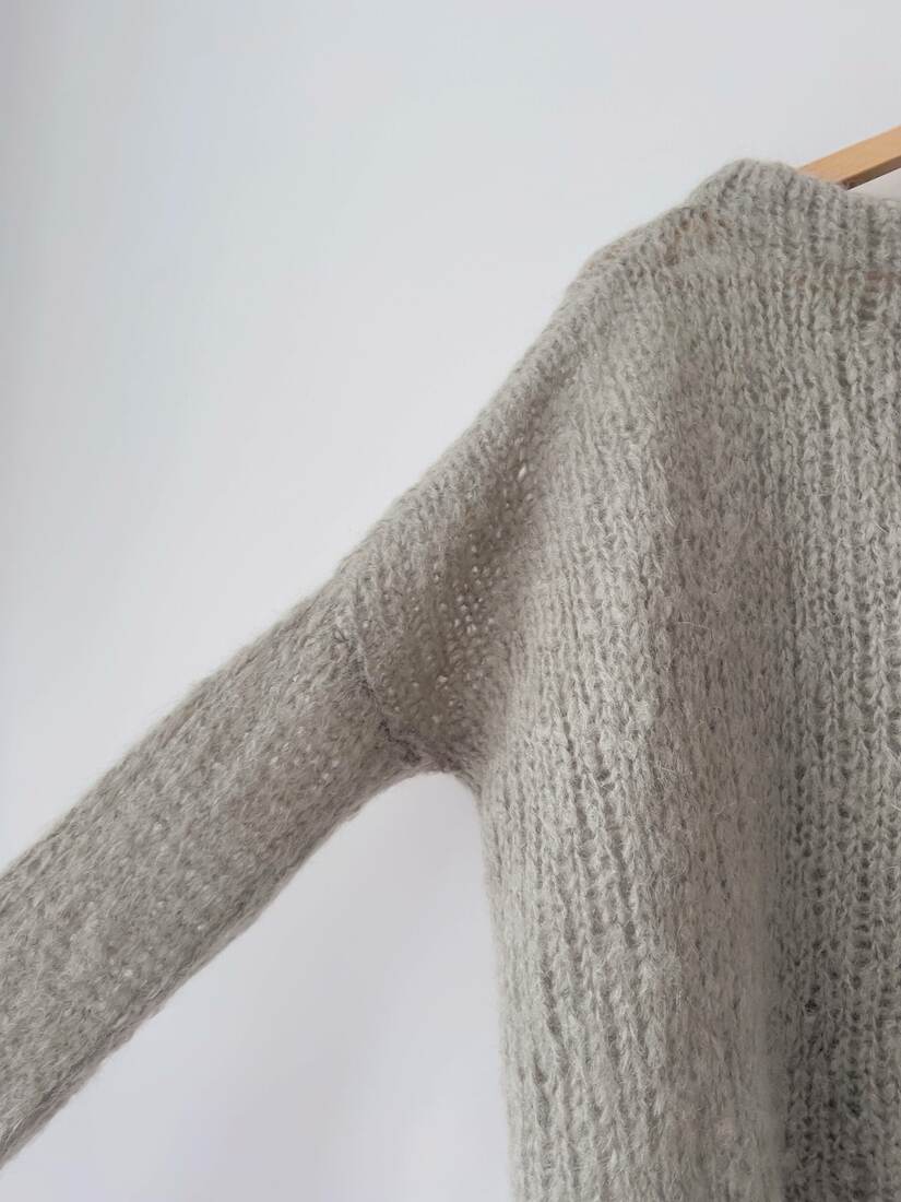 Unikatowy sweter hand made o pudełkowym kroju. Brak metki ze składem, prawdopodobnie jest to mieszanka wełny, moheru oraz poliamidu. Sweter jest bardzo obszerny, jednak ma wąskie rękawy, więc proszę sprawdzić wymiary. Bez wad.