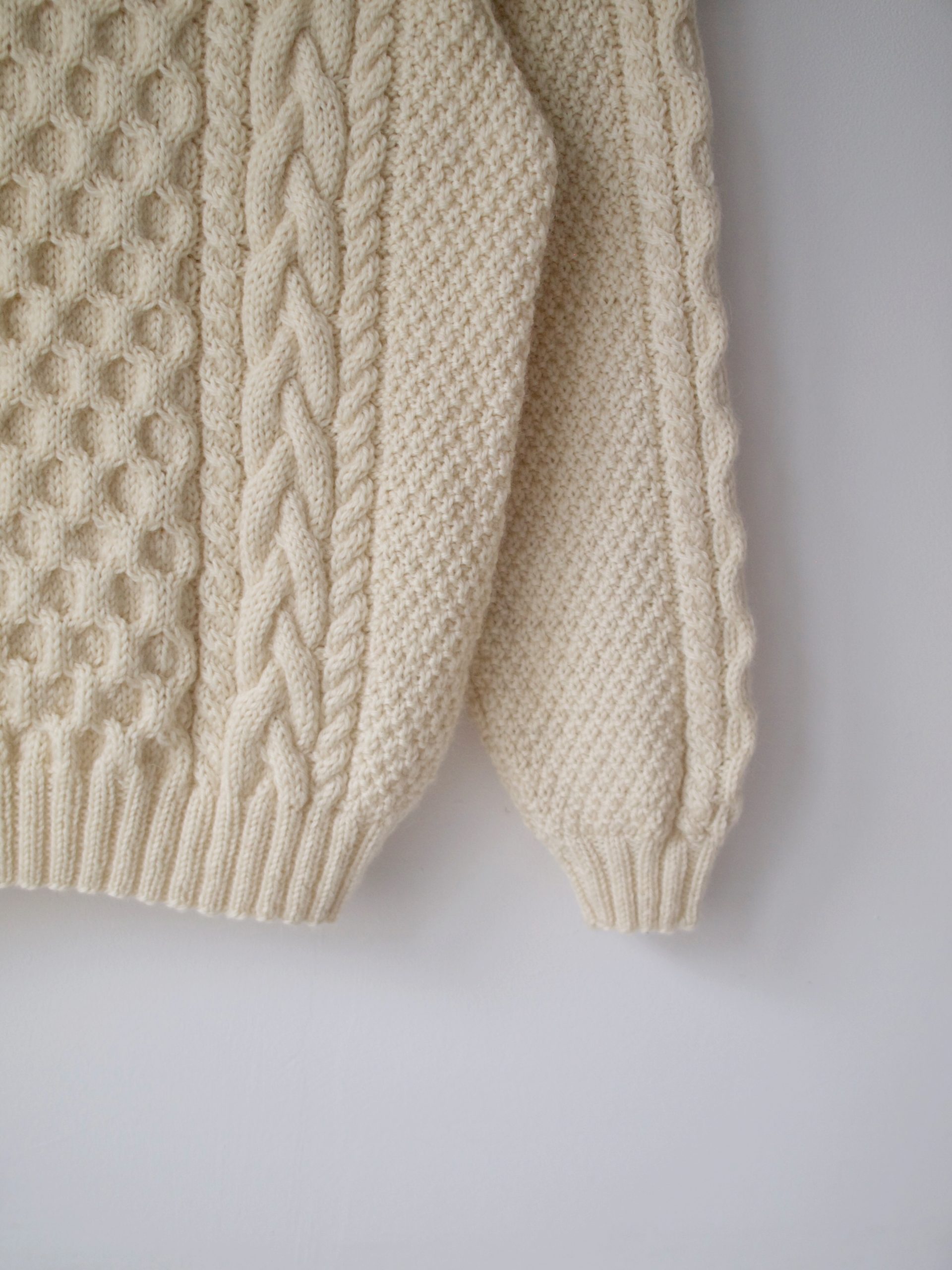 Sweter o warkoczowym splocie, ręcznie robiony z naturalnej wełny. Rozmiar z metki: brak, polecam na XS Skład: brak, 100% welna Stan: bez wad Szerokość w klatce 44 cm Długośćcałkowita 55 cm