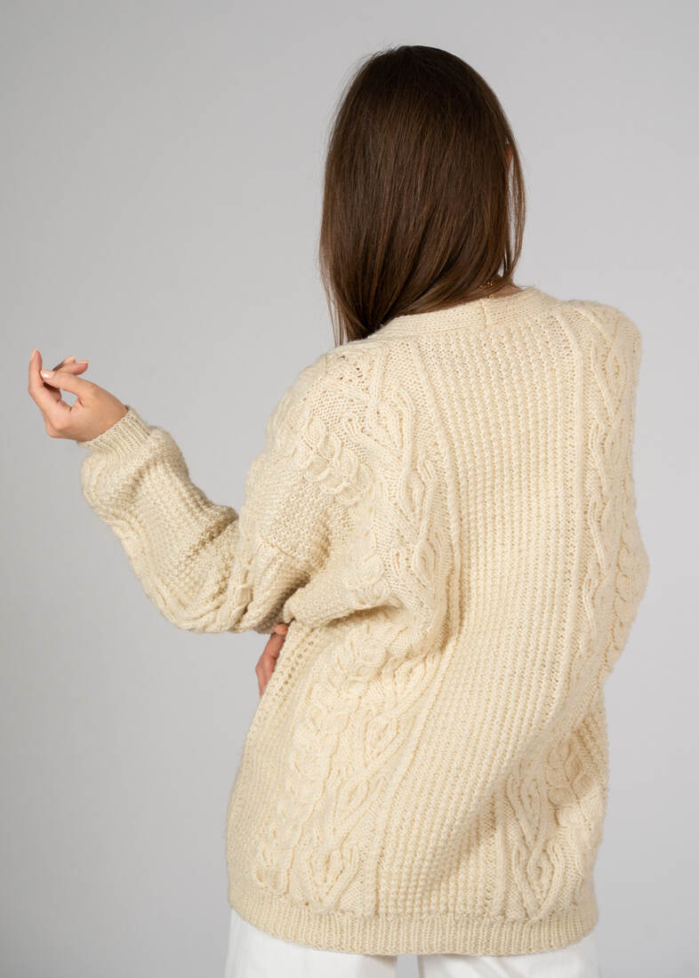 Wełniany sweter hand made. Zapinany na kremowe guziki, z kieszeniami. Ze względu na fason polecam jako one size. Bez wad.