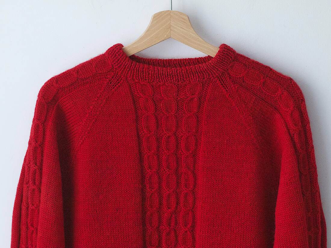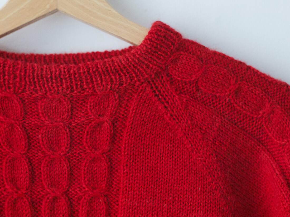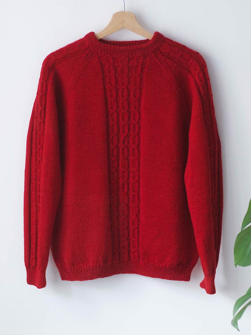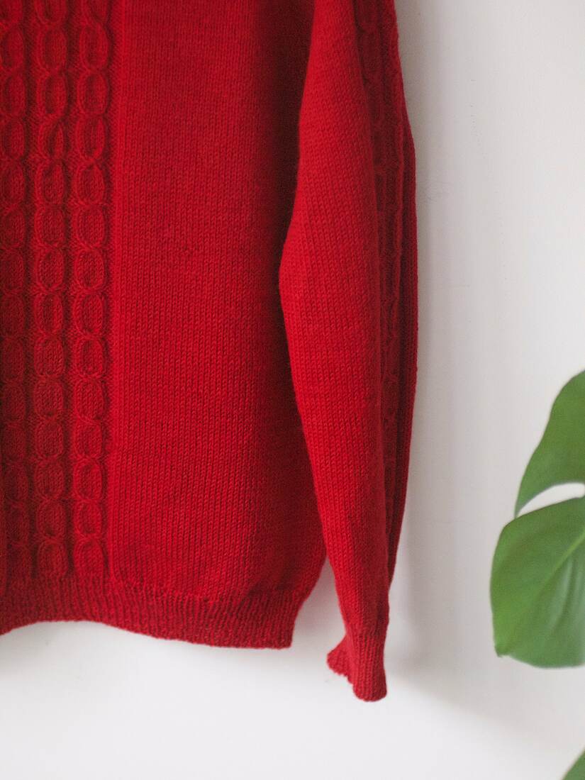 Ciepły, ręcznie robiony sweter z warkoczami. Brak metki ze składem, jest to wełna lub mieszanka z wełną. Na jednym rękawie mała skaza, poza tym brak mankamentów.