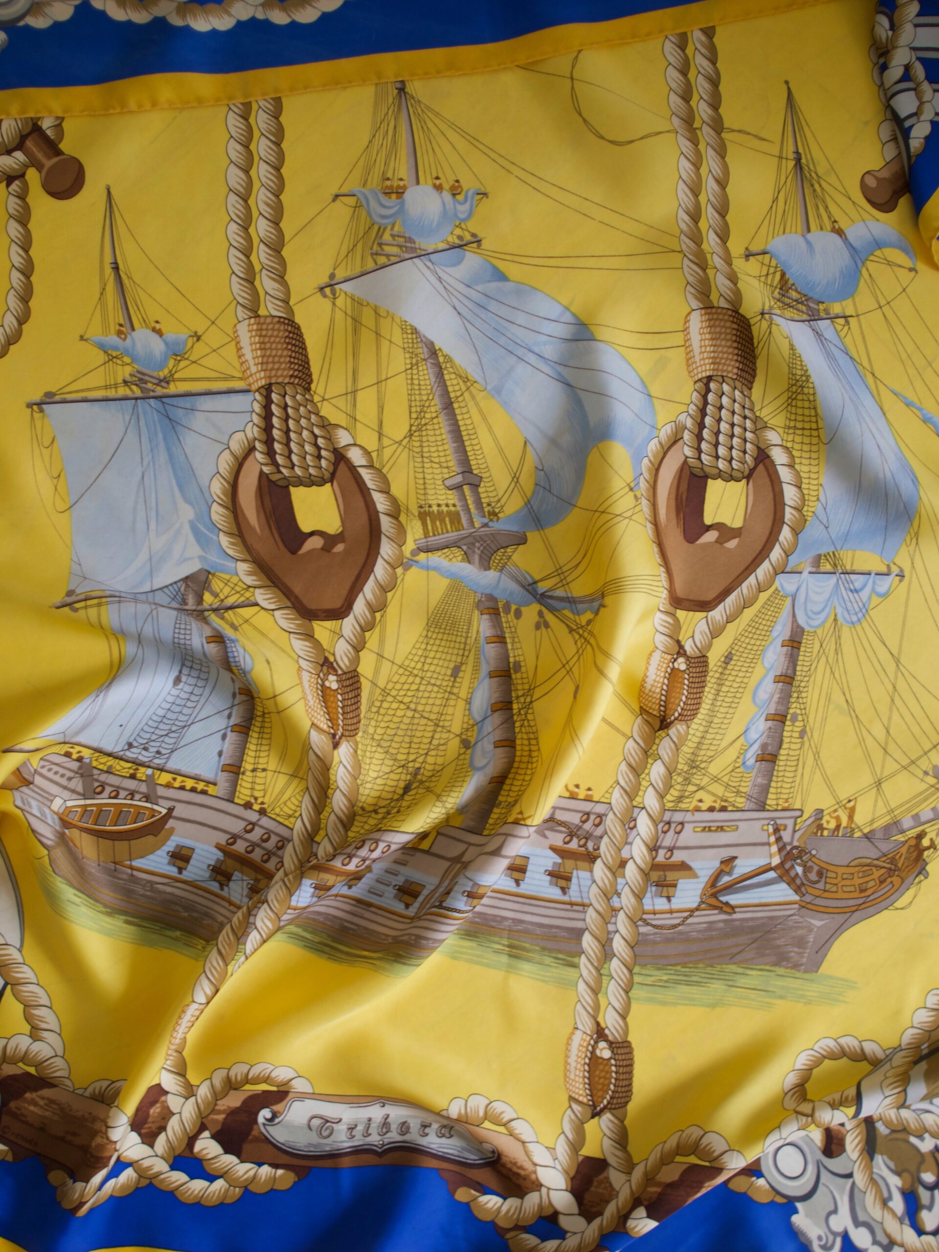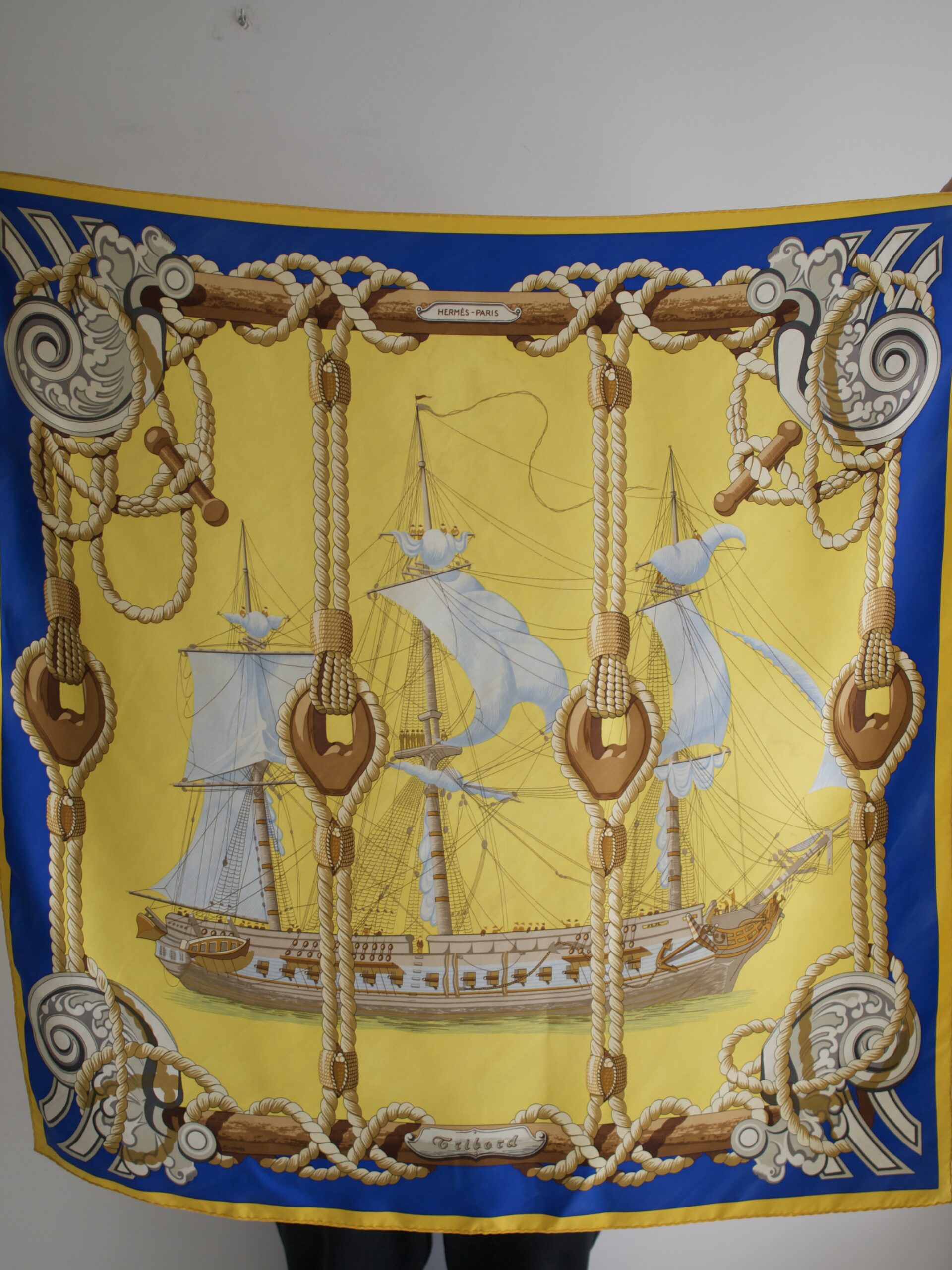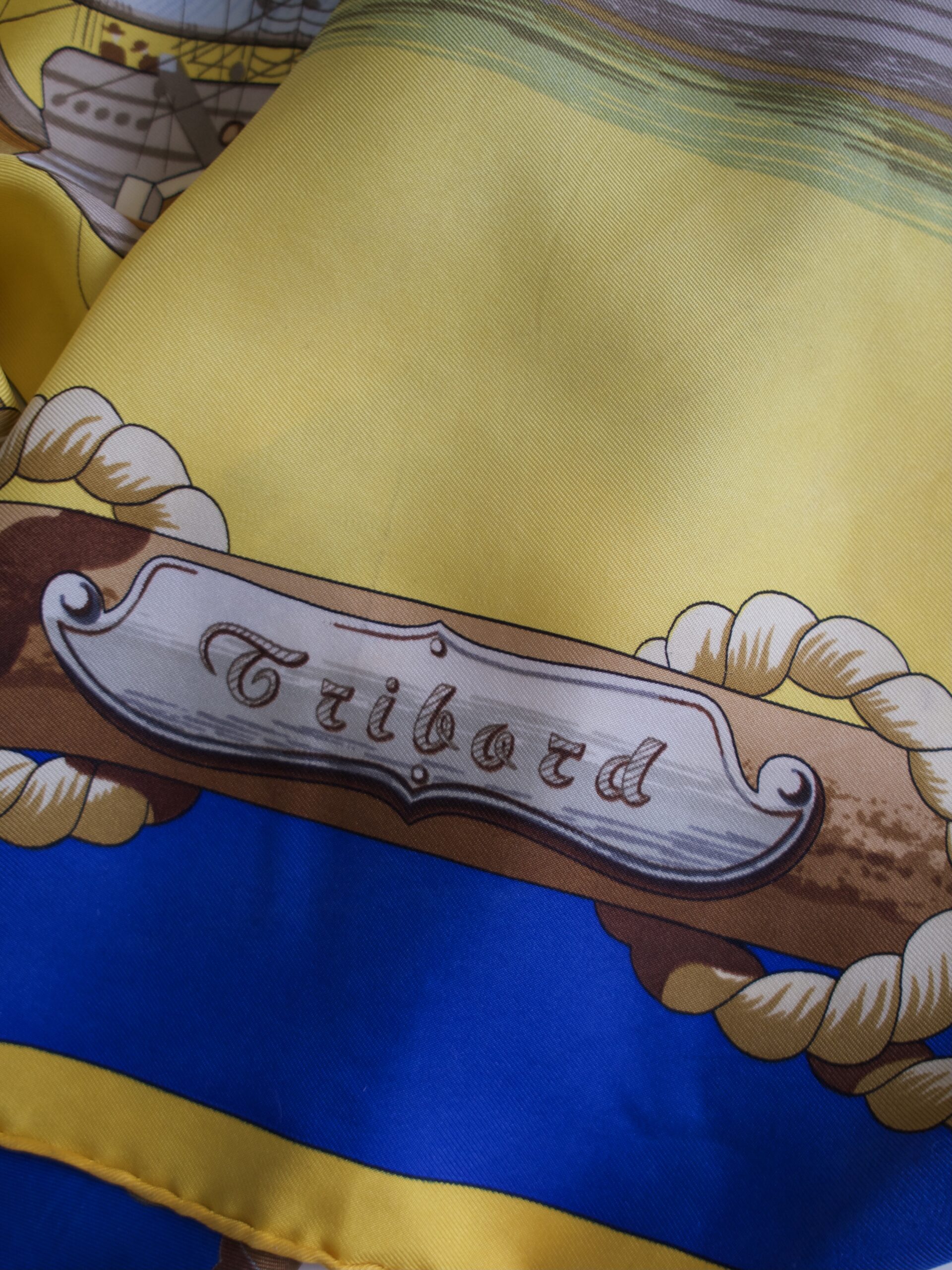 Duża jedwabna chusta Carré domu mody Hermès. Model „Tribord” autorstwa Julia Abadie, pierwsza edycja pojawiła się w 1968 roku. W górnej środkowej części oraz na dole obok nazwy jest logo marki, w dolnym prawym rogu imię autorki ukryte we wzorach. Materiał to gruby jedwab twill, chusta jest ręcznie rolowana. Brak metki ze składem. Chusta w niektórych miejscach posiada zacieki oraz rysy, prawdopodobnie powstałe w skutek nieodpowiedniego prania. Są pokazane na zdjęciach. Nie są widoczne w noszeniu na szyi. Poza tym bardzo dobry stan, kolory są nasycone, a materiał bez dziur, przetarć czy zaciągnięć.