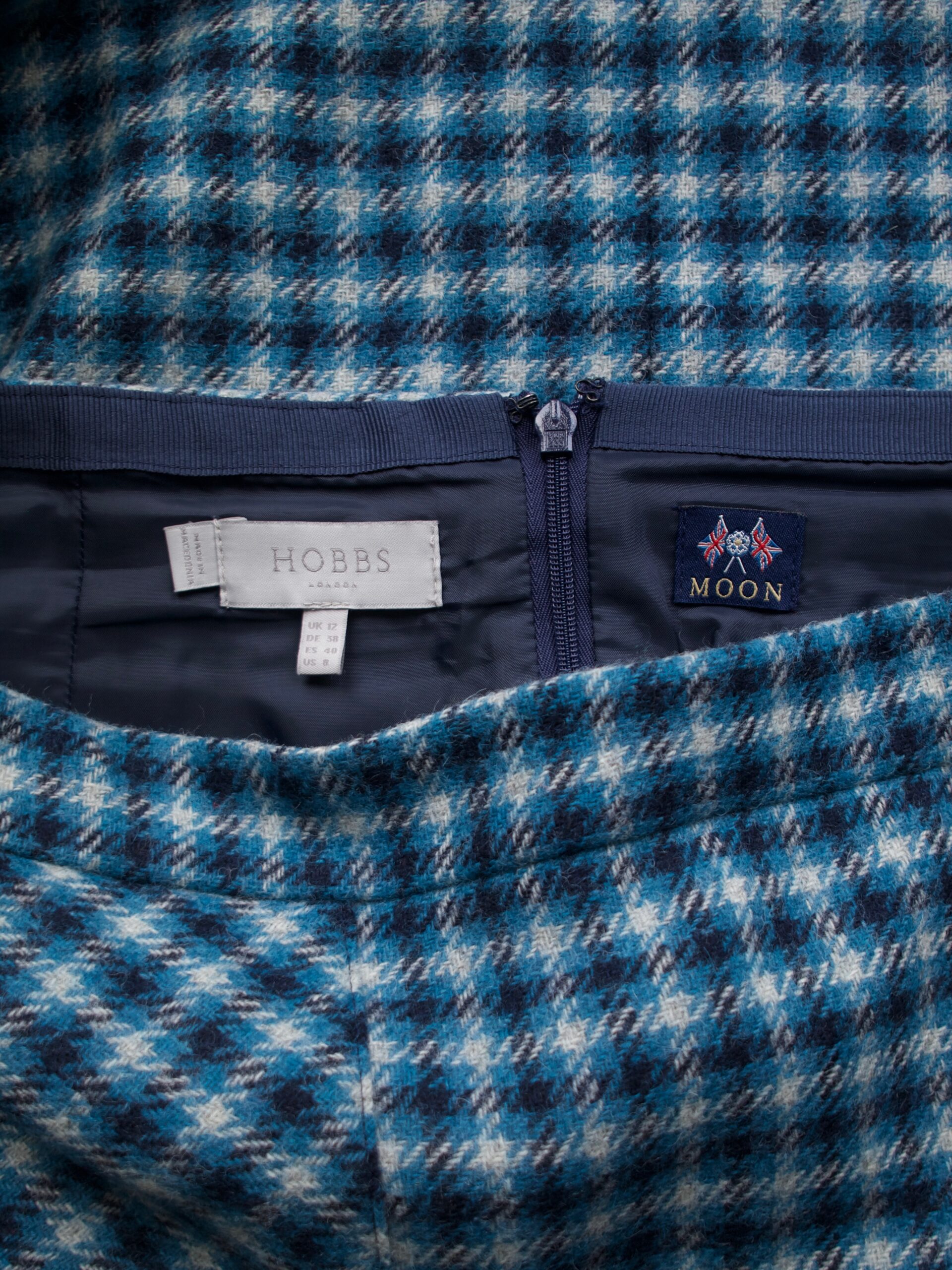 Wymiary spodni: szerokość w pasie 35 cm, szerokość w biodrach 50 cm, długość nogawki od kroku 71 cm, długość całkowita 96 cm. Wymiary marynarki: szerokość w ramionach 37,5, szerokość w klatce 46 cm, długość całkowita 76 cm.