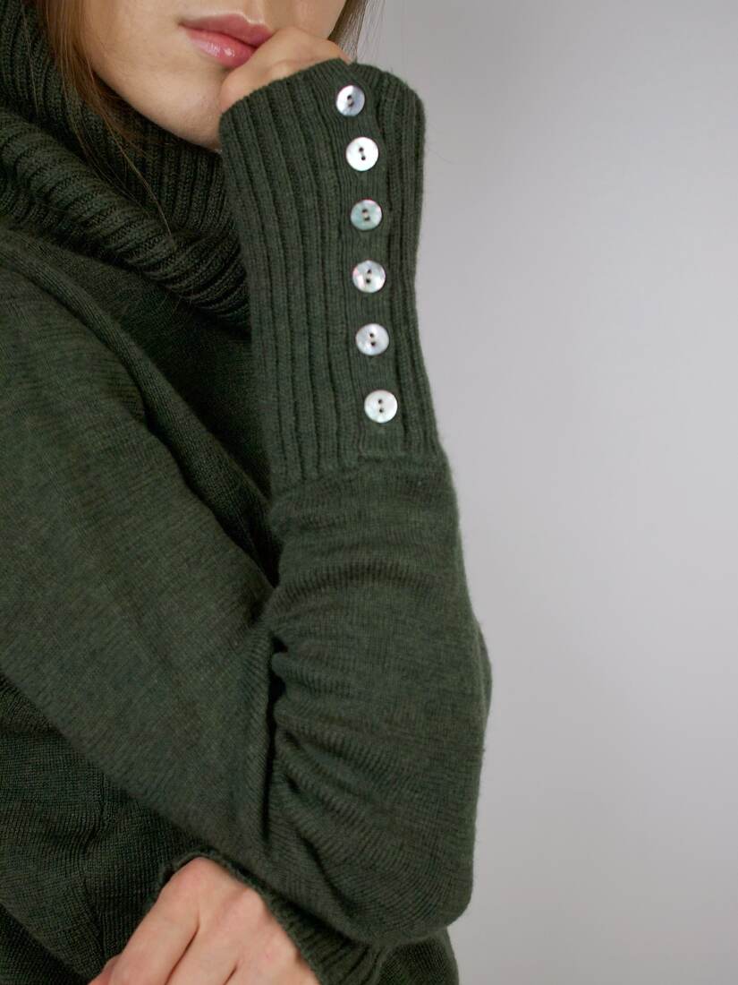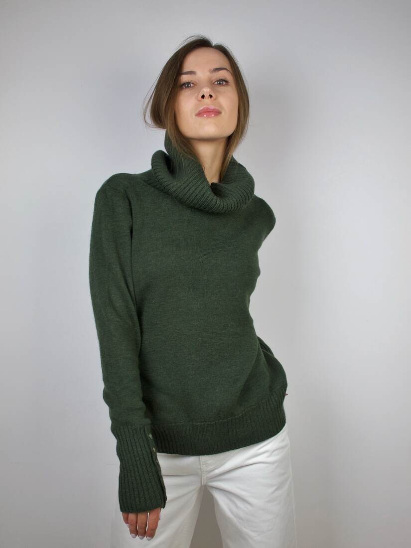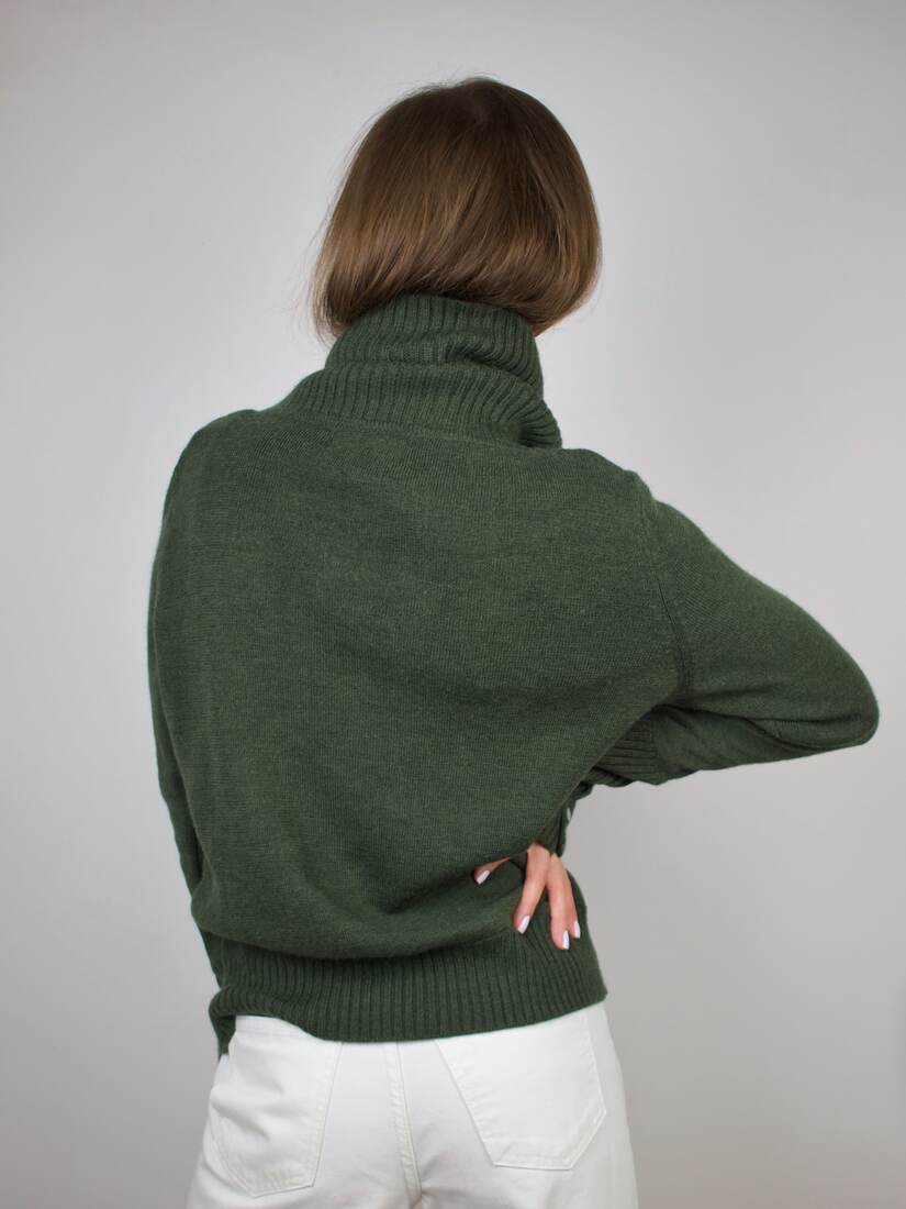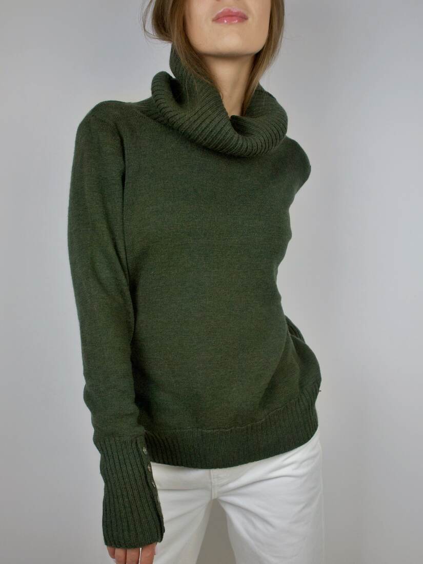 Sweter vintage z dużym golfem i ozdobnymi guzikami na rękawach. W 100% wykonany z wełny. Rozmiar z metki L, bez wad.