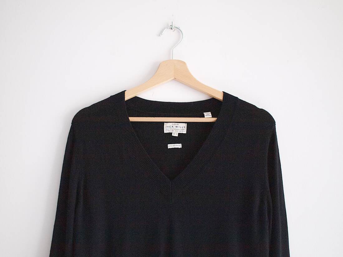 Sweter brytyjskiej marki Jack Wills, w 100% wykonany z cienkiej wełny merynosa. Większe wcięcie w kształcie litery V, dół i rękawy wykończone ściągaczem. Rozmiar z metki UK 6, polecam na M-mniejsze L, albo dla XS-S jako oversize. Bez wad.