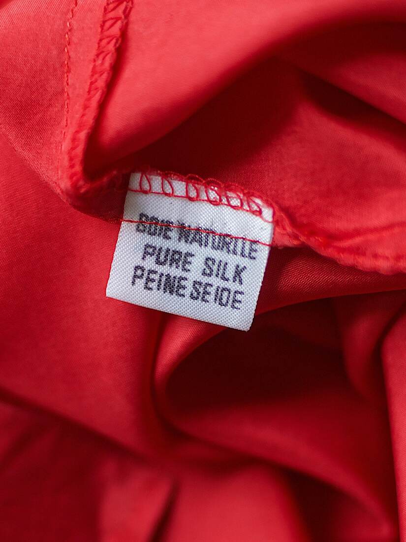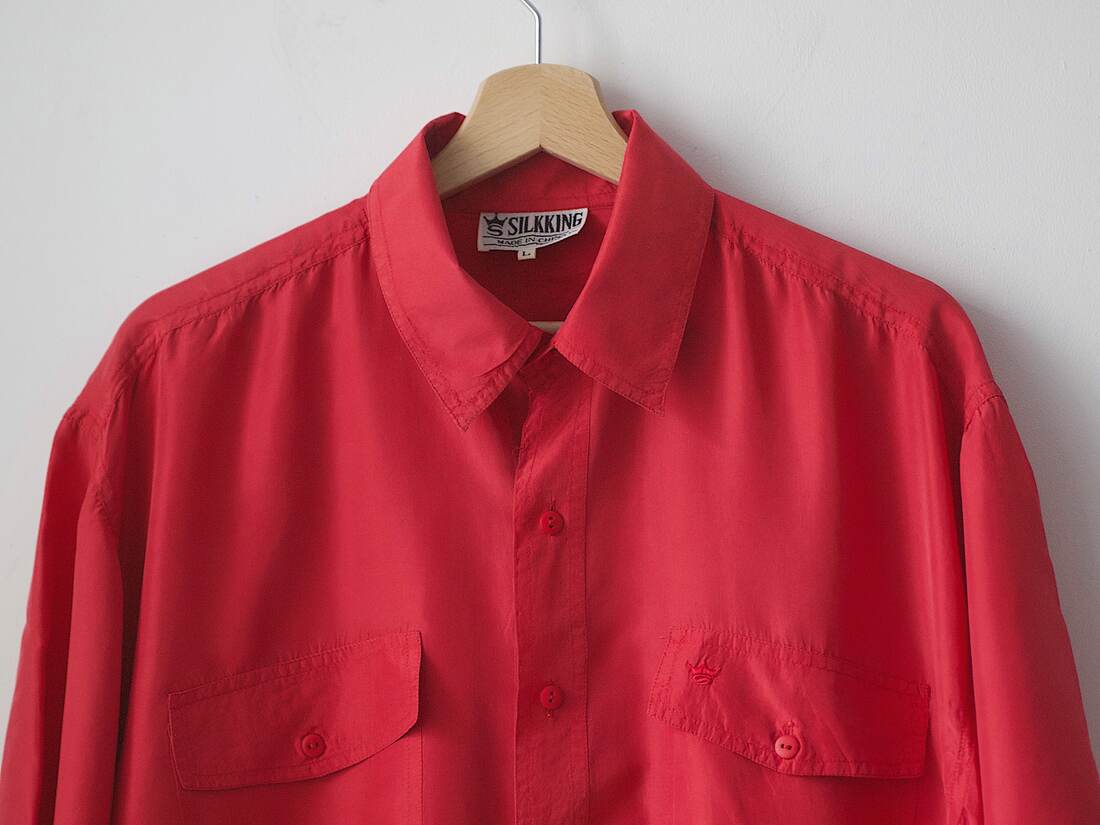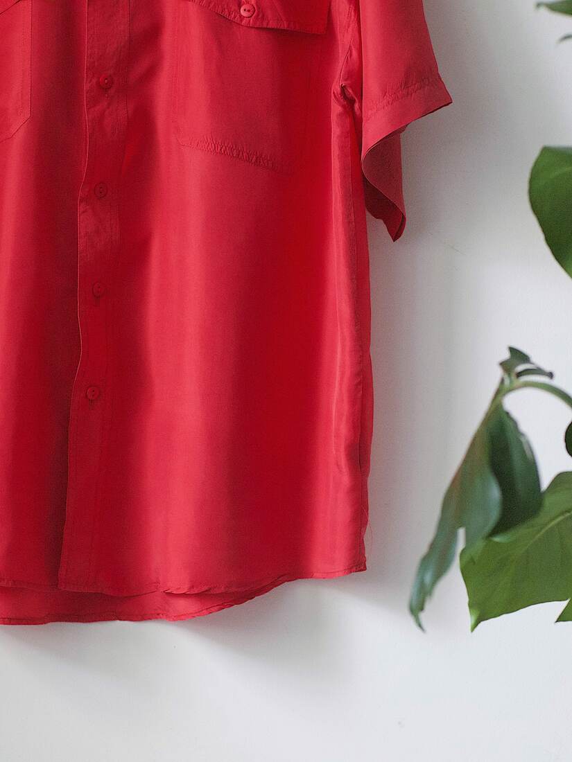 Jedwabna koszula vintage w nasyconym kolorze. Rozmiar z metki L, bardzo dobry stan. Koszula ma ślady prania, charakterystyczne dla jedwabiu, nie są bardzo widoczne w noszeniu.