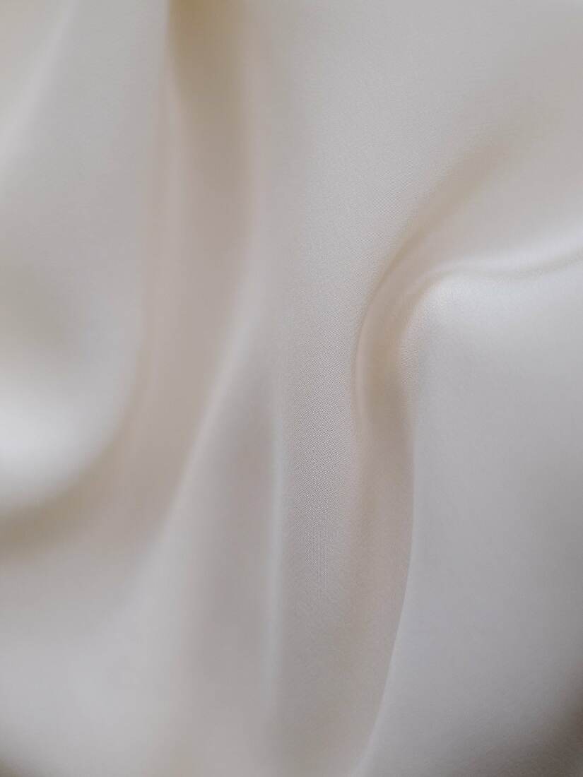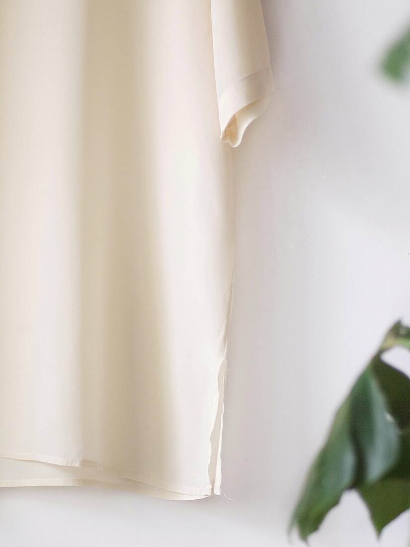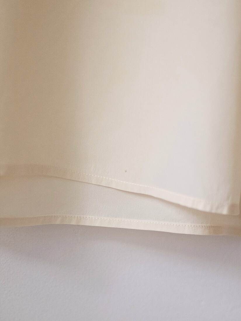 Minimalistyczna jedwabna bluzka w kremowym kolorze. Obszerny pudełkowy krój, z tyłu zapięcie na jeden guzik. Na dole milimetrowa dziureczka, pokazana na ostatnim zdjęciu, nie widoczna w noszeniu. Wycięta metka z rozmiarem, polecam jako one size.