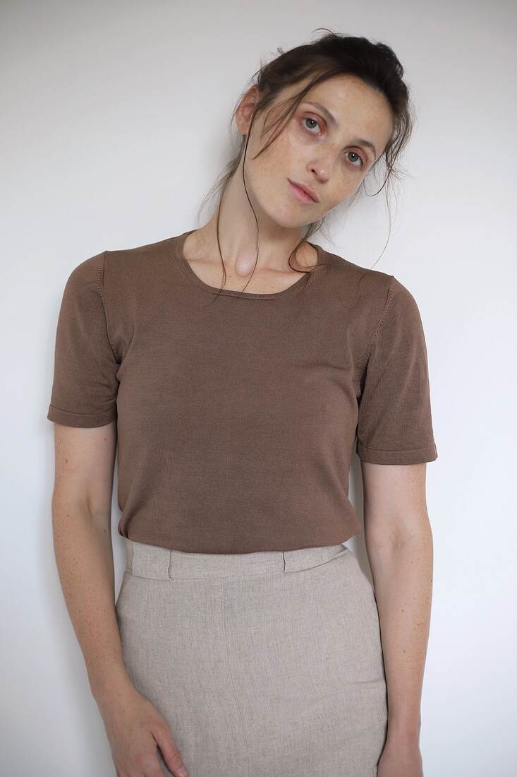 Skład: 80% jedwab, 17% poliamid, 3% lycra. Modelka nosi rozmiar S.