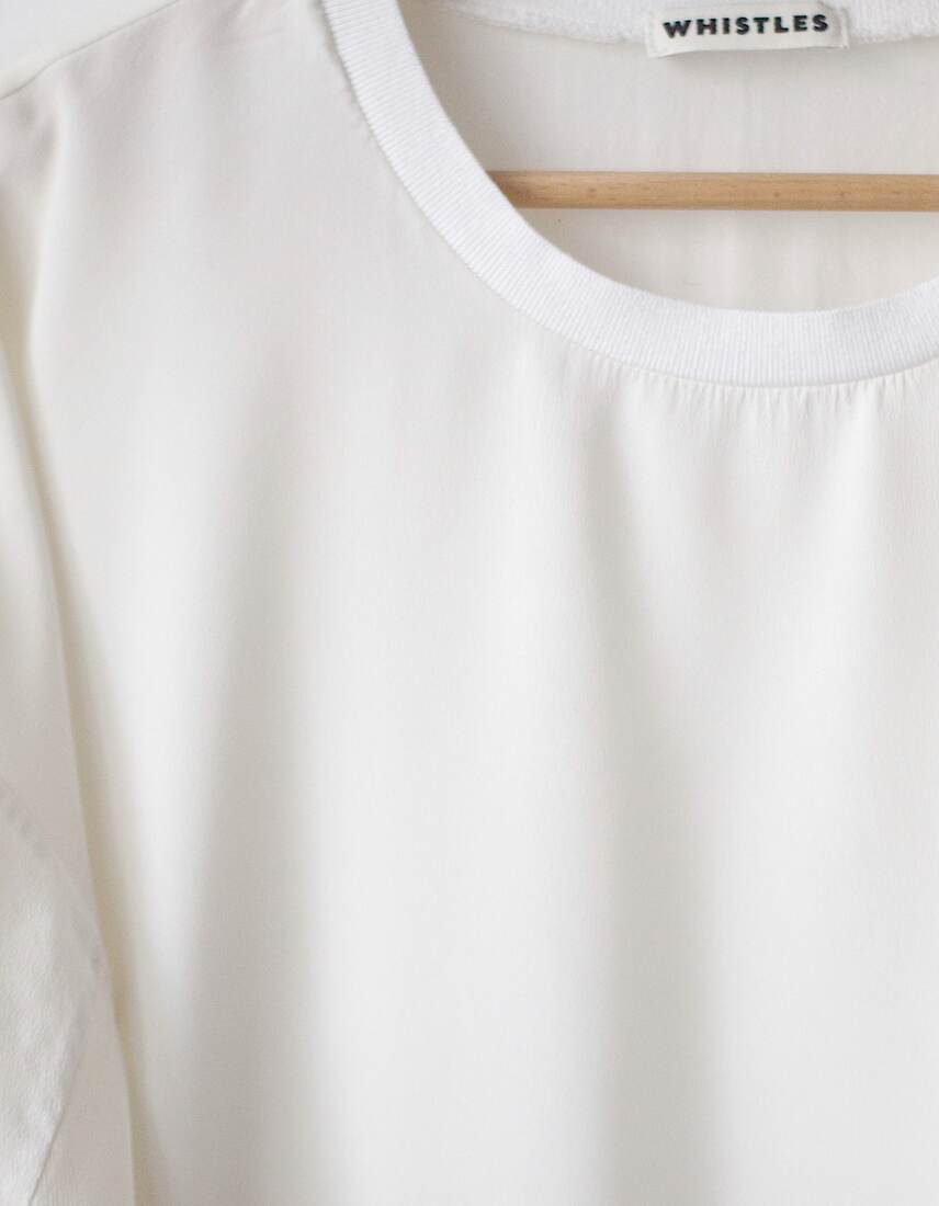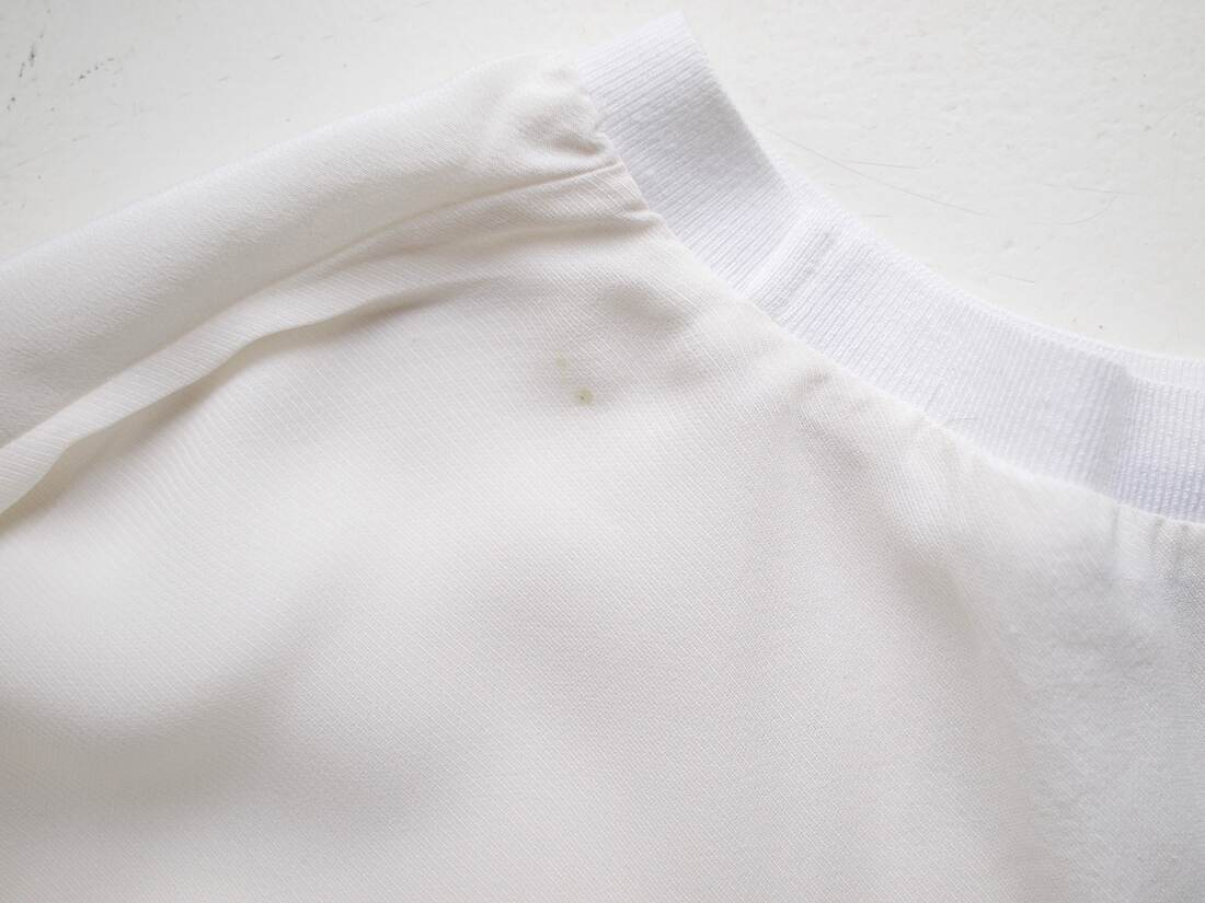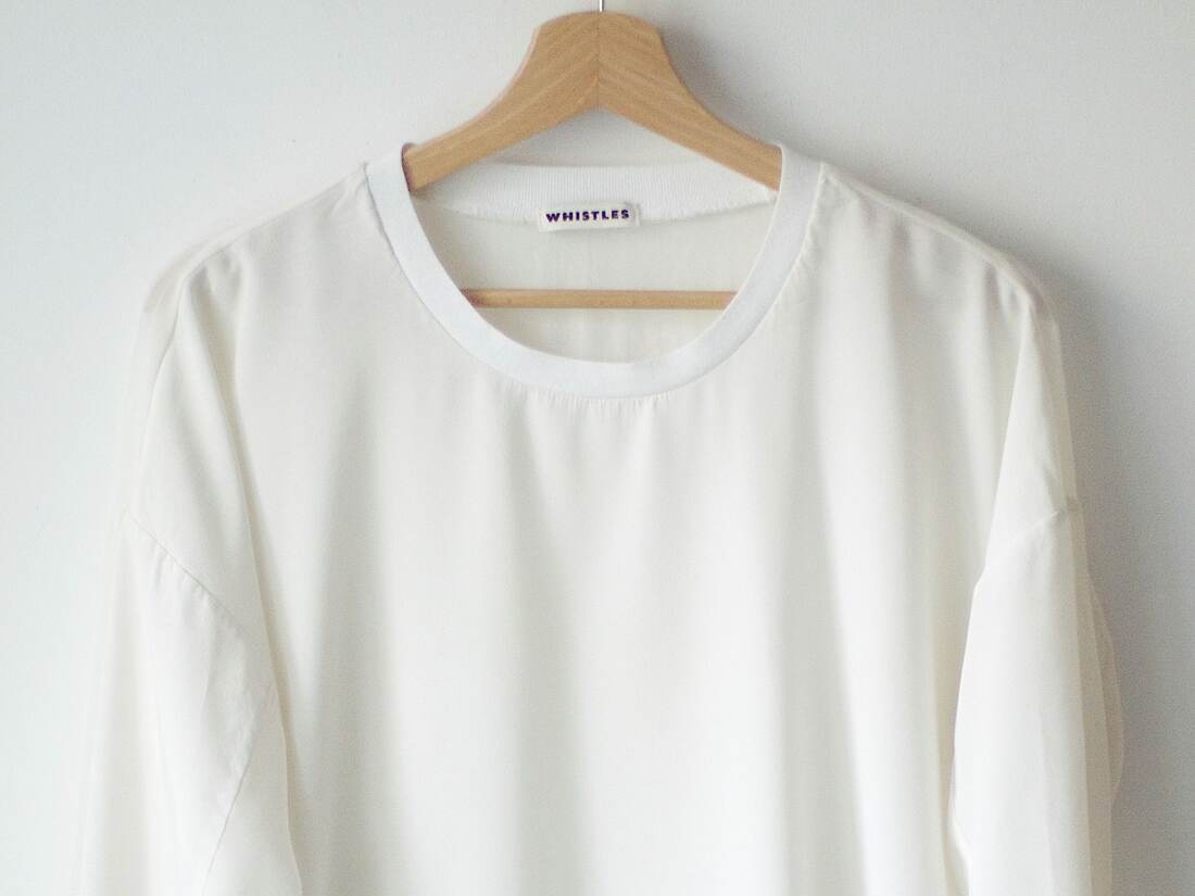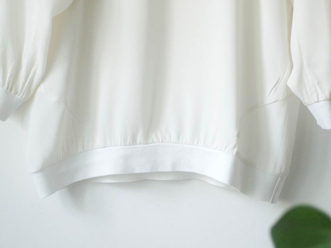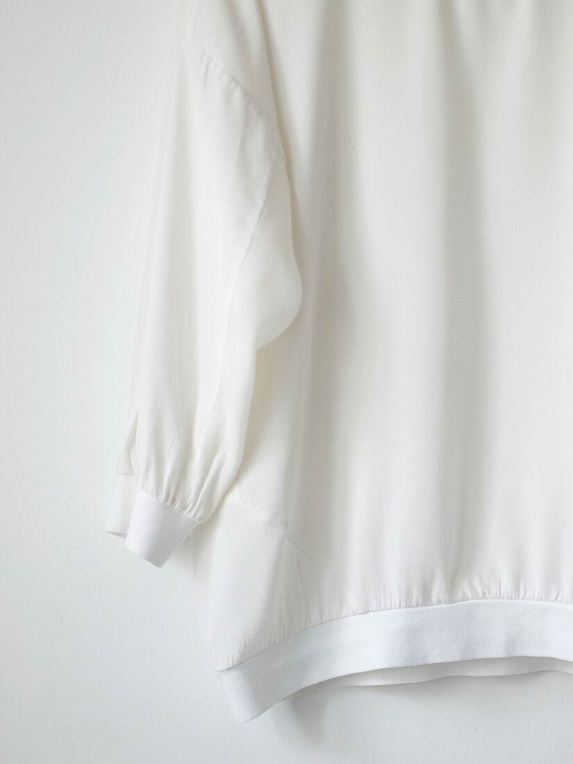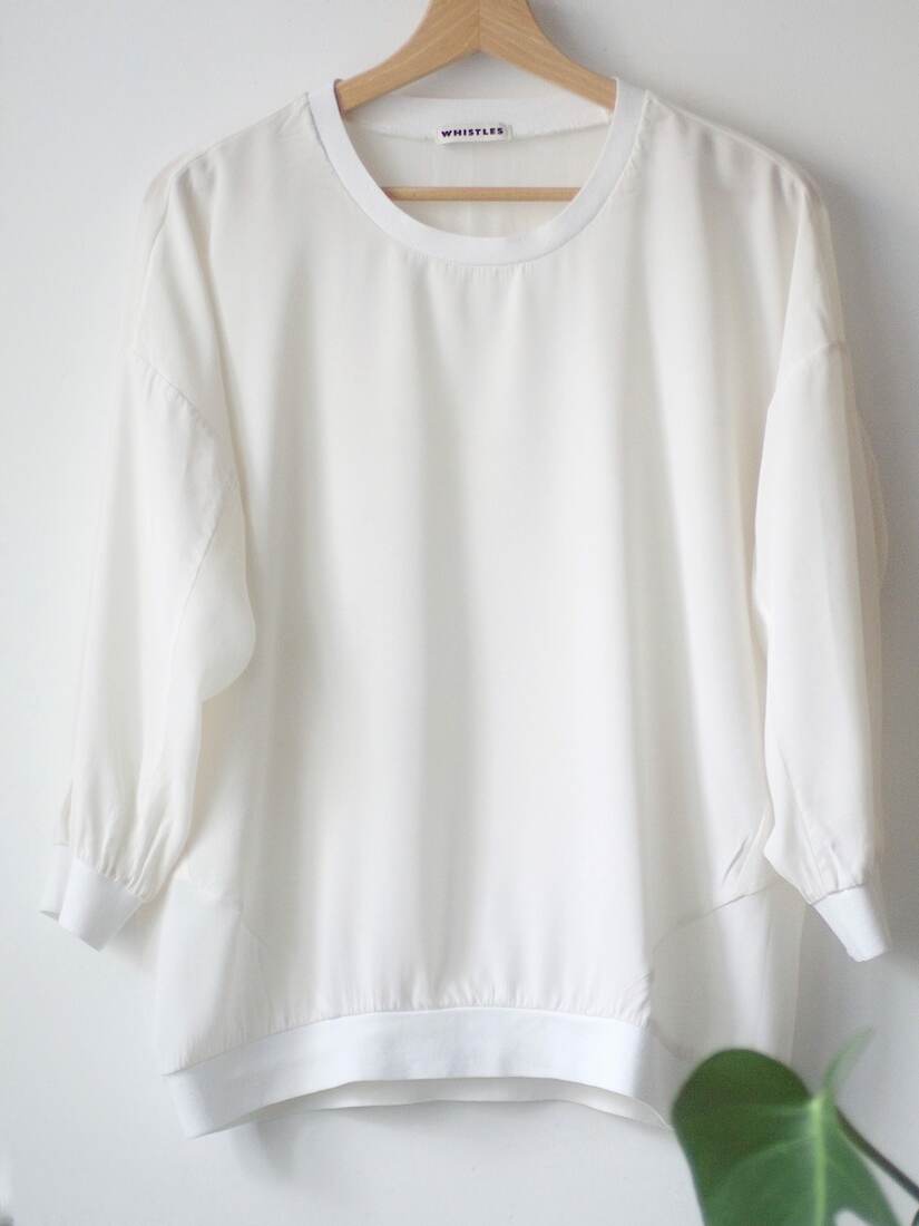 Jedwabna bluzka z kontrastowym wykończeniem. Z tyłu przy górnym ściągaczu ma małą plamkę, poza tym brak wad. Fason oversize, rękaw 3/4 (a’la nietoperz), rozmiar z metki 38.
