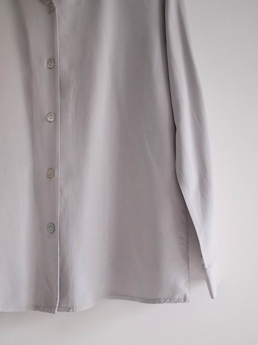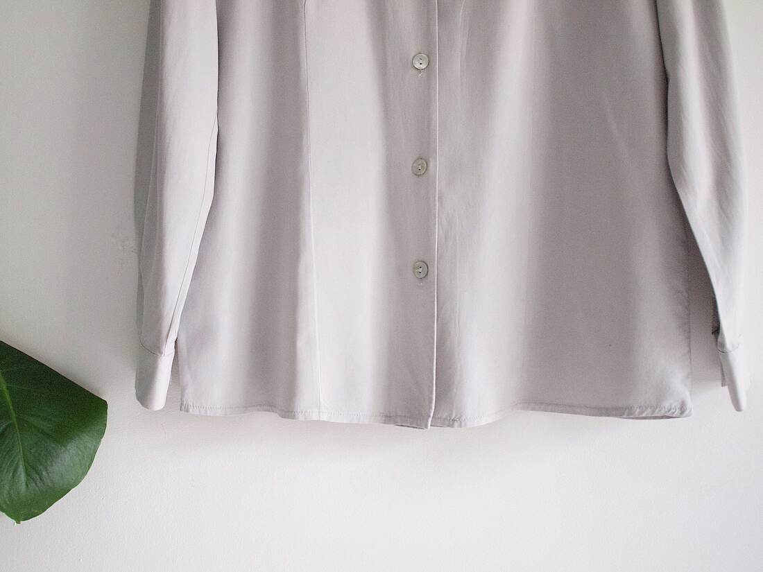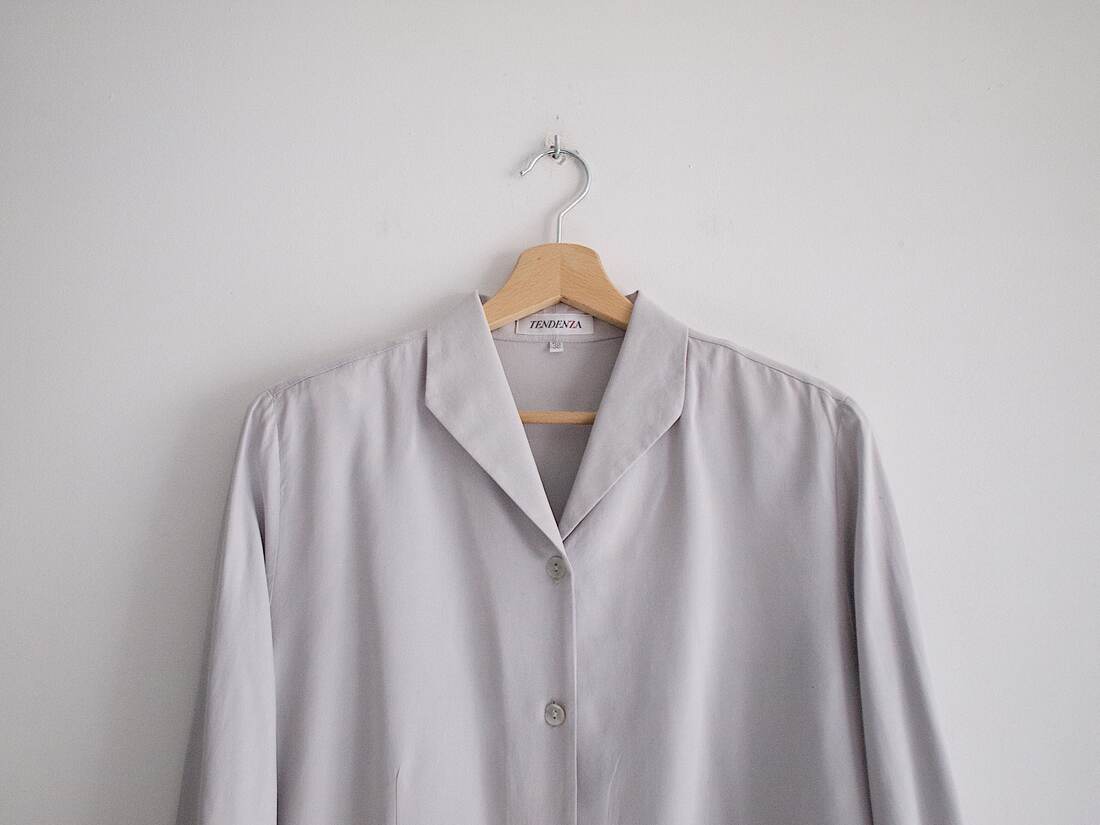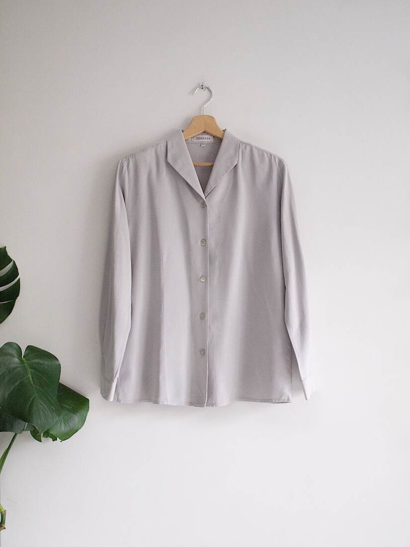 Jedwabna koszula vintage w kolorze pastelowej szarości. Wykonana z matowego, porządnego jedwabiu, zapinana na guziki z muszli naturalnej. Rozmiar z metki 38, dość luźna, bez wad.