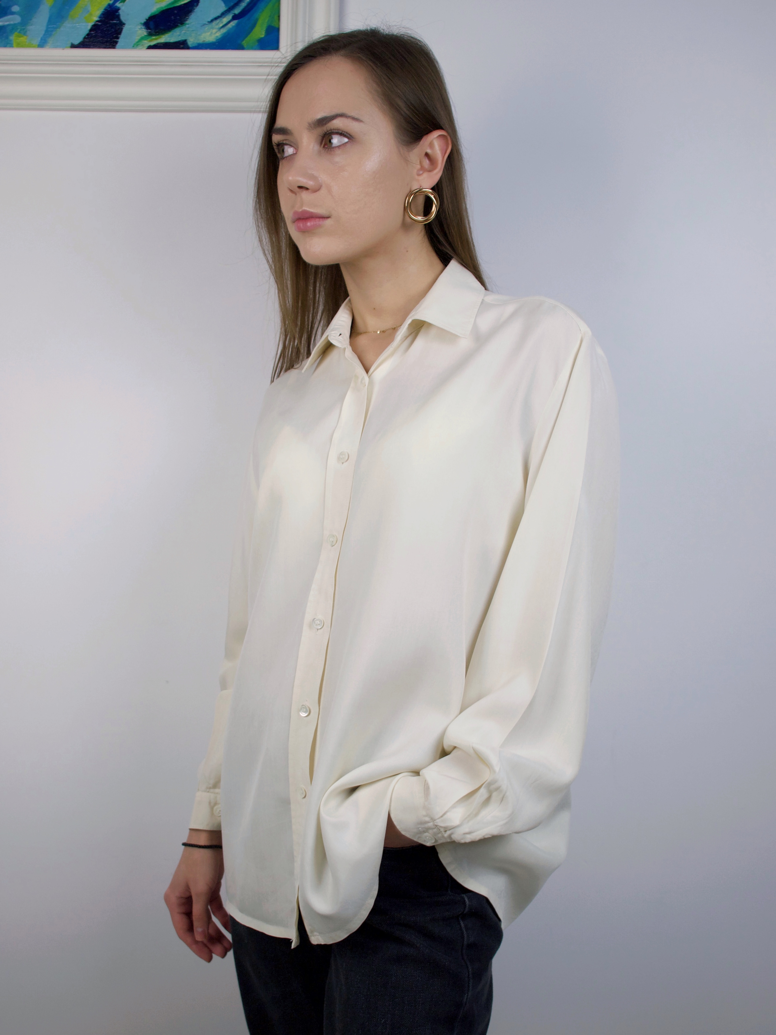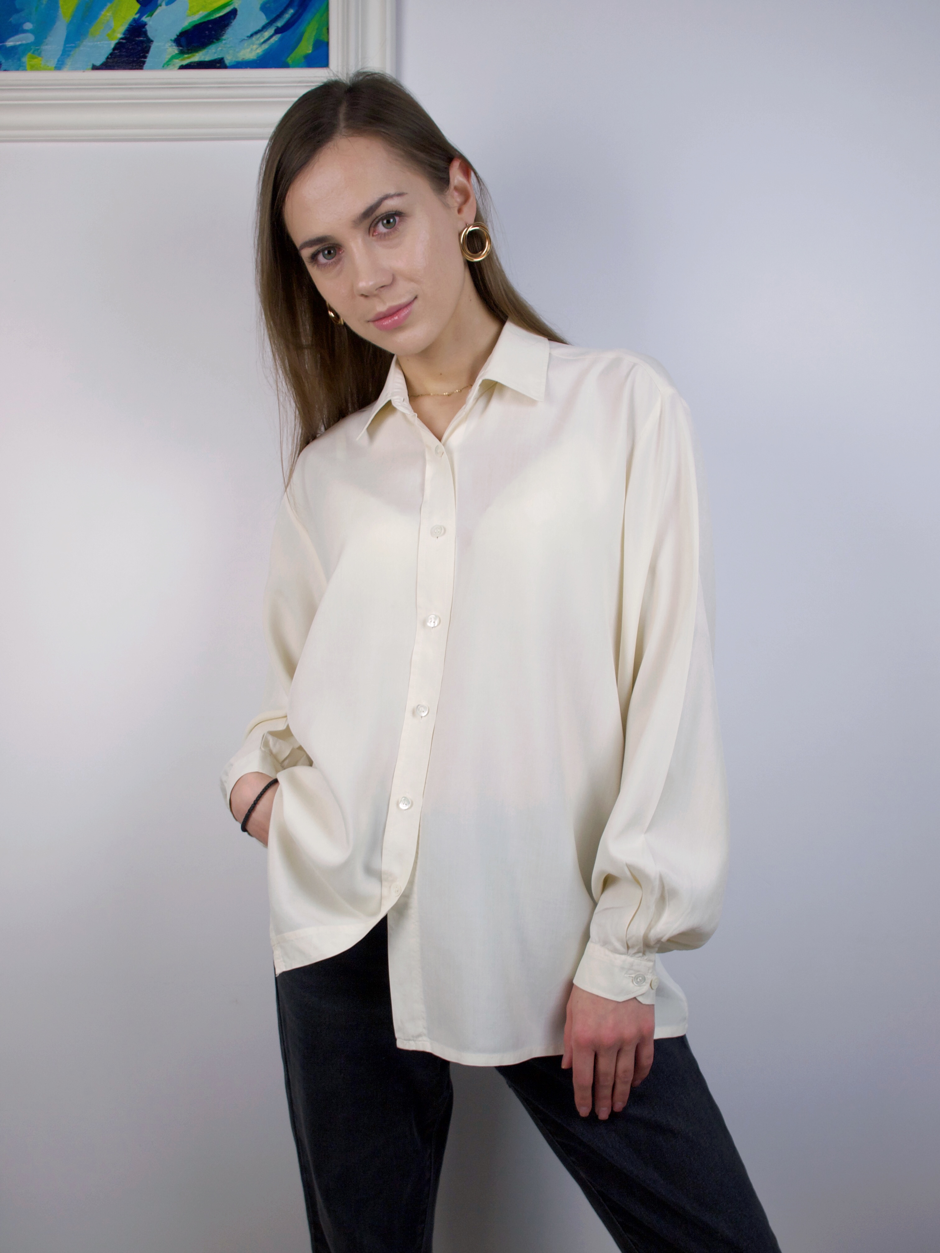Koszula vintage w 100% wykonana z jedwabiu. Materiał jest grubszy, matowy. Polecam na M-L, lub jako oversize. Bardzo dobry stan. Modelka ma 165 cm wzrostu i nosi rozmiar XS-S.