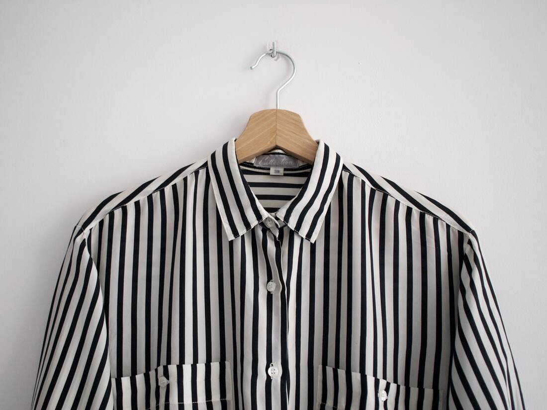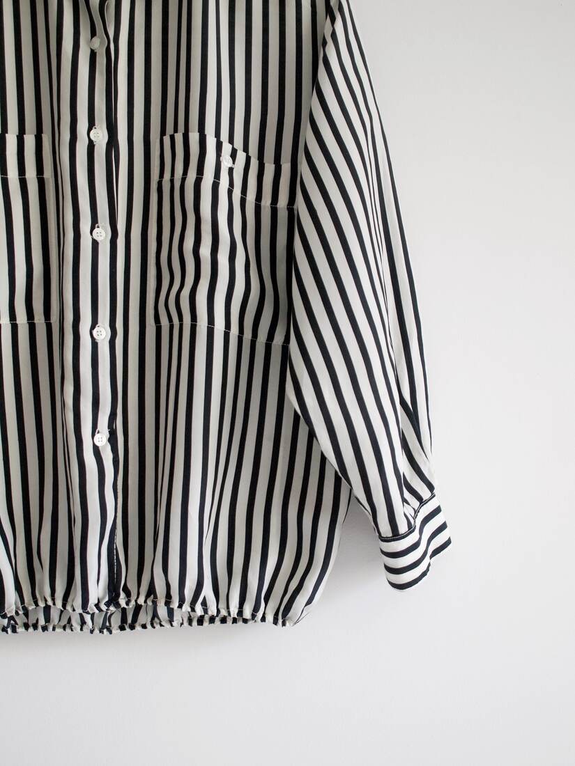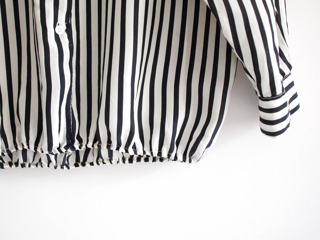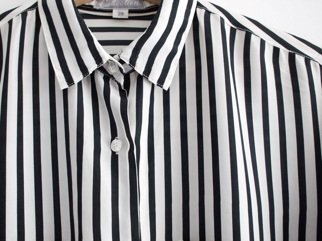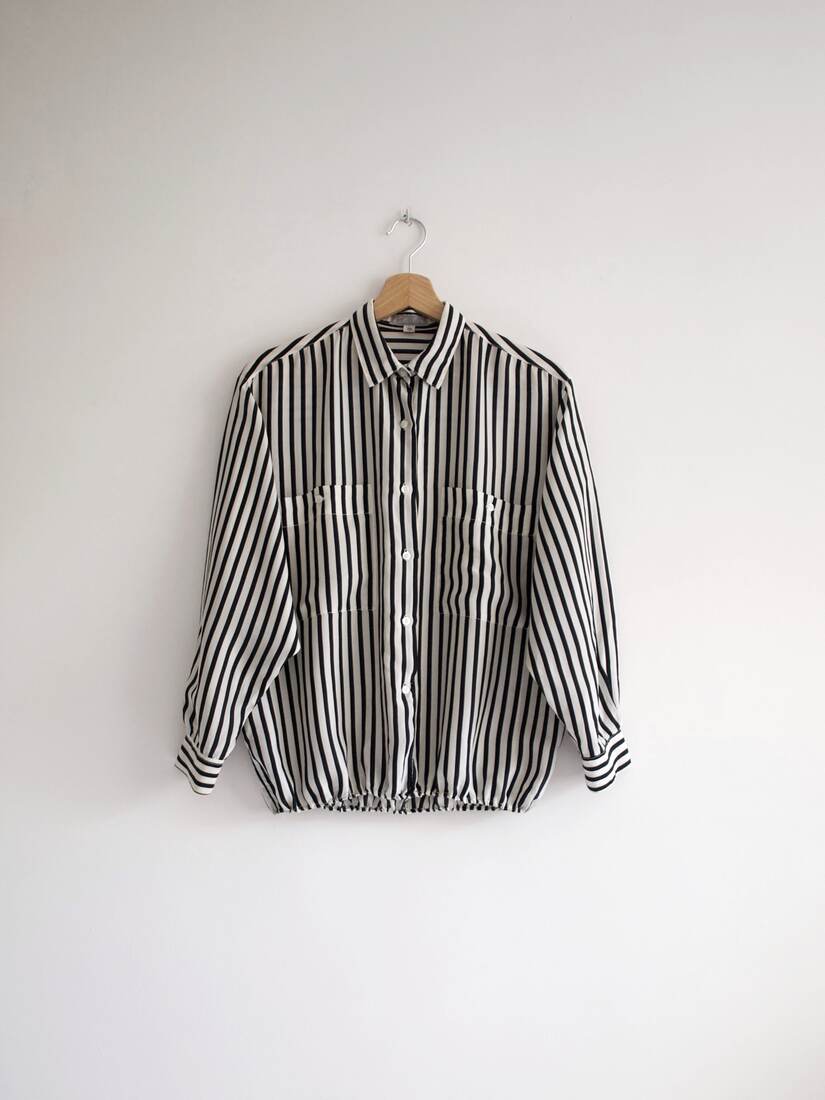 Jedwabna koszula vintage. Na dole wszyta gumka. Mało widoczne wady na kołnierzu, pokazane na zdjęciu, poza tym bardzo dobry stan. Rozmiar z metki 38, dość luźna.