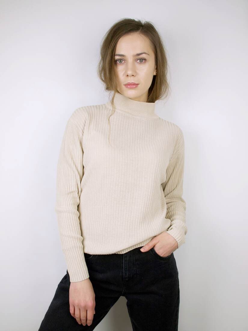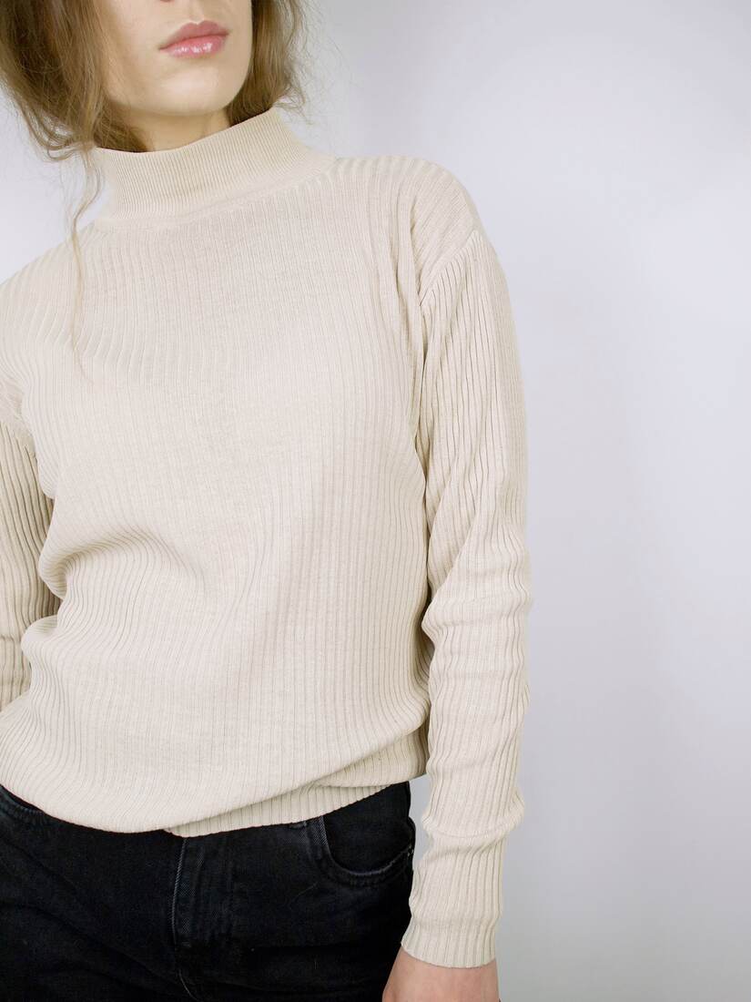 Minimalistyczny kremowy golf wykonany w 100% z wełny merynosa. Materiał przyjemny w dotyku, nie gryzie, sweter bez wad. Rozmiar z metki S, wymiary poniżej.