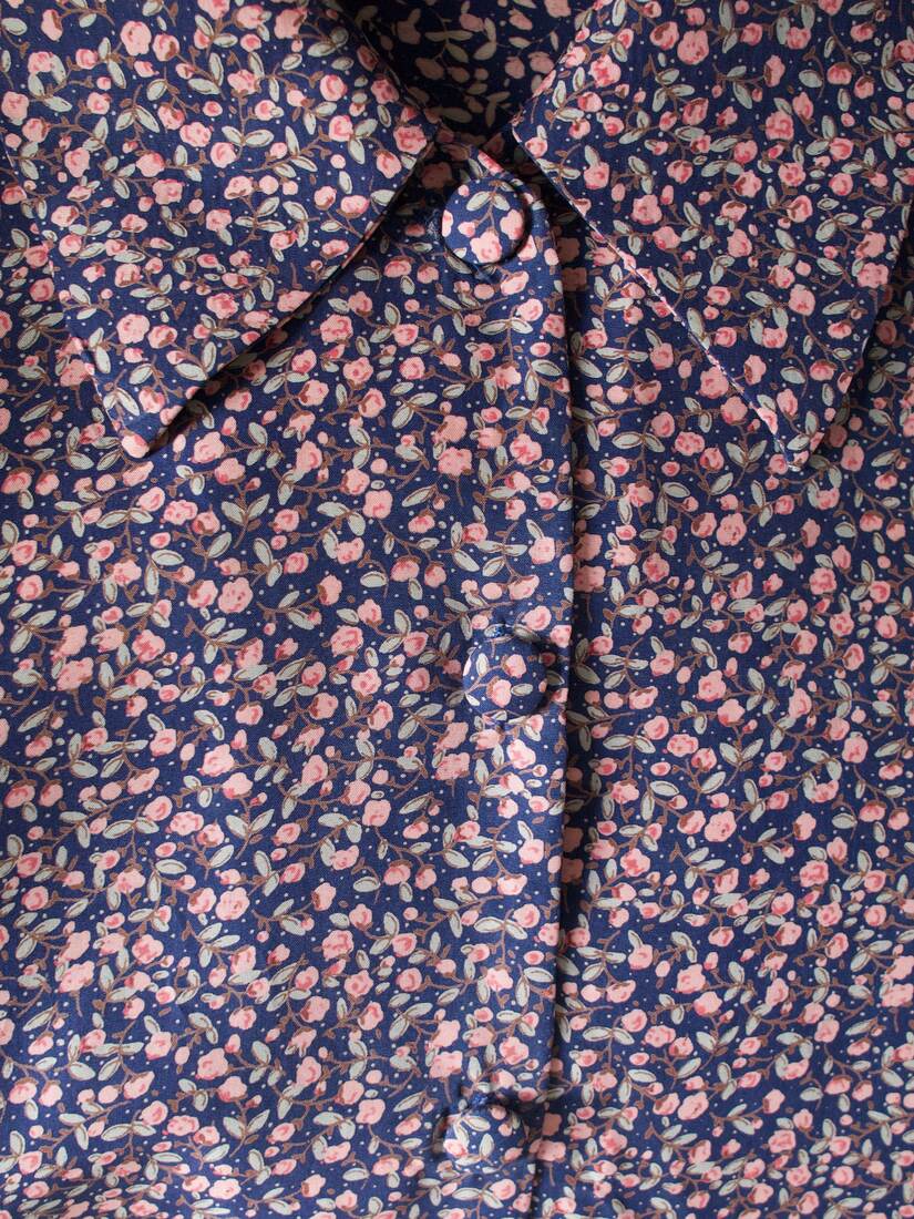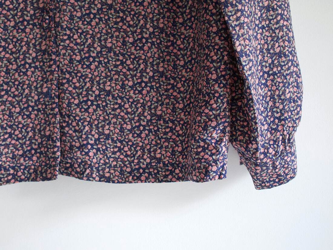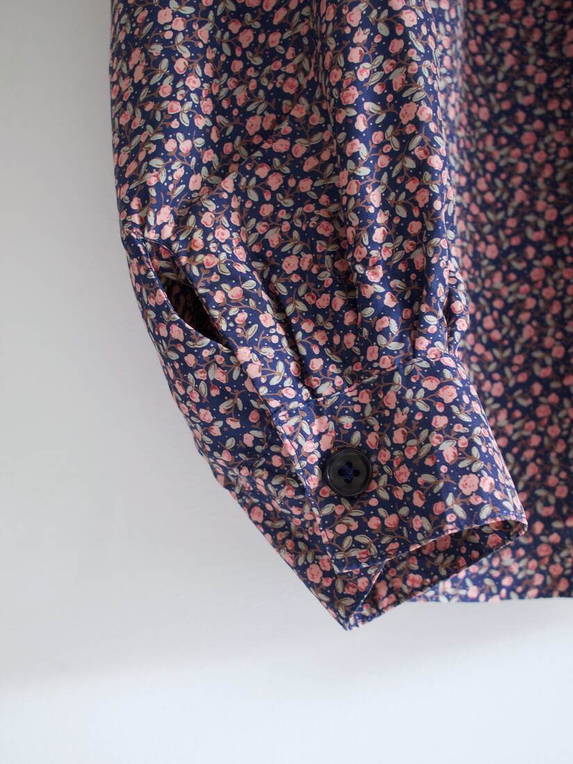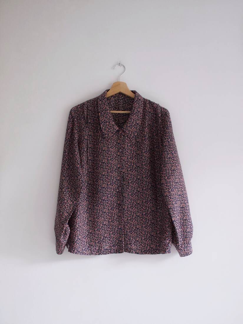 Koszula vintage we wzory. Brak metki ze składem, jest to ma 100% gładki jedwab, potwierdzone testem ognia. Zapinana na guziki powlekane materiałem. Na jednym rękawie brakuje oryginalnego guzika, poza tym bez wad.