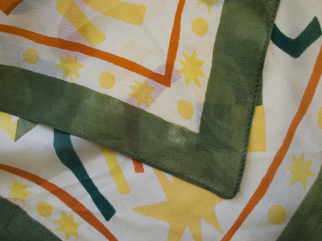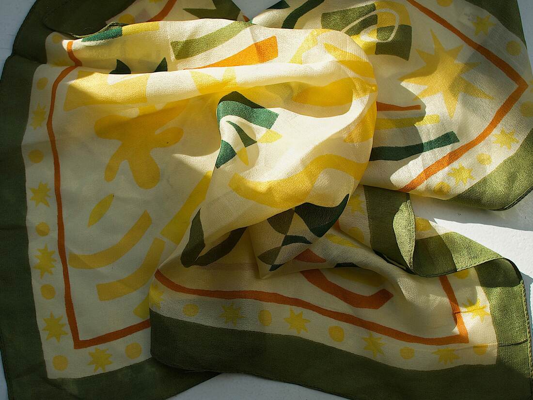 Jedwabna apaszka w abstrakcyjny wzór. Nowa bez metek, ma mała wadę farbowania, pokazaną na zdjęciach, nie widoczną w noszeniu. Wymiary: 52*52 cm.