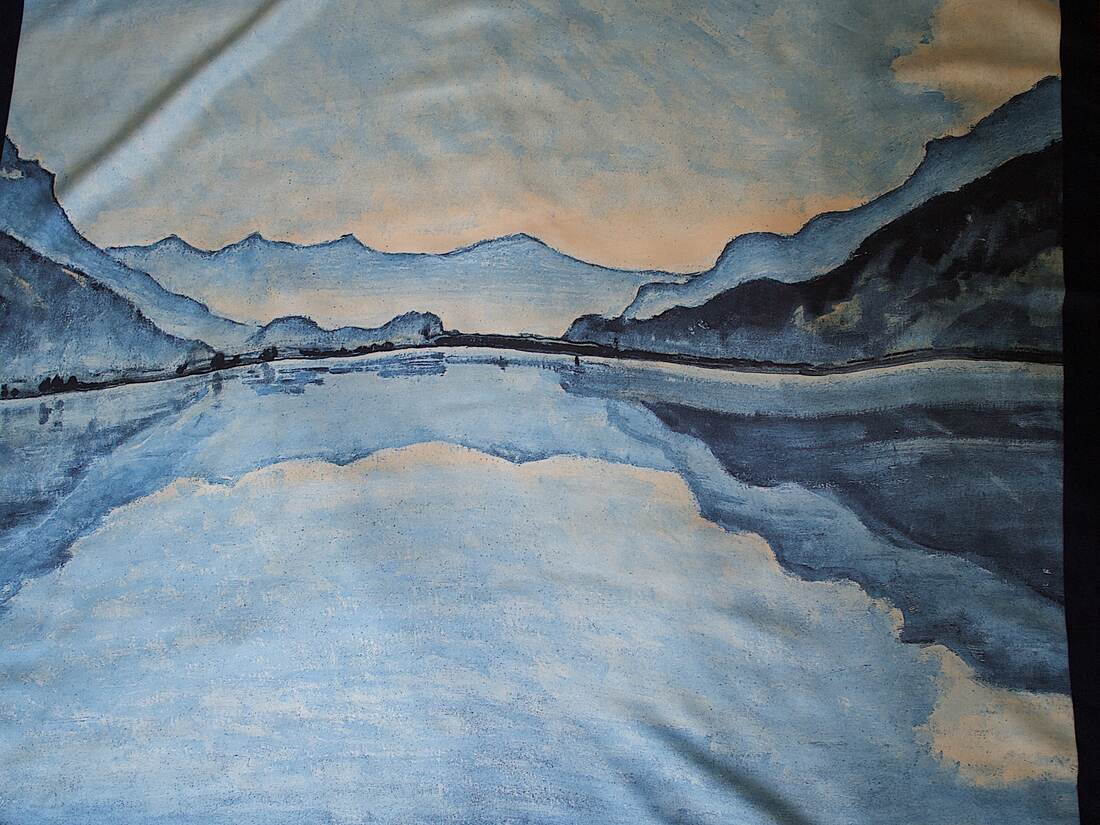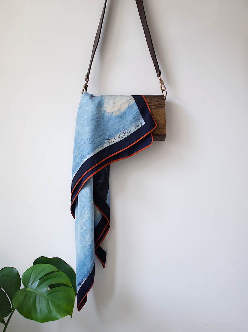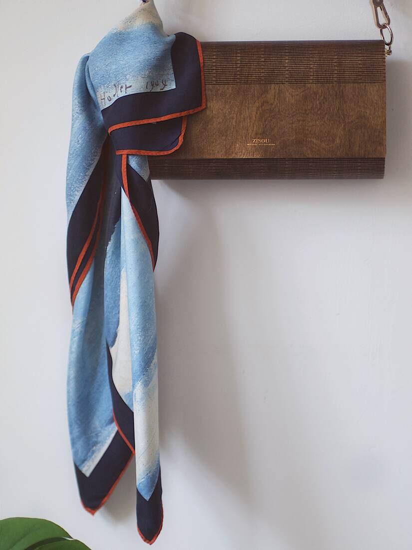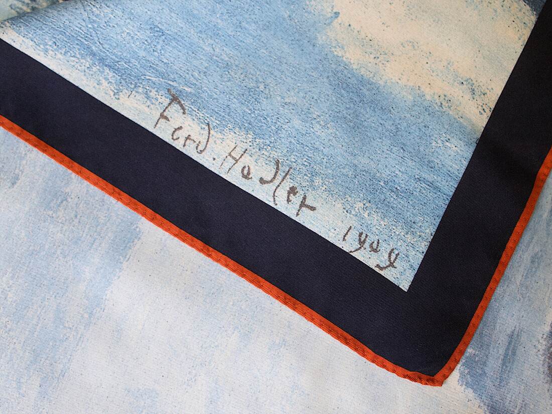 Unikatowa jedwabna apaszka z obrazem Ferdinanda Hodlera „Lake Tnun, Symmetric reflection”. Gęsty, wysokogatunkowy jedwab, apaszka bez wad, będzie idealna na prezent.