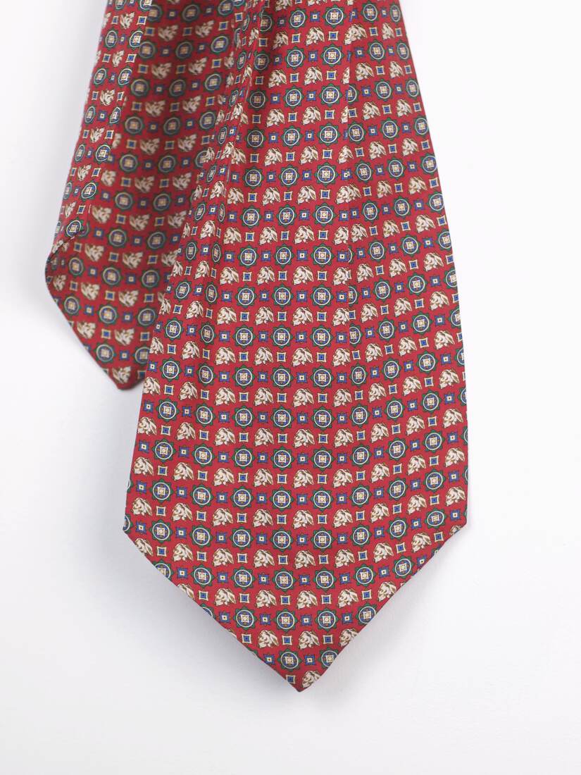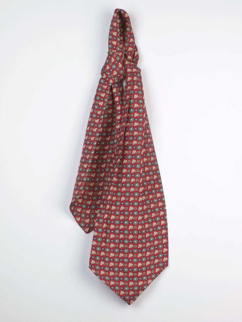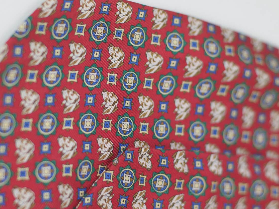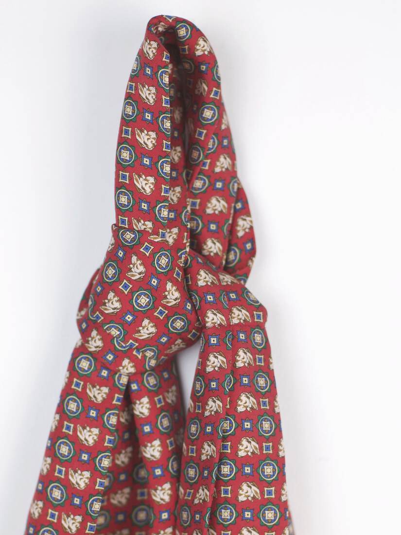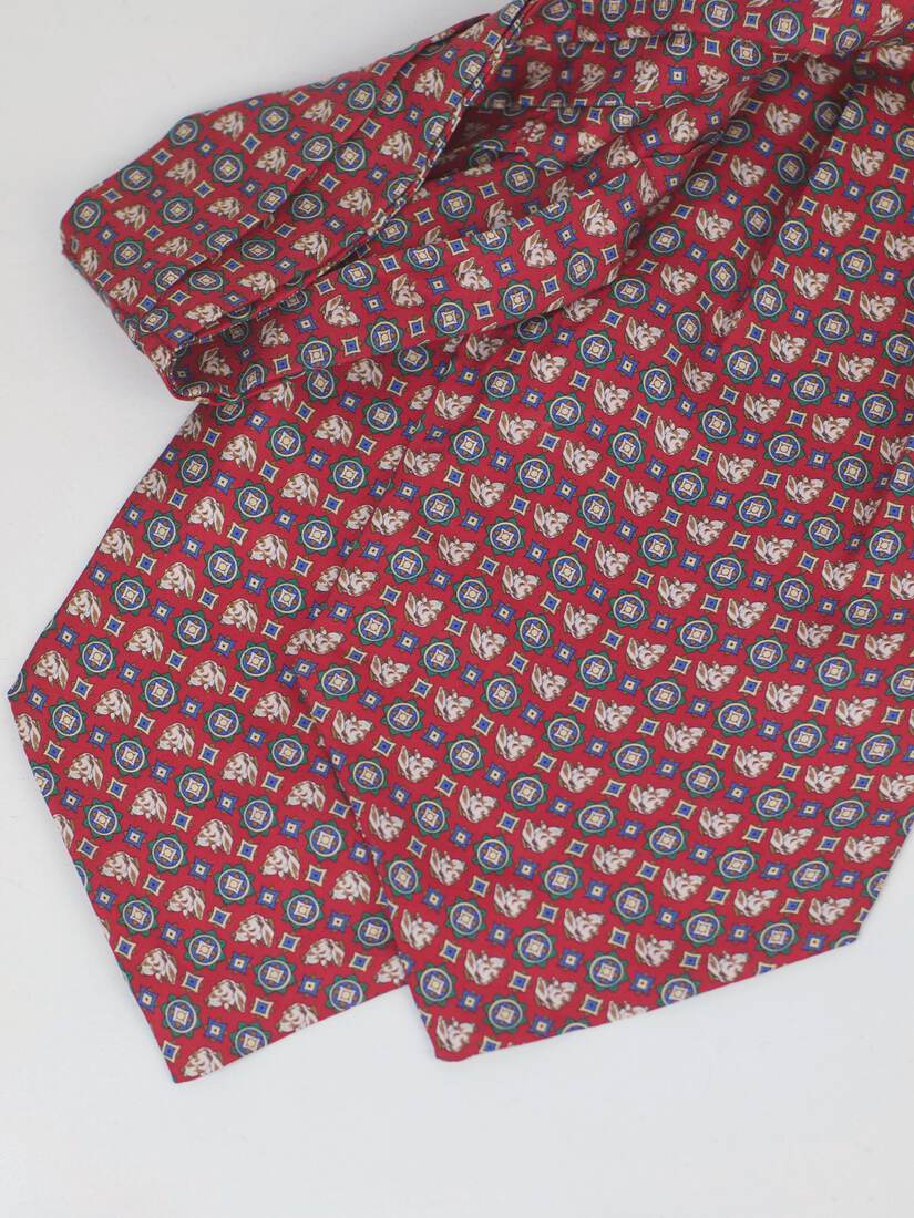 Jedwabny fular vintage we wzory. Wyprodukowany we Włoszech. Produkt unisex, może być noszony na szui, na głowie, na torebce lub jako pasek. Długość całkowita ok 122 cm, bez wad.