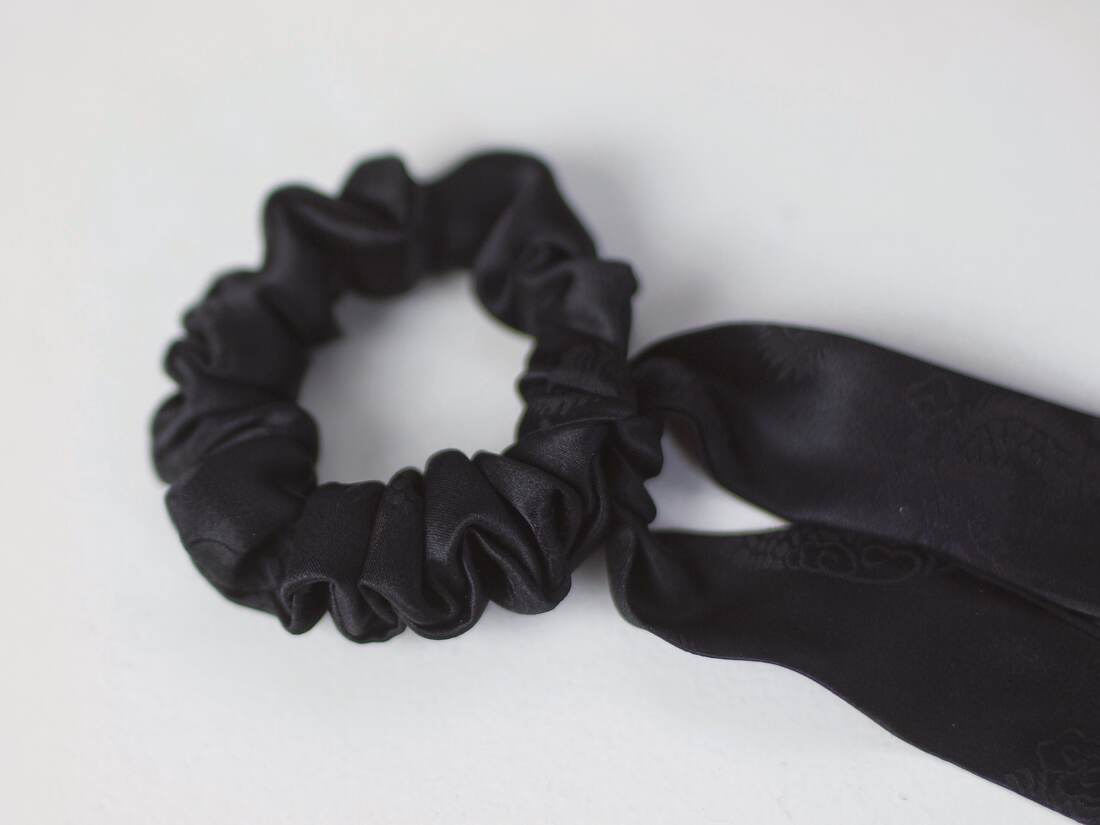 Zestaw z dwóch jedwabnych gumek do włosów, szytych z jedwabiu z odzysku. Wstążkę można wiązać na dowolną z gumek.