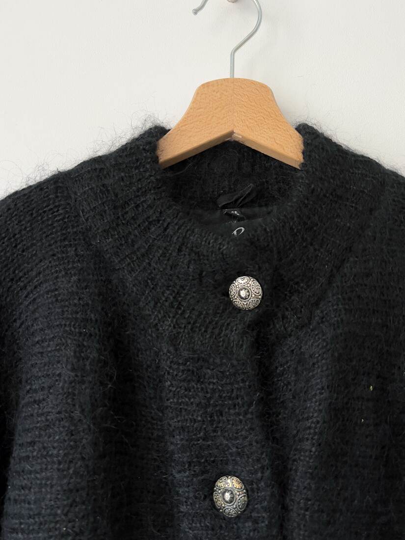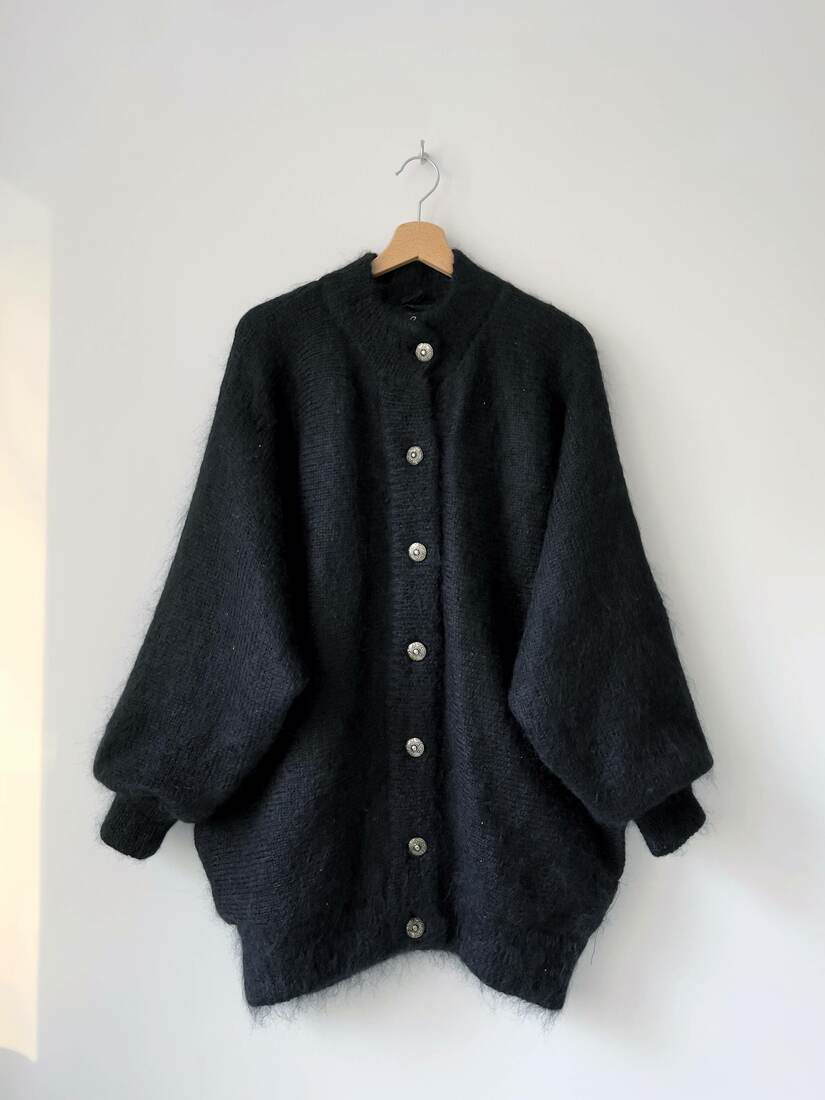 Unikatowy sweter vintage z lat 70-80-ch, marka Jeffrey Brownleader. Wykonany z puszystego moheru, z małym dodatkiem akrylu i nylonu. Sweter ma podszewkę, kieszeni, zapinany na metalowe guziki. Według metki rozmiar jest uniwersalny. Bez wad.