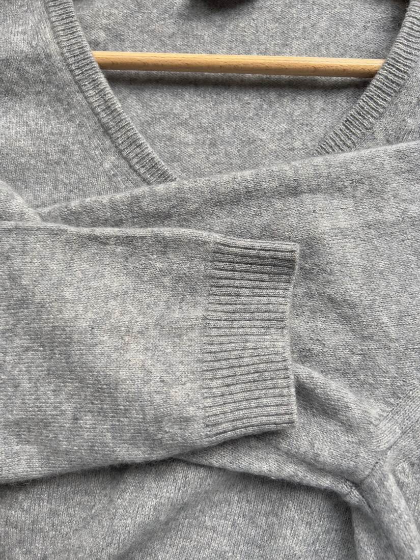 Sweter luksusowej niemieckiej marki Joop. W 100 % wykonany z kaszmiru. Na rękawie ma cerowania, pokazane na ostatnim zdjęciu. Są absolutnie niewidoczne w noszeniu. Poza tym bez wad, mięciutki i puszysty. Rozmiar L.
