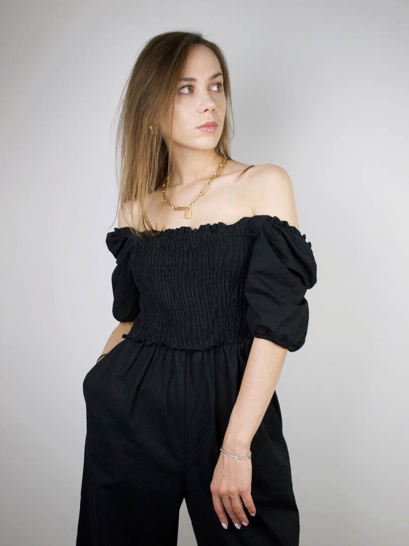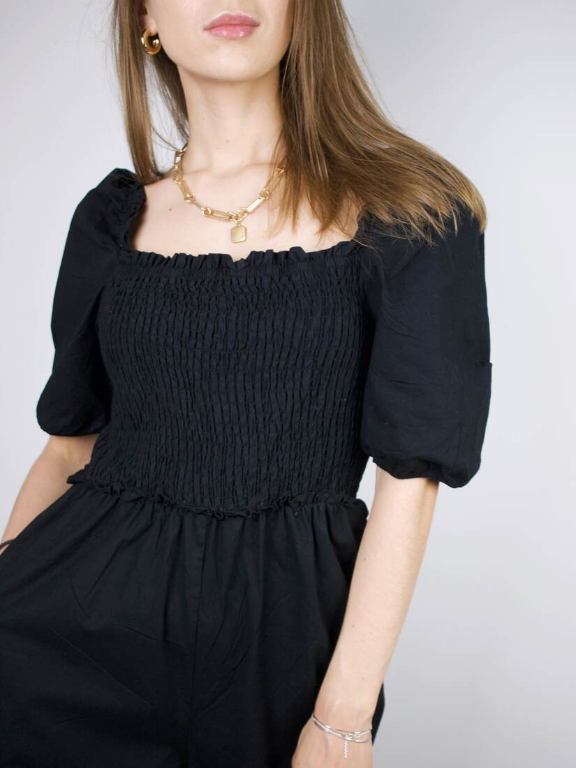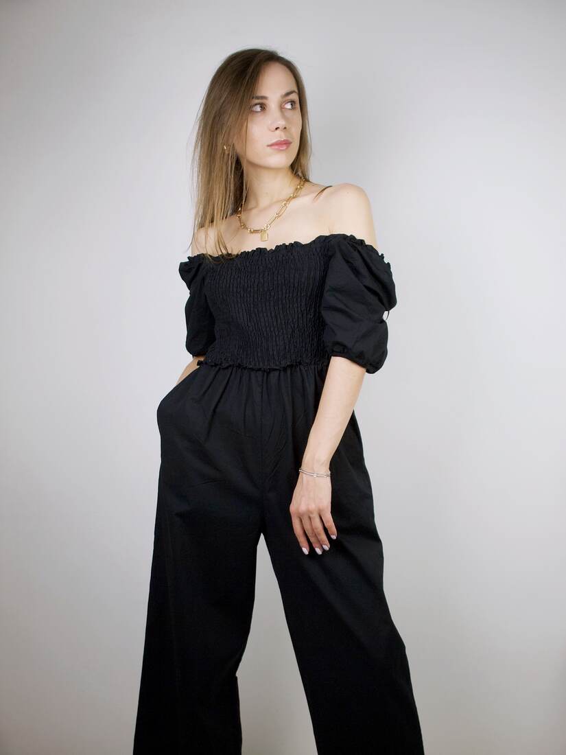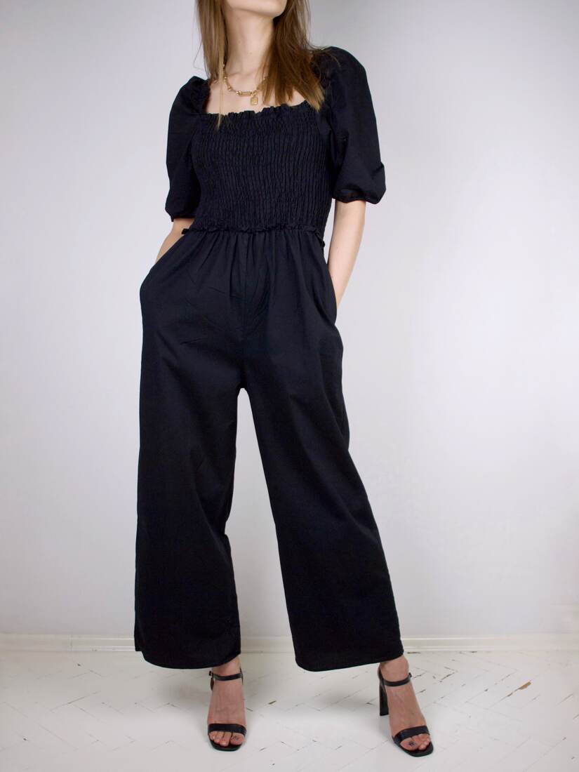 Bawełniany kombinezon z bardzo szerokimi nogawkami. Rozmiar z metki M, będzie pasować również na XS i S. Bez wad.