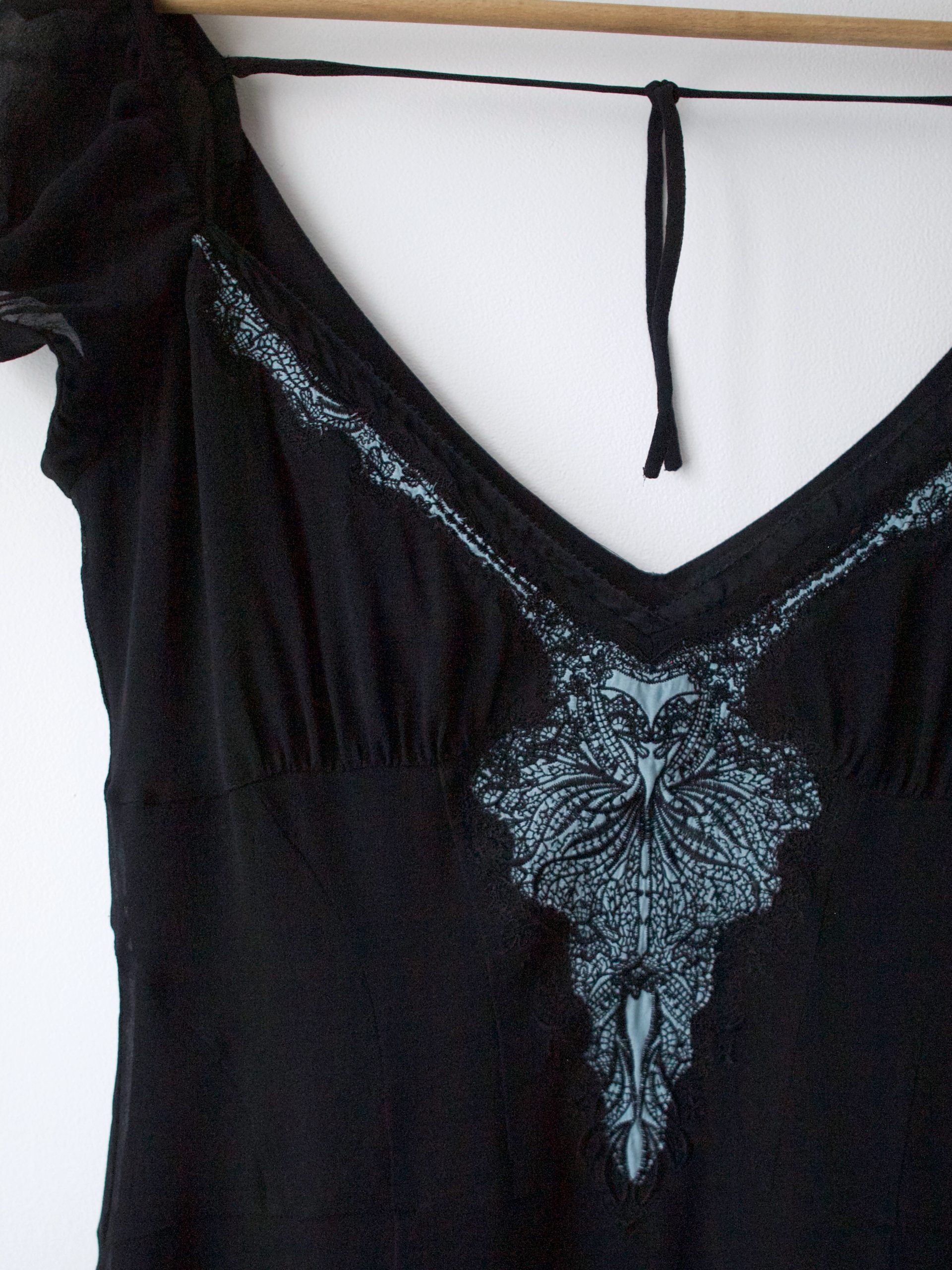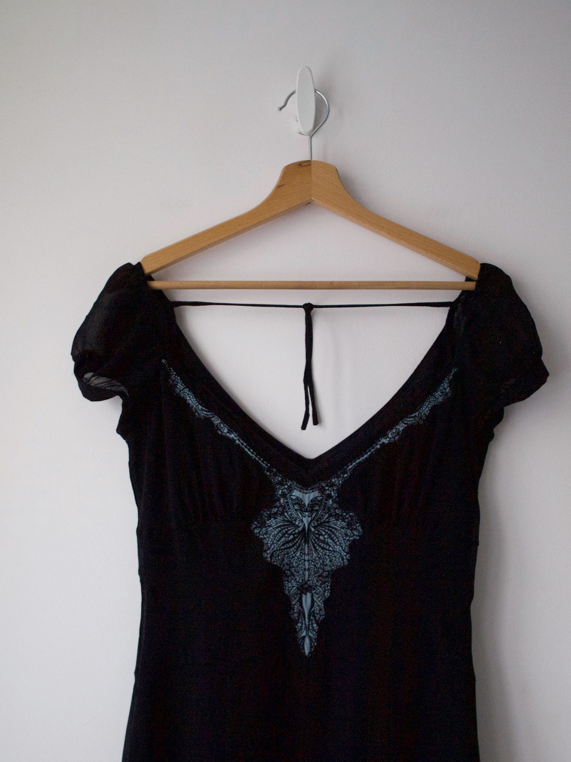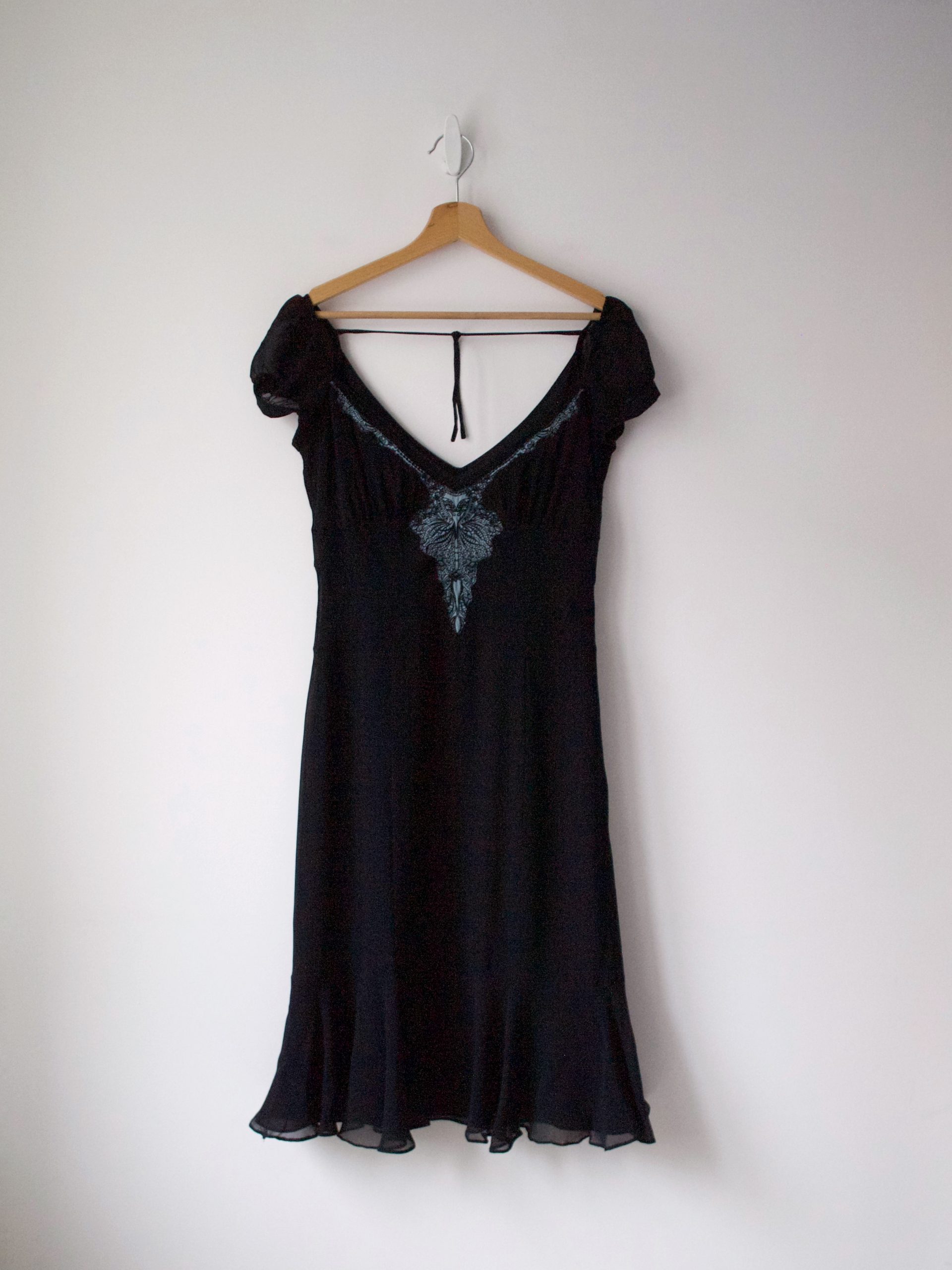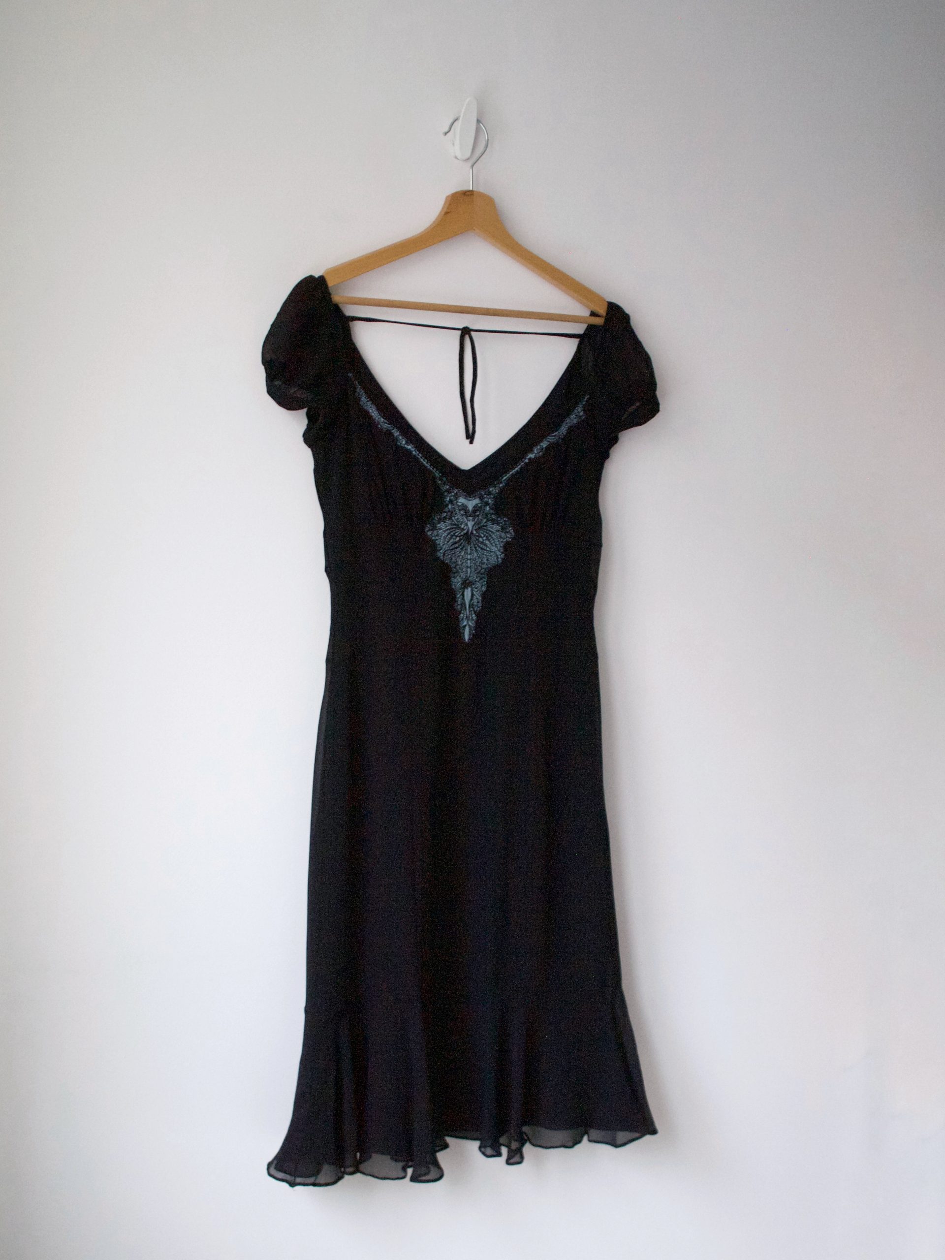 Sukienka ekskluzywnej skandynawskiej marki Karen Millen. Zdobiona haftem, z tyłu głęboki dekolt z wiązaniem. Z podszewką, zapinana na boczny zamek.