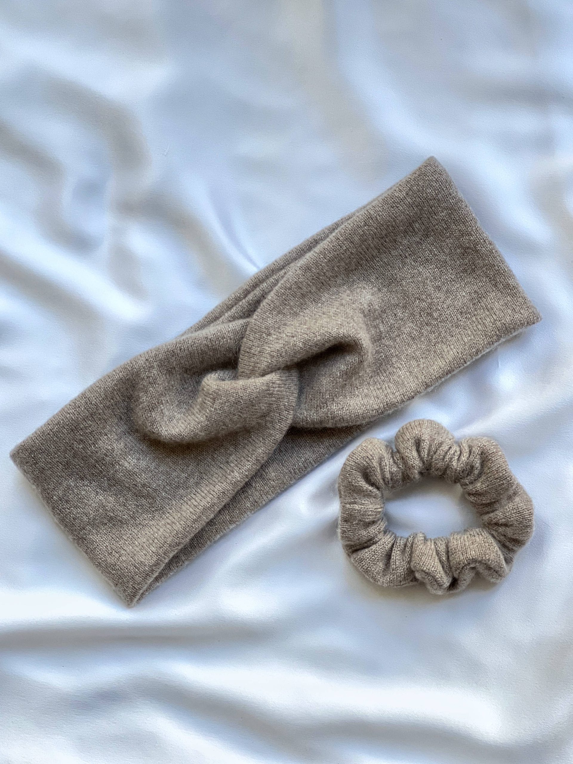 Kaszmirowy zestaw składający się z ciepłej opaski oraz gumki do włosów. 100% kaszmir z odzysku. Szerokość opaski 10 cm, średnica około 18 cm.