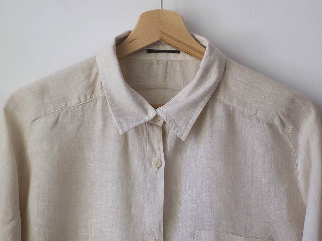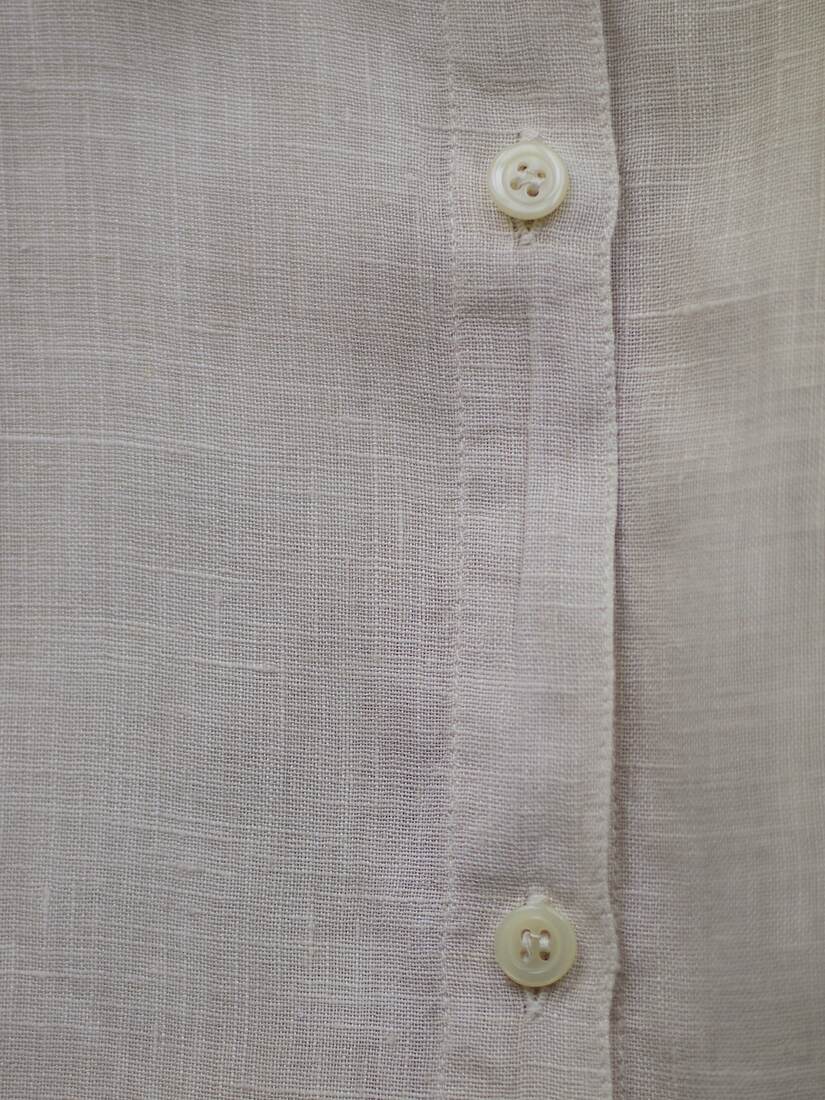 Minimalistyczna lniana koszula w naturalnym kolorze. Wycięta część metek, ma nie zaznaczoną linie ramion, więc będzie dobra na XS-S-M, zależnie od pożądanego dopasowania. Bez wad.