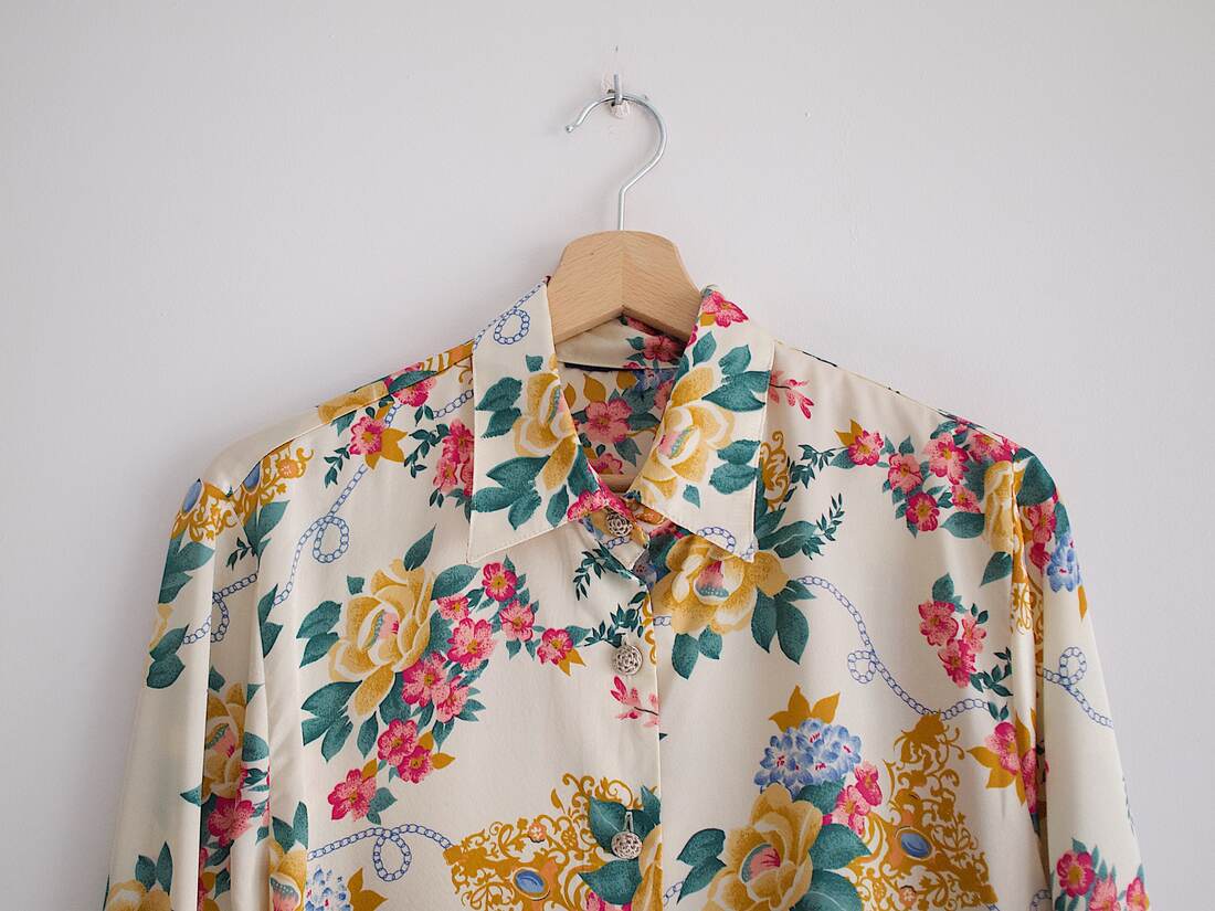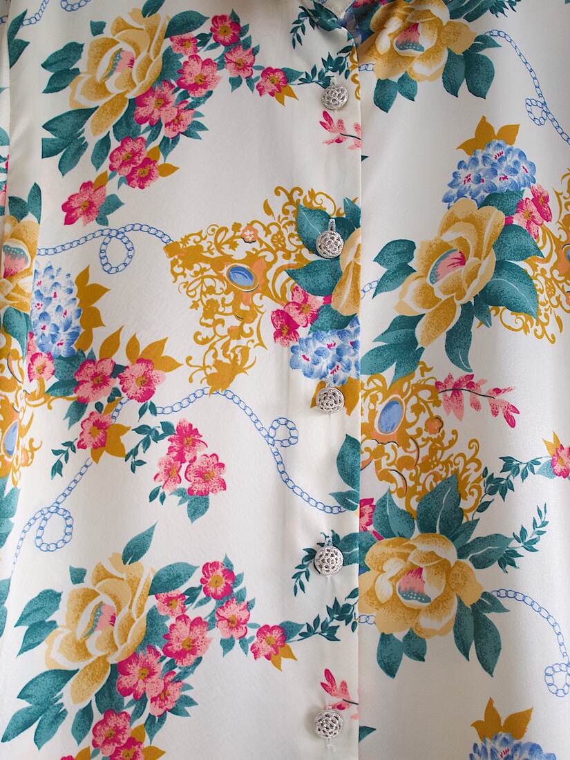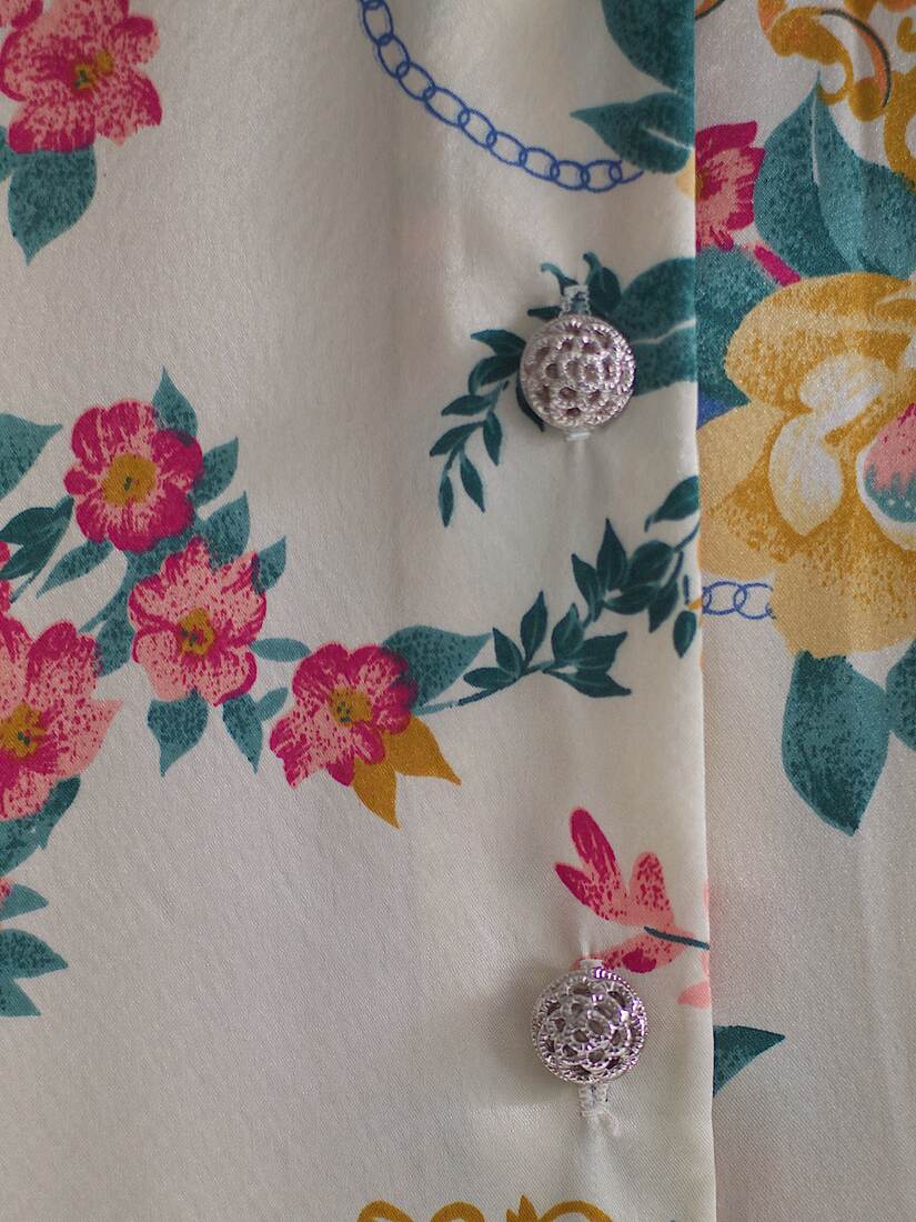 Bluzka vintage wykonana ze śliskiego, satynowego materiału. Zapinana na ozdobne guziki. Metki wycięte, na oko będzie pasować na M-L, lub na mniejsze jako oversize. Bez wad.