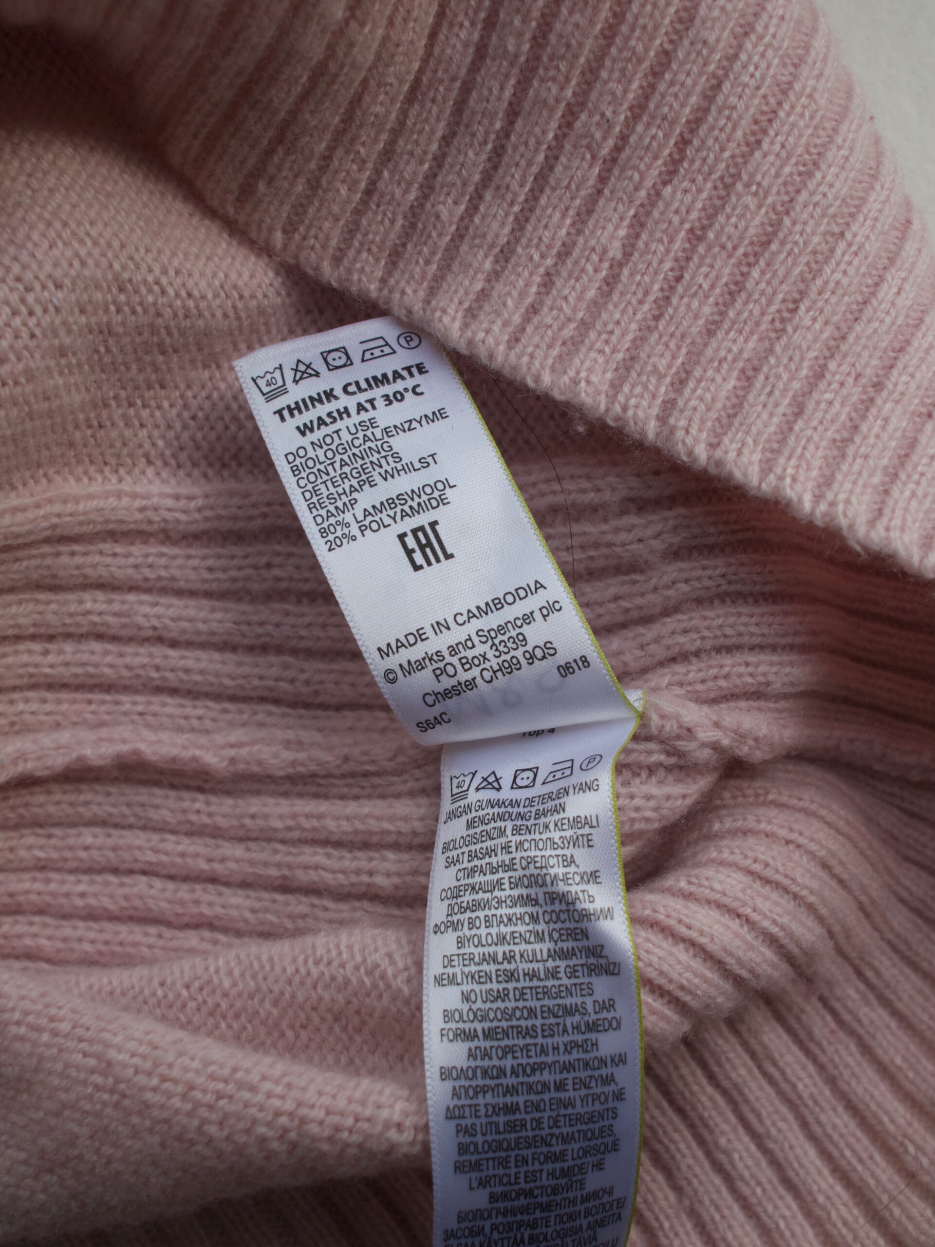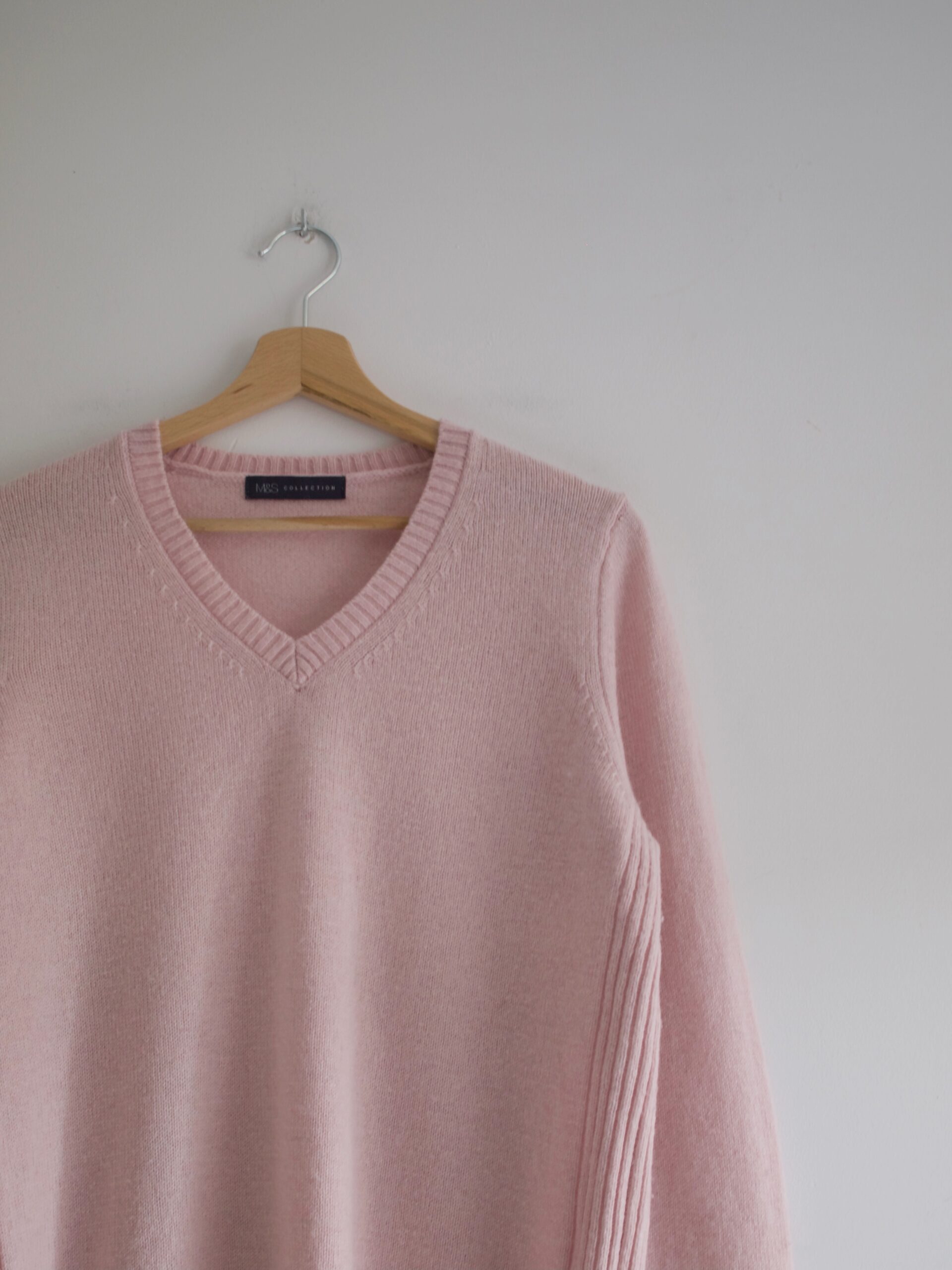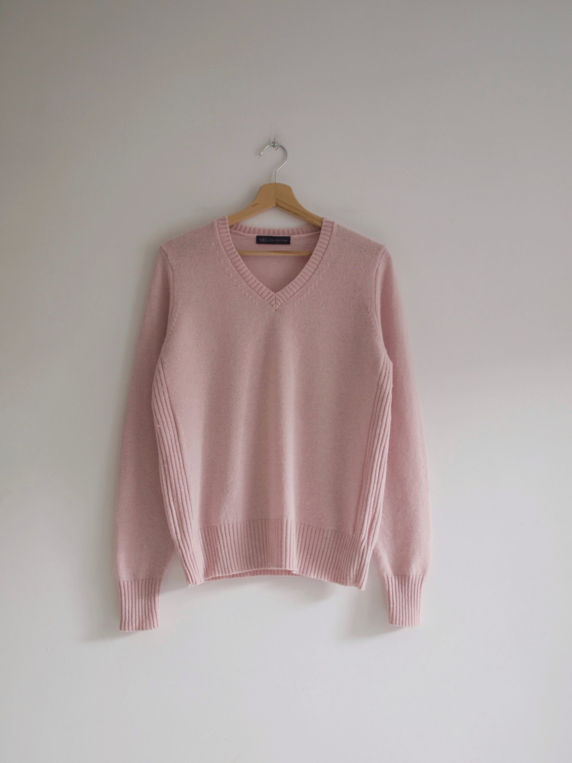 Klasyczny sweter M&S z dekoltem w serek. Skład to 100% kaszmir, bardzo dobry stan, jest minimalnie sfilcowany, nie jest to zauważalne, po prostu jest trochę sztywniejszy.