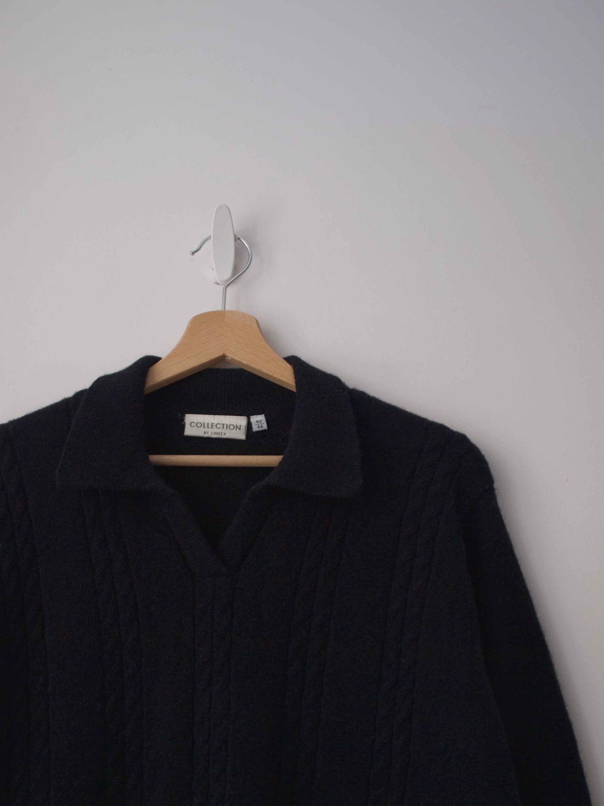 Klasyczny sweter M&S z dekoltem w serek. Skład to 100% kaszmir, bardzo dobry stan, jest minimalnie sfilcowany, nie jest to zauważalne, po prostu jest trochę sztywniejszy.