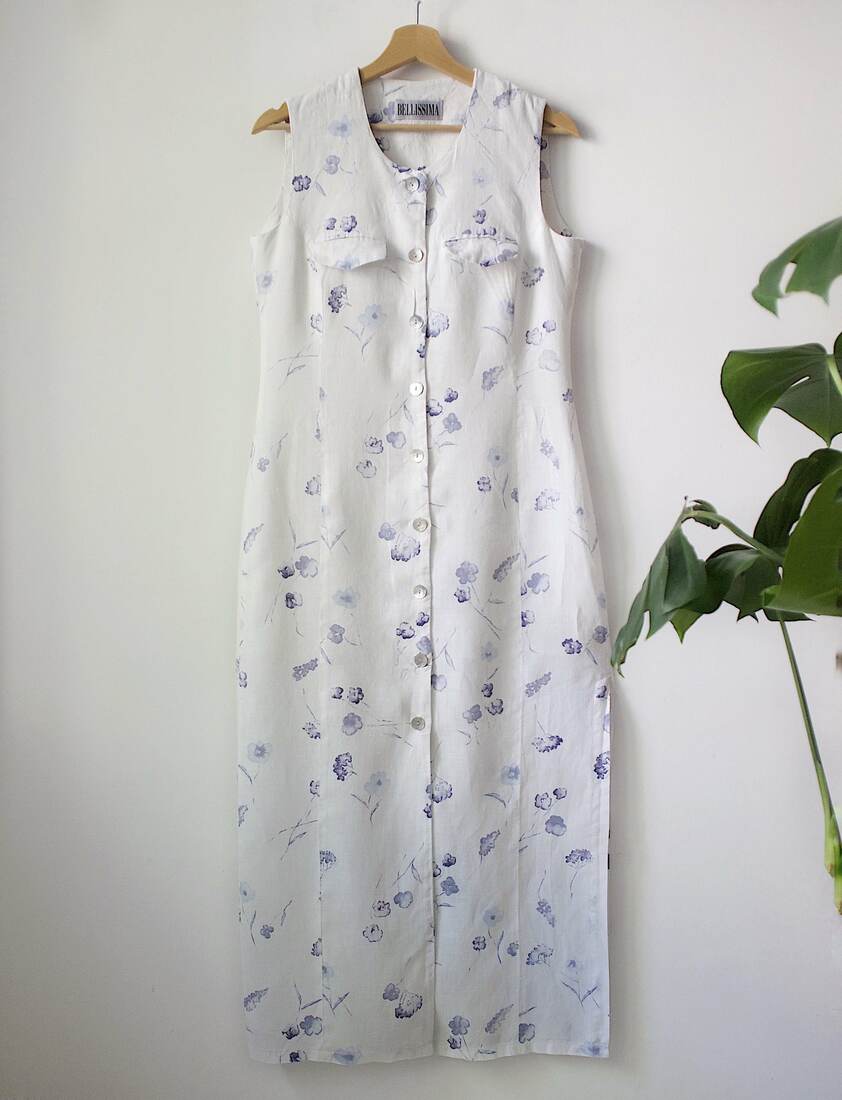 Unikatowa sukienka vintage w kwiaty. Prosty krój, z jednej strony rozporek, guziki wykonane z naturalnej muszli. Brak metki z rozmiarem, polecam na S-M. Bardzo dobry stan.