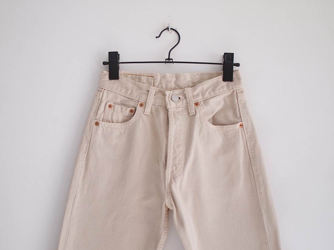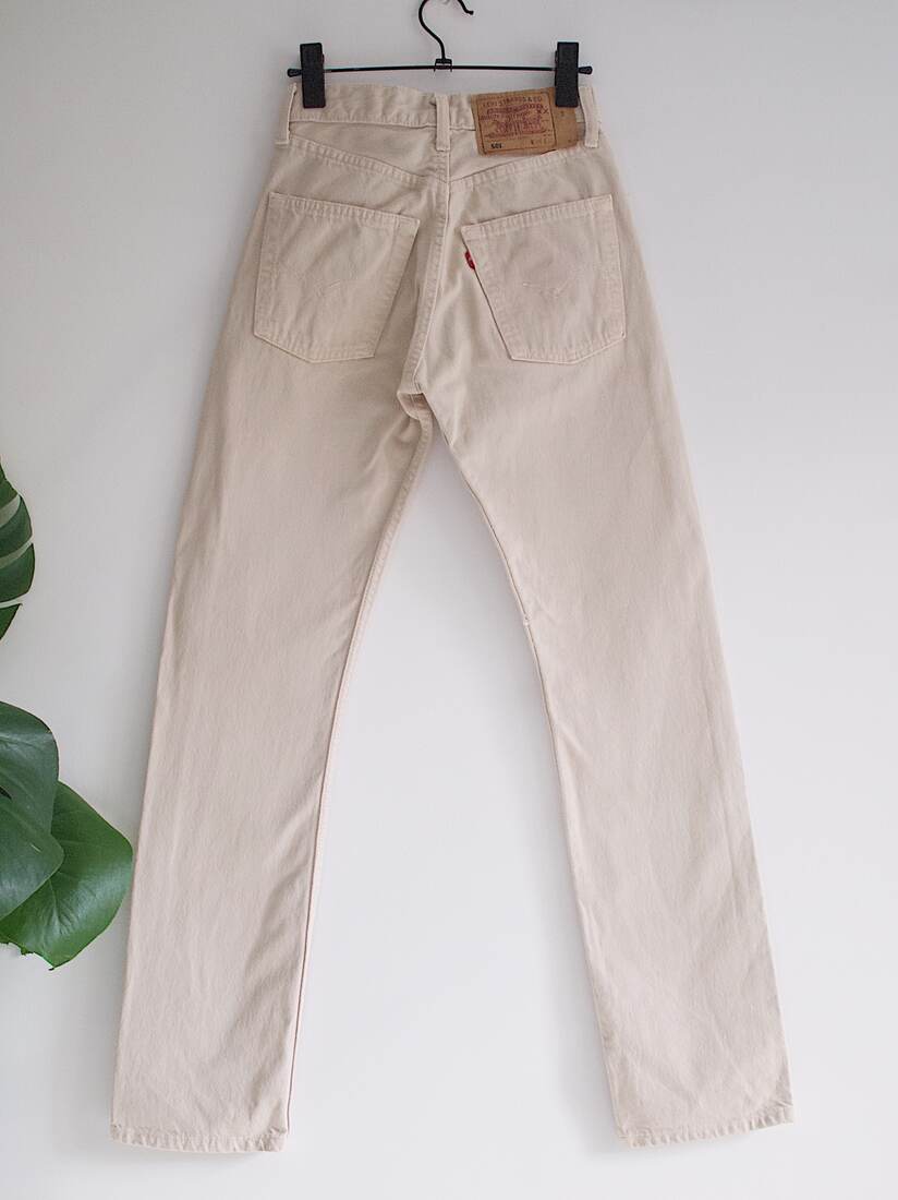 Beżowe Levis’y 501. Rozmiar z metki W26 L32, jest to rozmiar vintage, więc proszę sugerować się wymiarami. Bez wad.