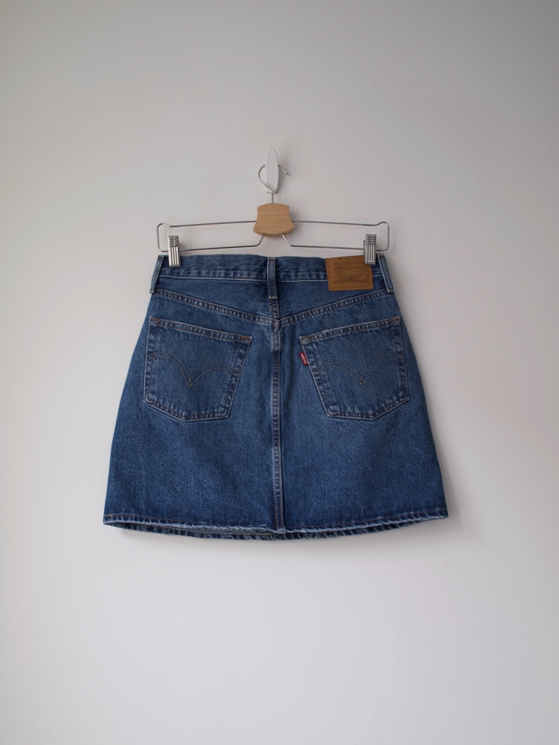 Spódniczka mini marki Levi’s. Rozmiar z metki: 27 Skład: 100% bawełna Stan: idealny Szerokość w pasie 36 cm Szerokość w biodrach 48 cm Długośćcałkowita 42 cm