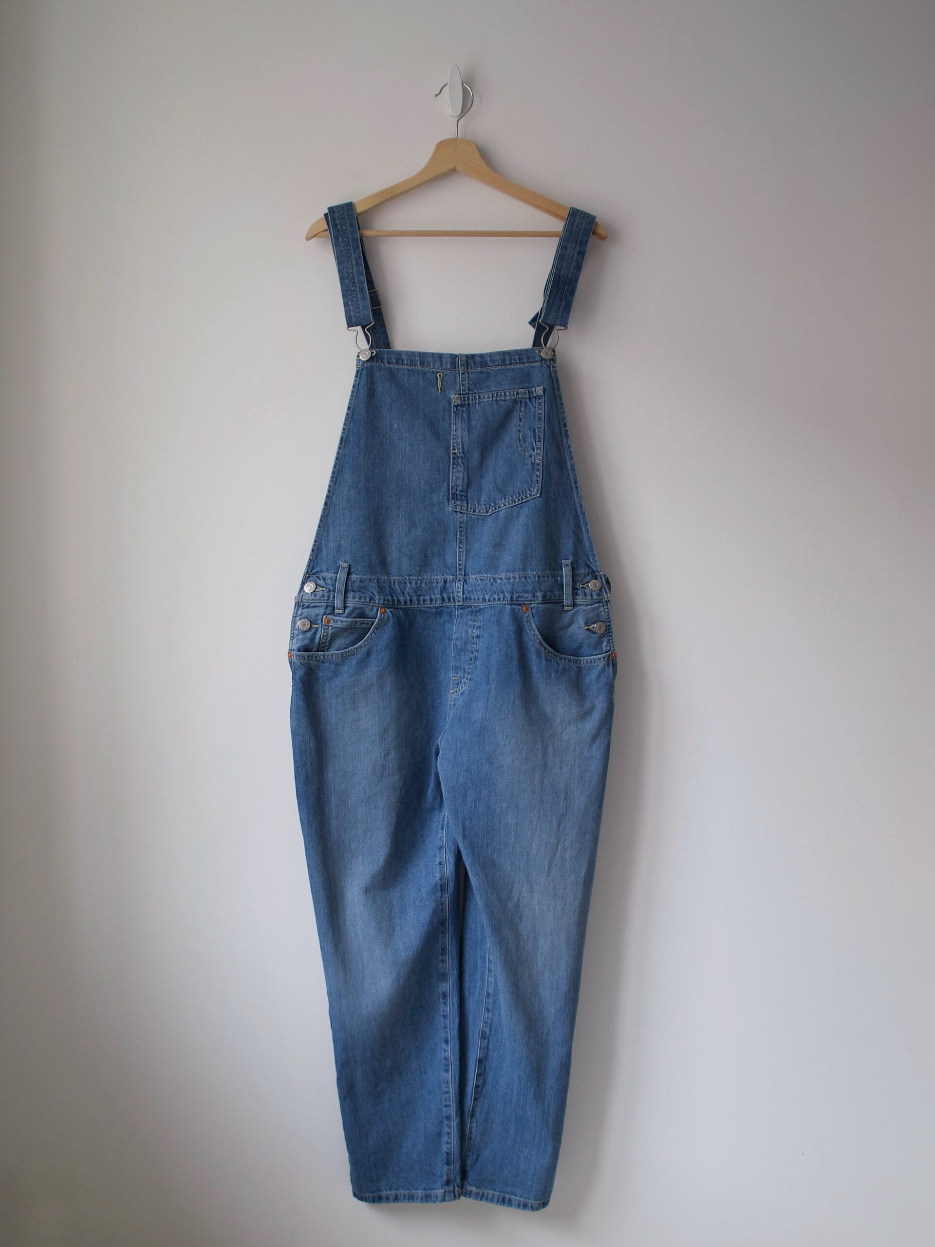 Unikatowe jeansy vintage, wykonane z grubego denimu. Wysoki stan, zapięcie na guziki, zawężana talia (polecam na talię max. 70 cm), bardzo szerokie nogawki. Modelka ma 165 cm wzrostu i nosi rozmiar xs-s. Bez wad.
