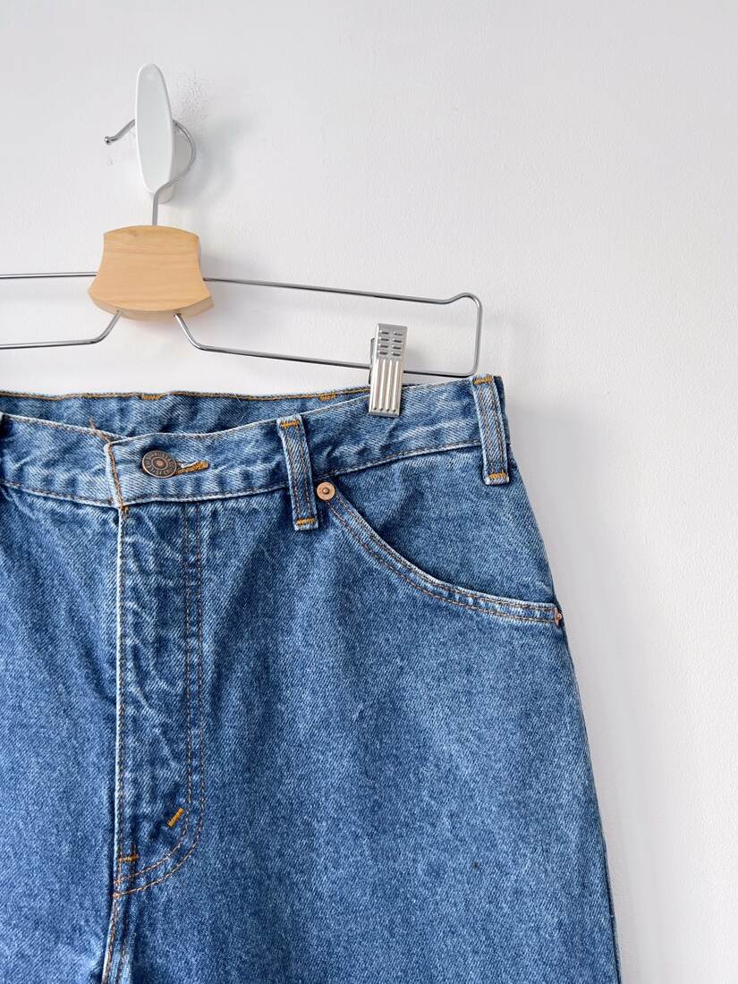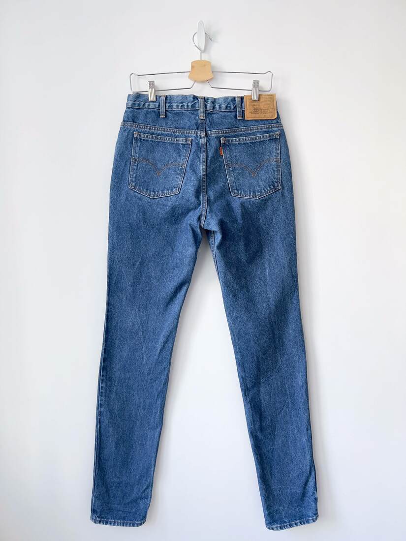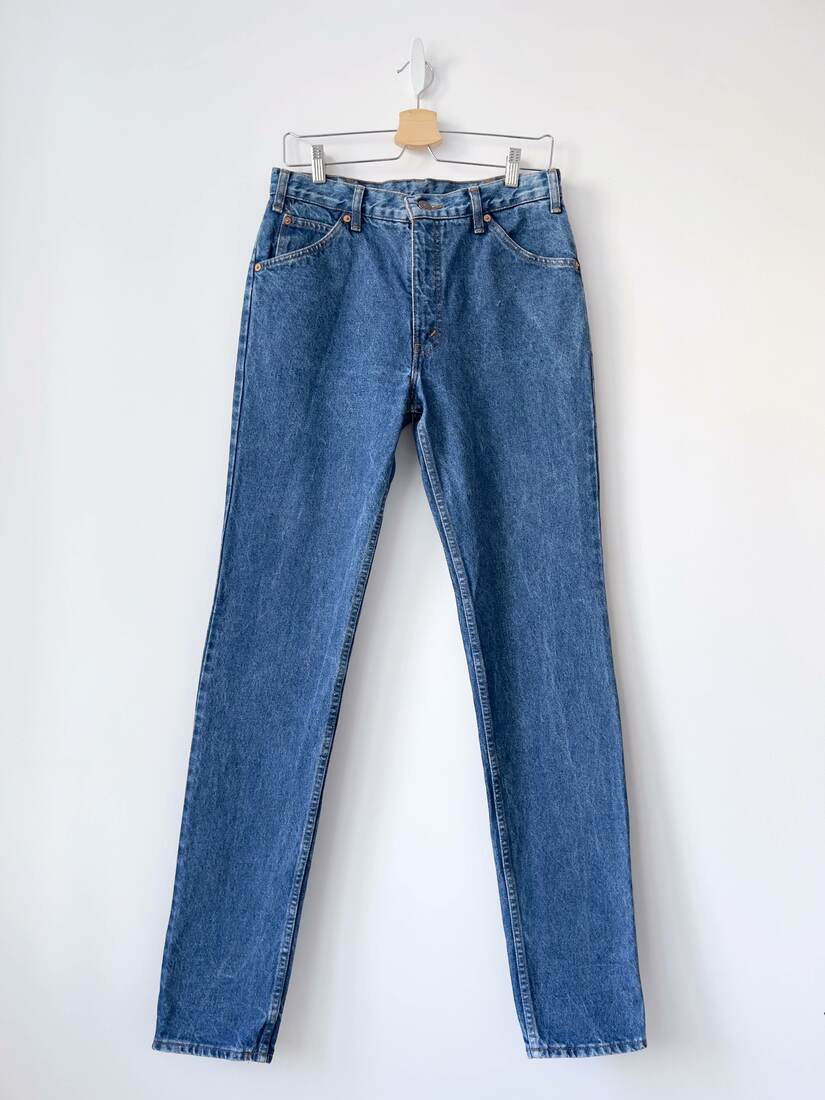 Unikatowe jeansy marki Levi’s, model vintage z lat 90-ch. Fason z wysokim stanem oraz zwężaną nogawką, zapinane na suwak, nie są elastyczne. Rozmiar z metki 33/34. Bez wad