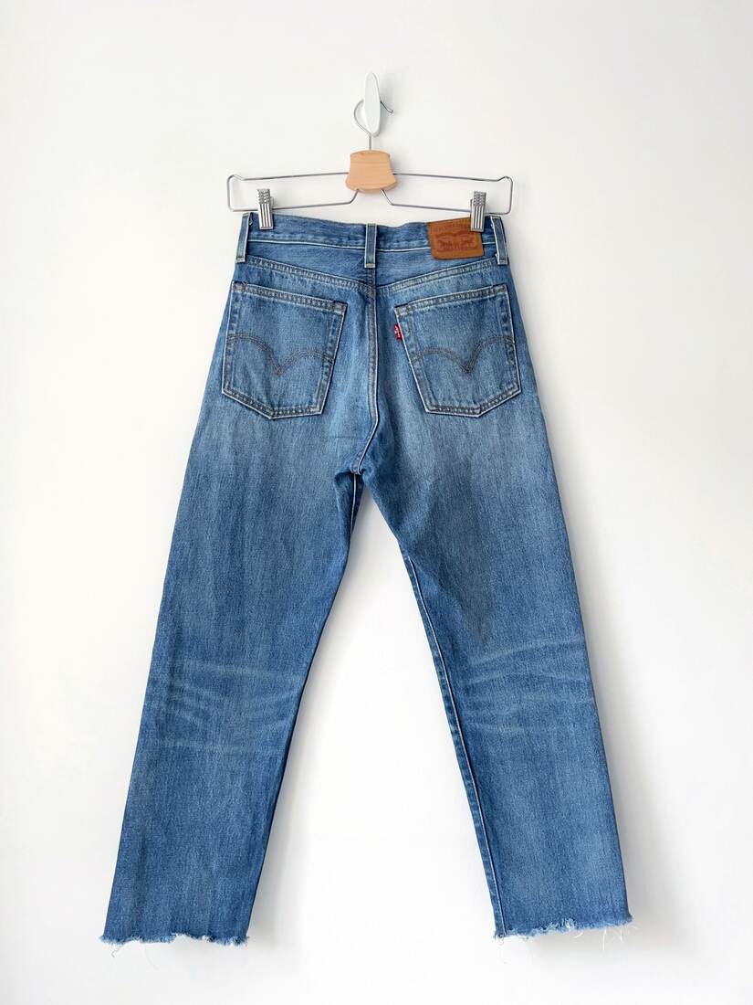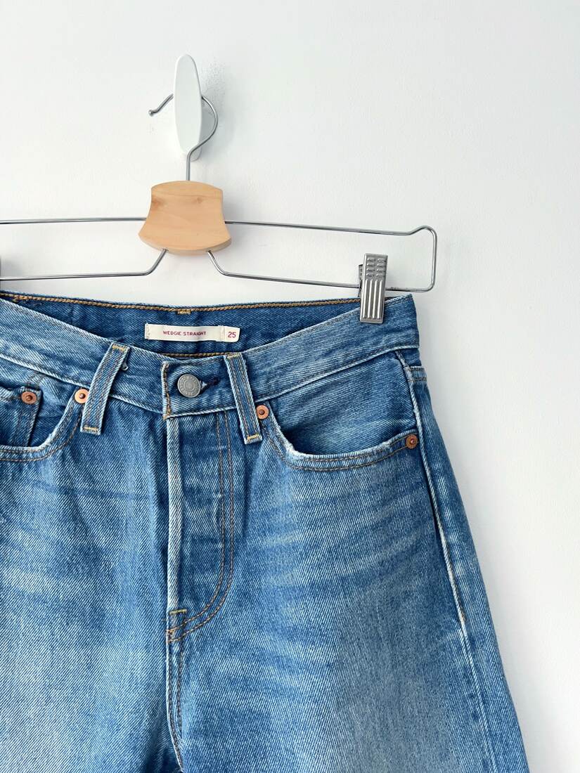 Jeansy marki Levi’s, model Wedgie Straight. Wysoki stan, nogawka wykończona na surowo, zapinane na guziki. W 100% wykonane z bawełny, nie są rozciągliwe. Rozmiar z metki 25 (xs), bez wad.