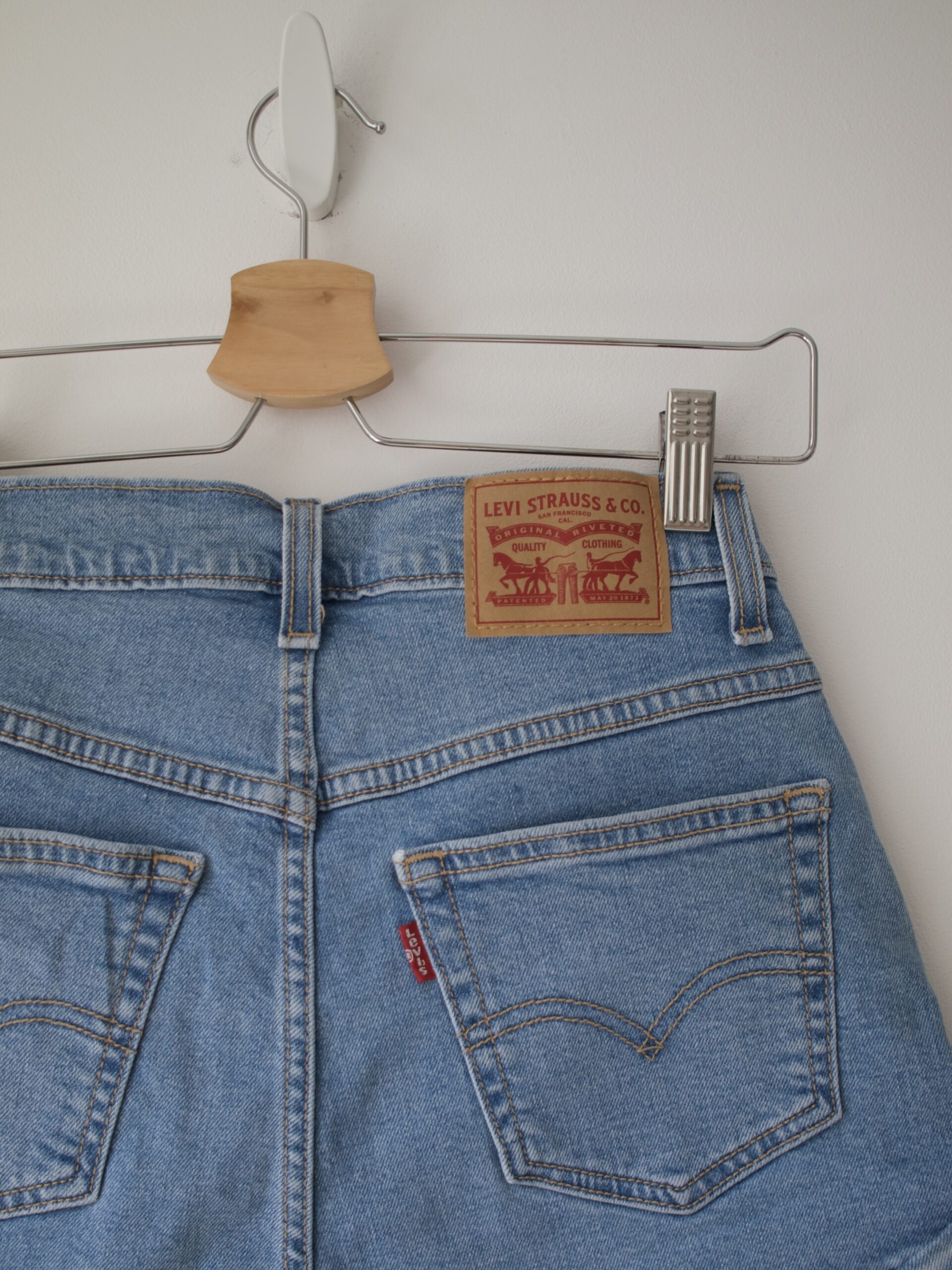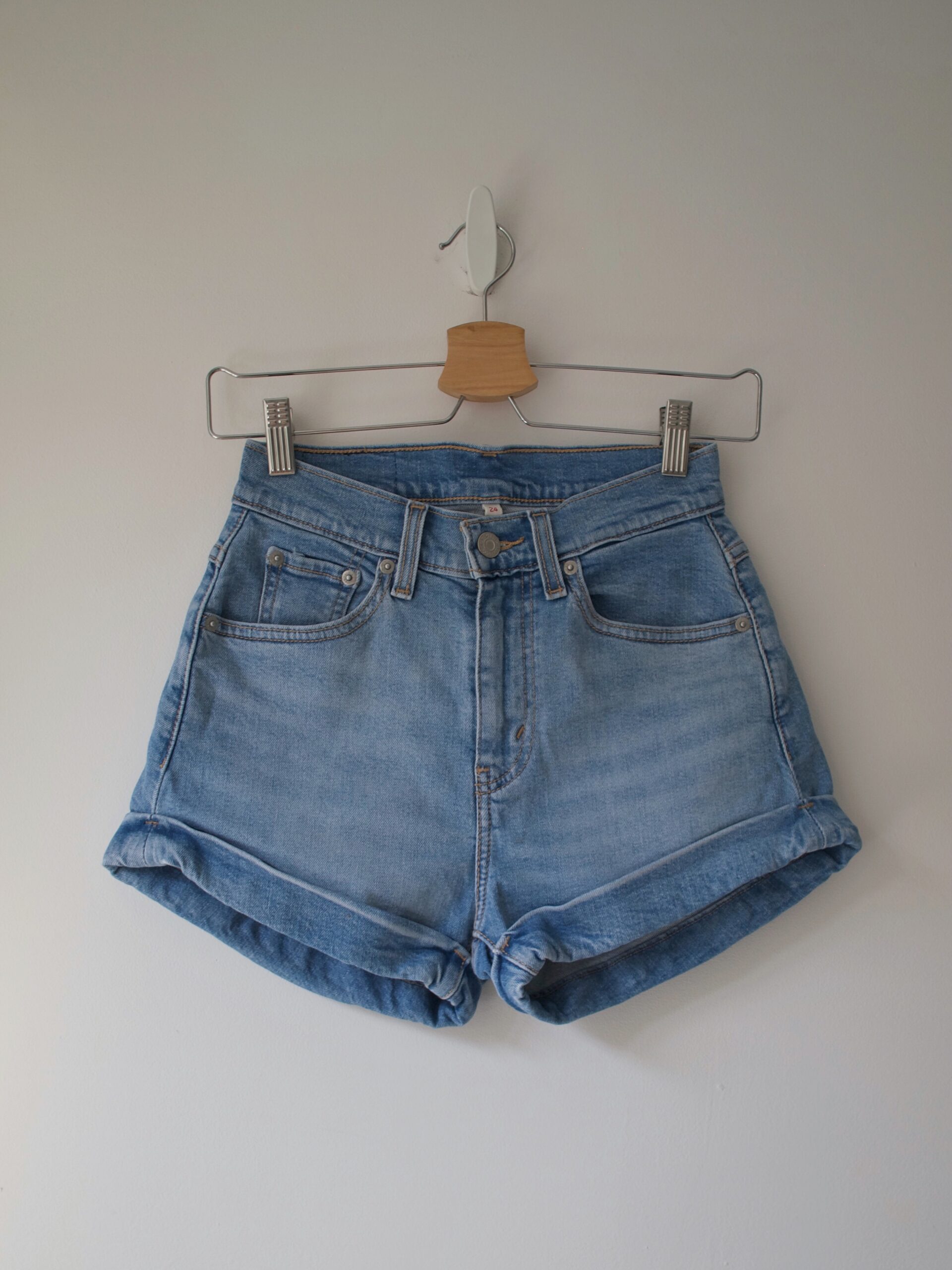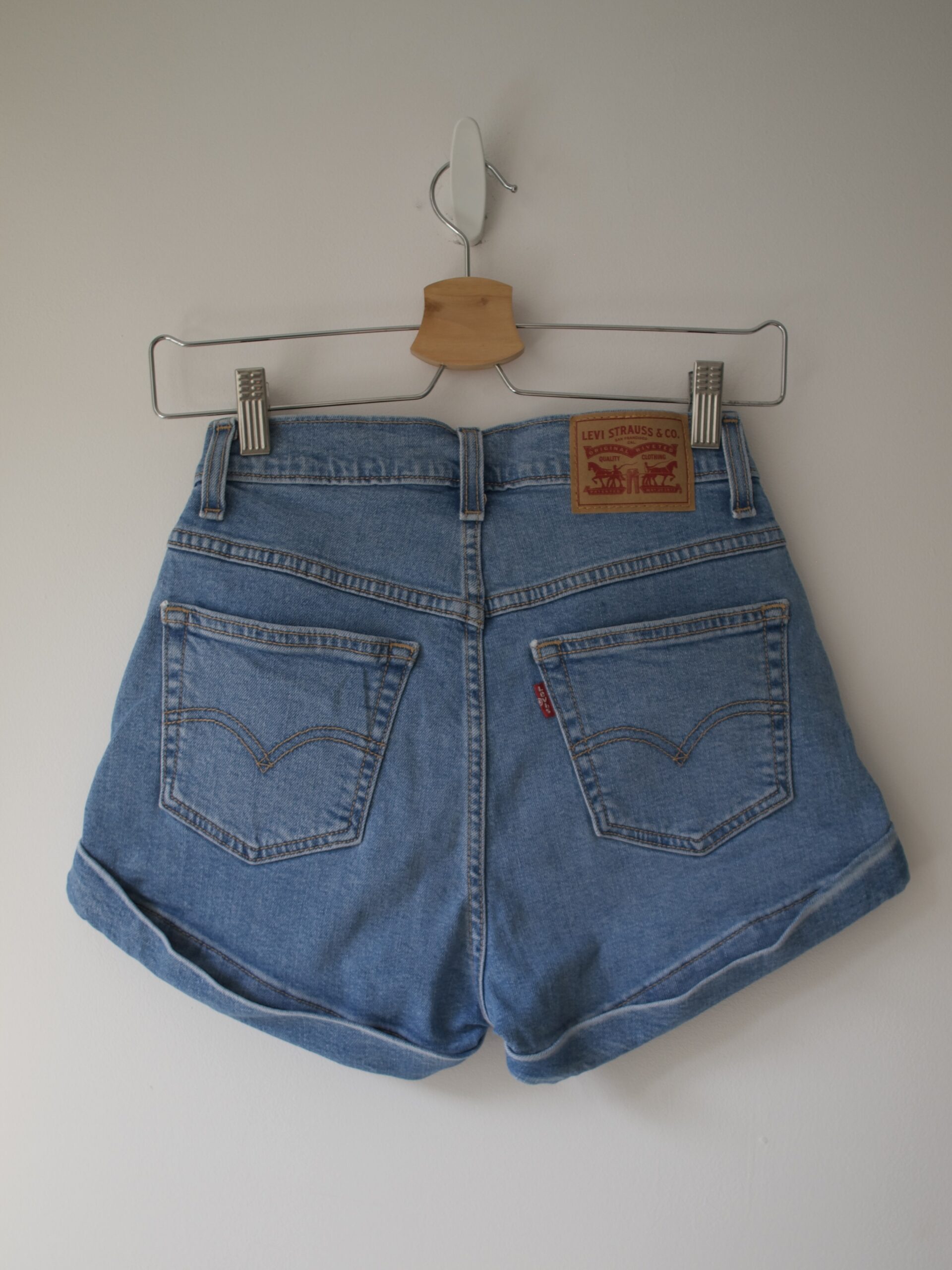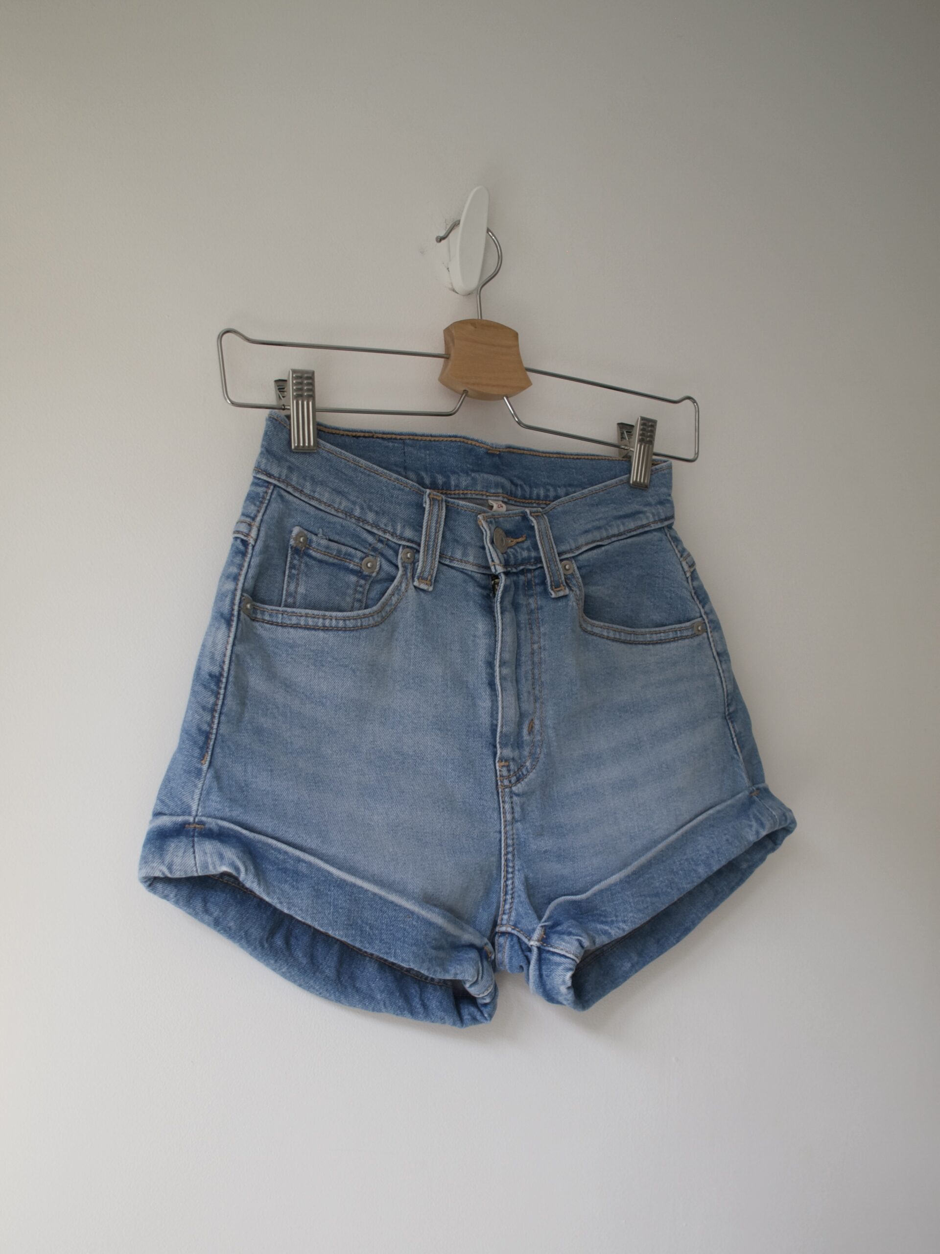 Spodenki marki Levis. Rozmiar: 24 Skład: brak metki, lekko elastyczne, więc moim zdaniem bawełna/elastan Stan: bez wad Szerokość w pasie 31 cm Szerokość w biodrach 43 cm Długość całkowita 28 cm