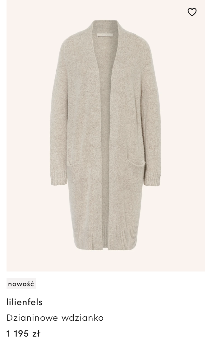 Kardigan marki Lilienfels, która specjalizuje się w produkcji ubrań z kaszmiru. Puszysty i miły w dotyku.