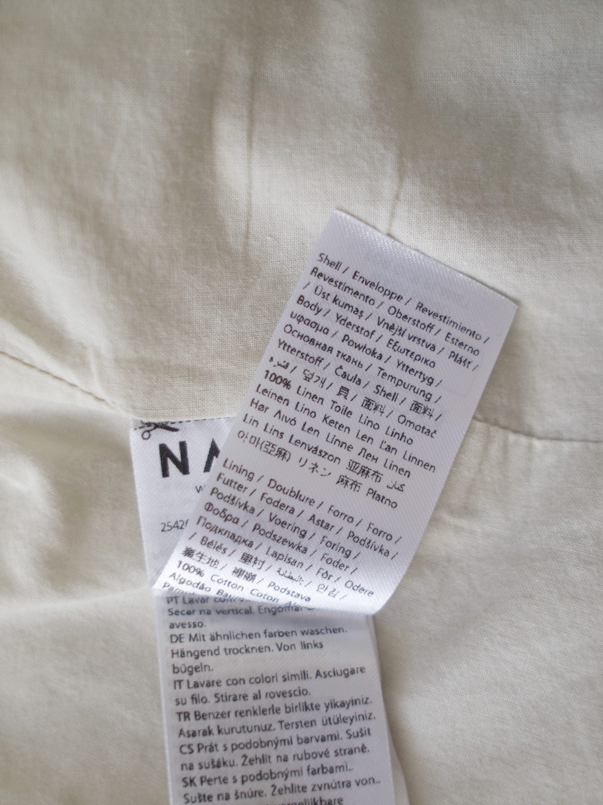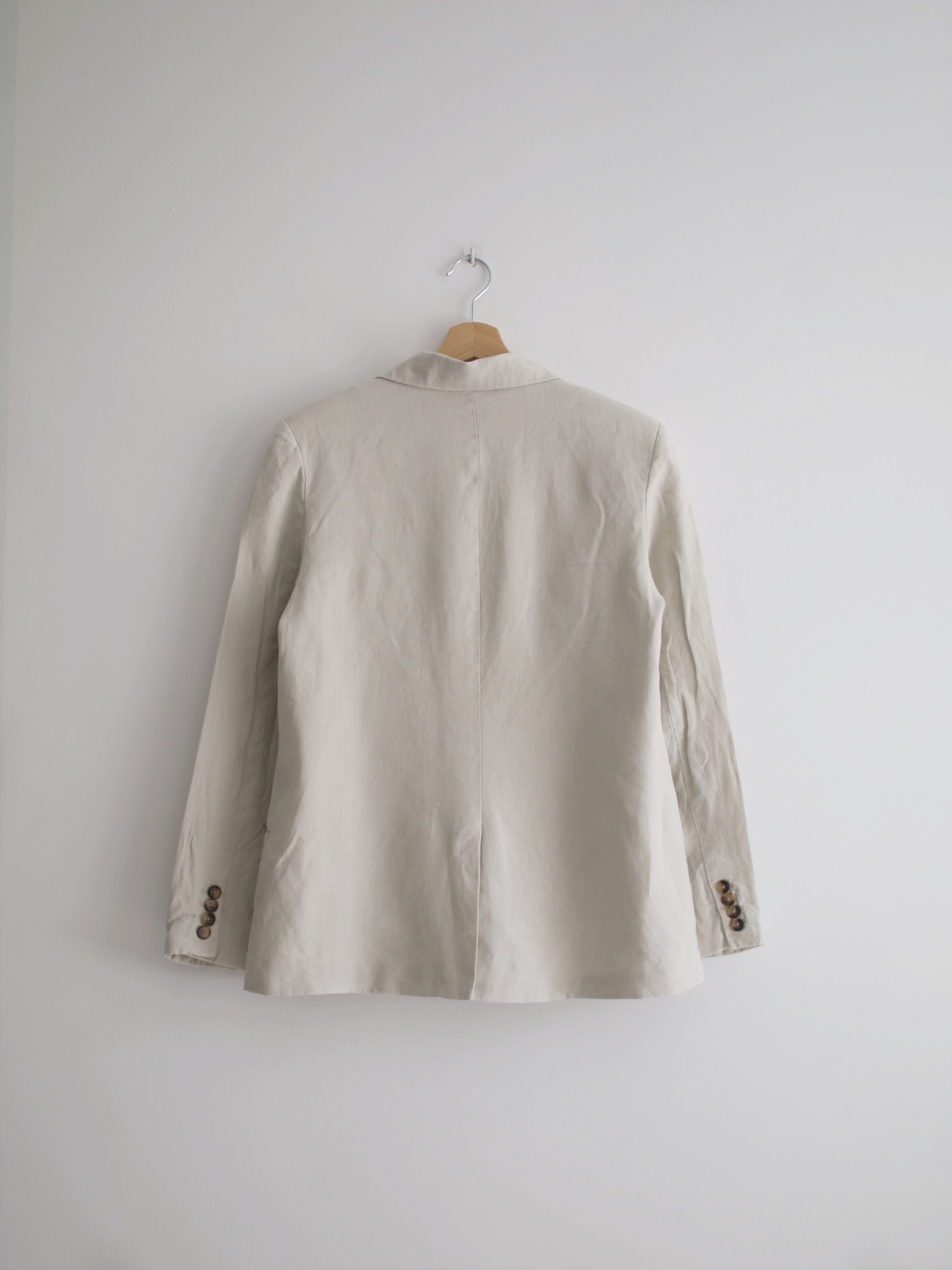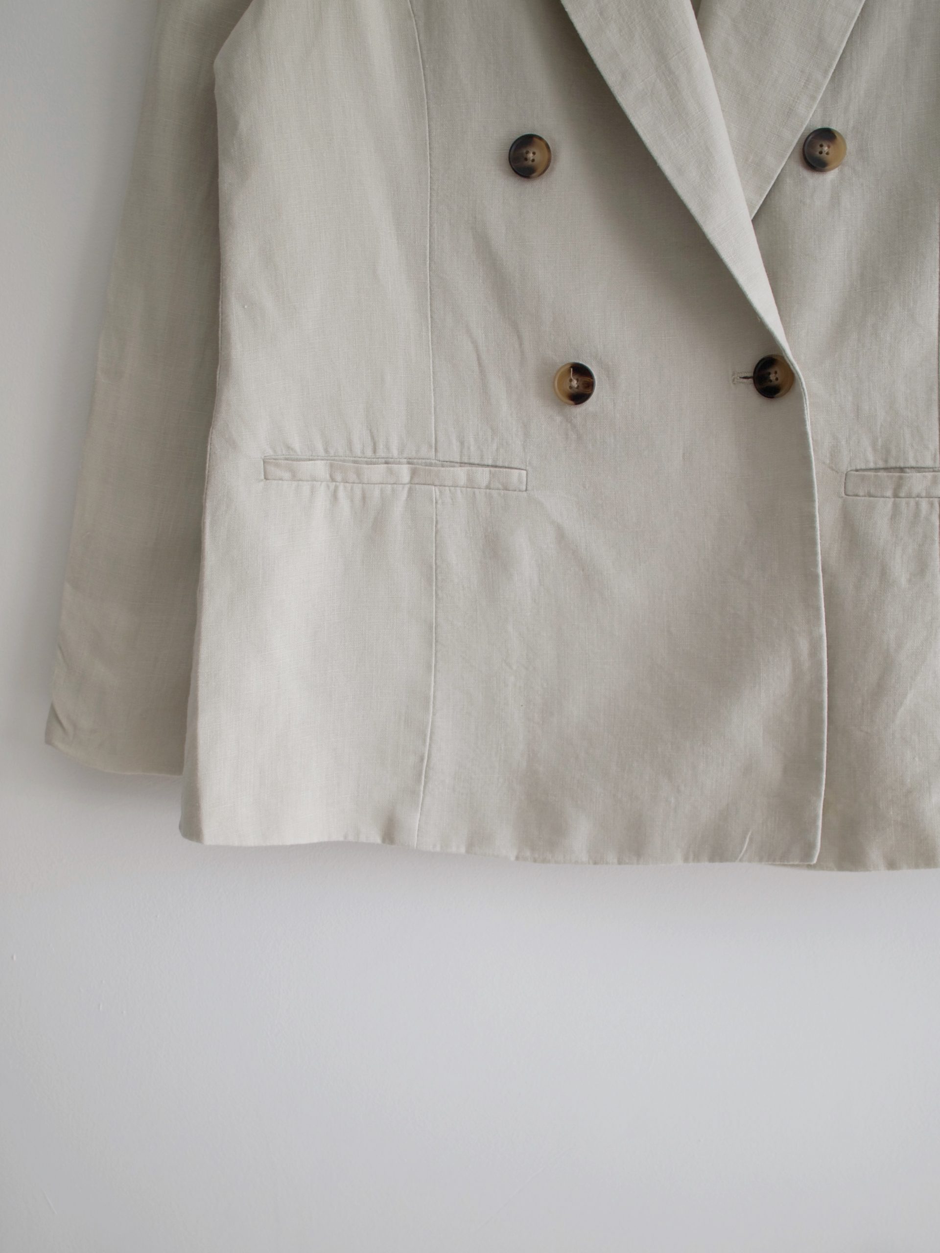 Dwurzędowa marynarka marki Na-Kd, w 100% wykonana z lnu. W ramionach poduszki.