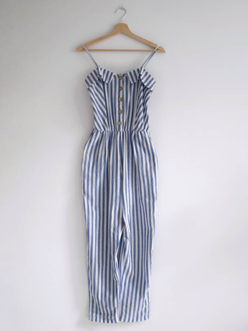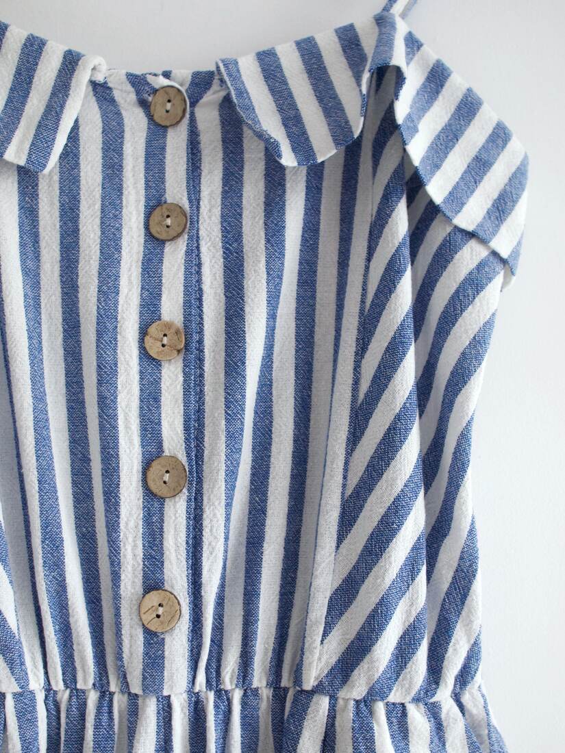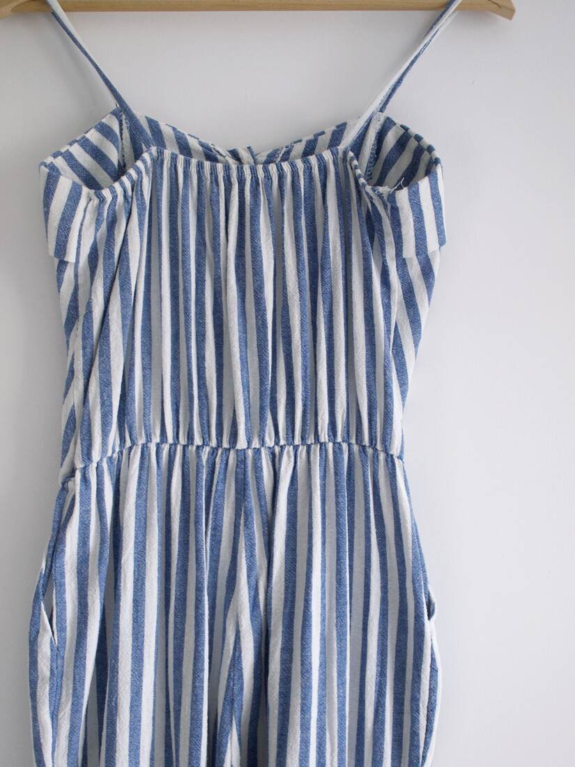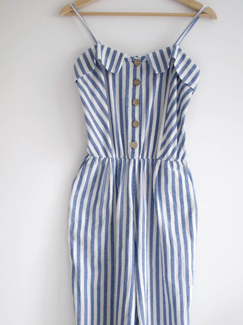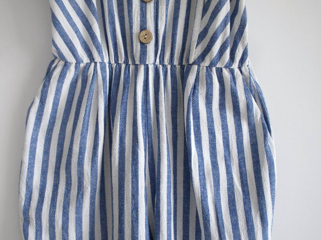 Kombinezon vintage wykonany z mieszanki bawełny i lnu. Ozdobne guziki z przodu, w pasie oraz w klatce gumka. Polecam na rozmiar XS-S. Bez wad.