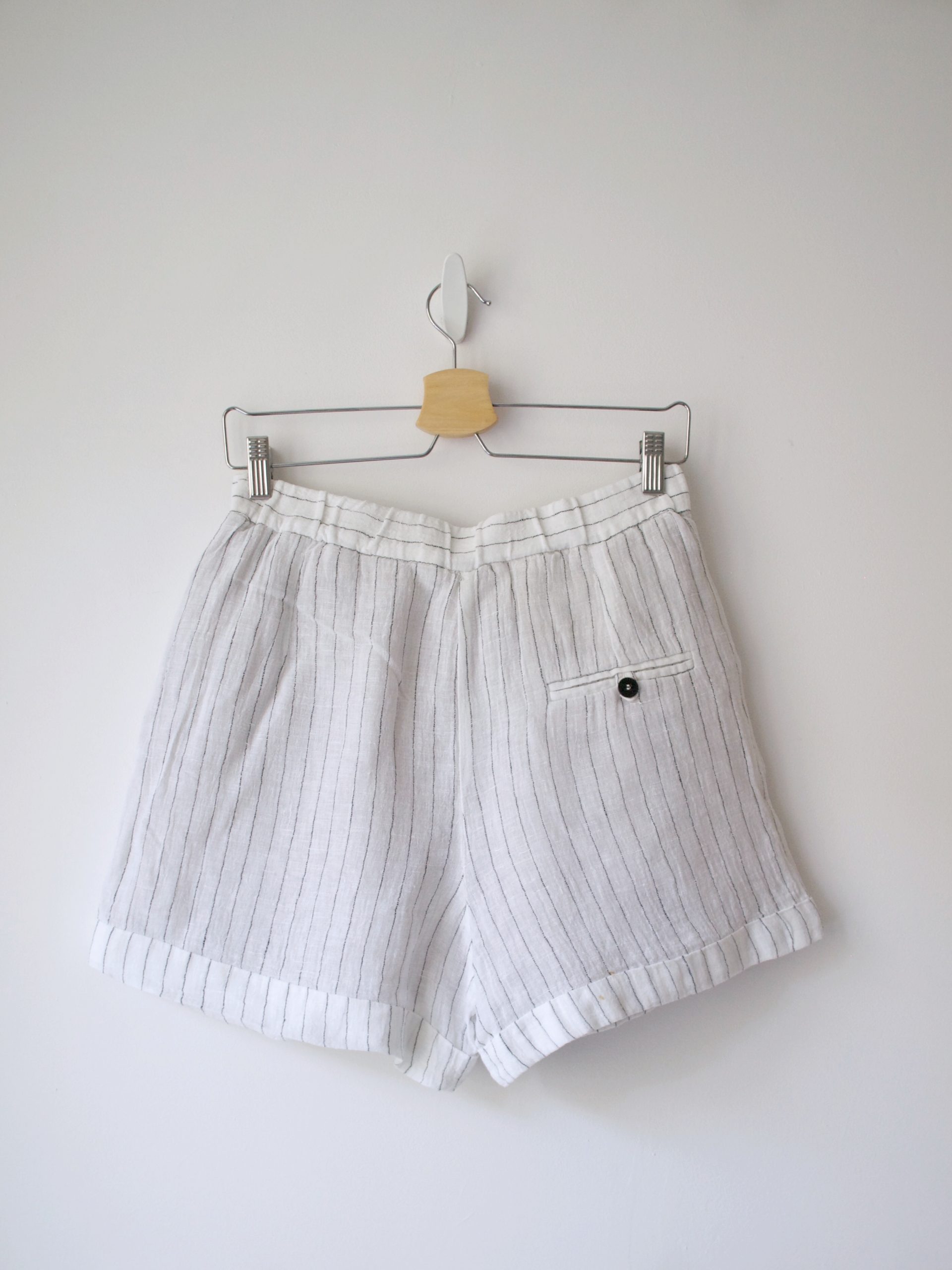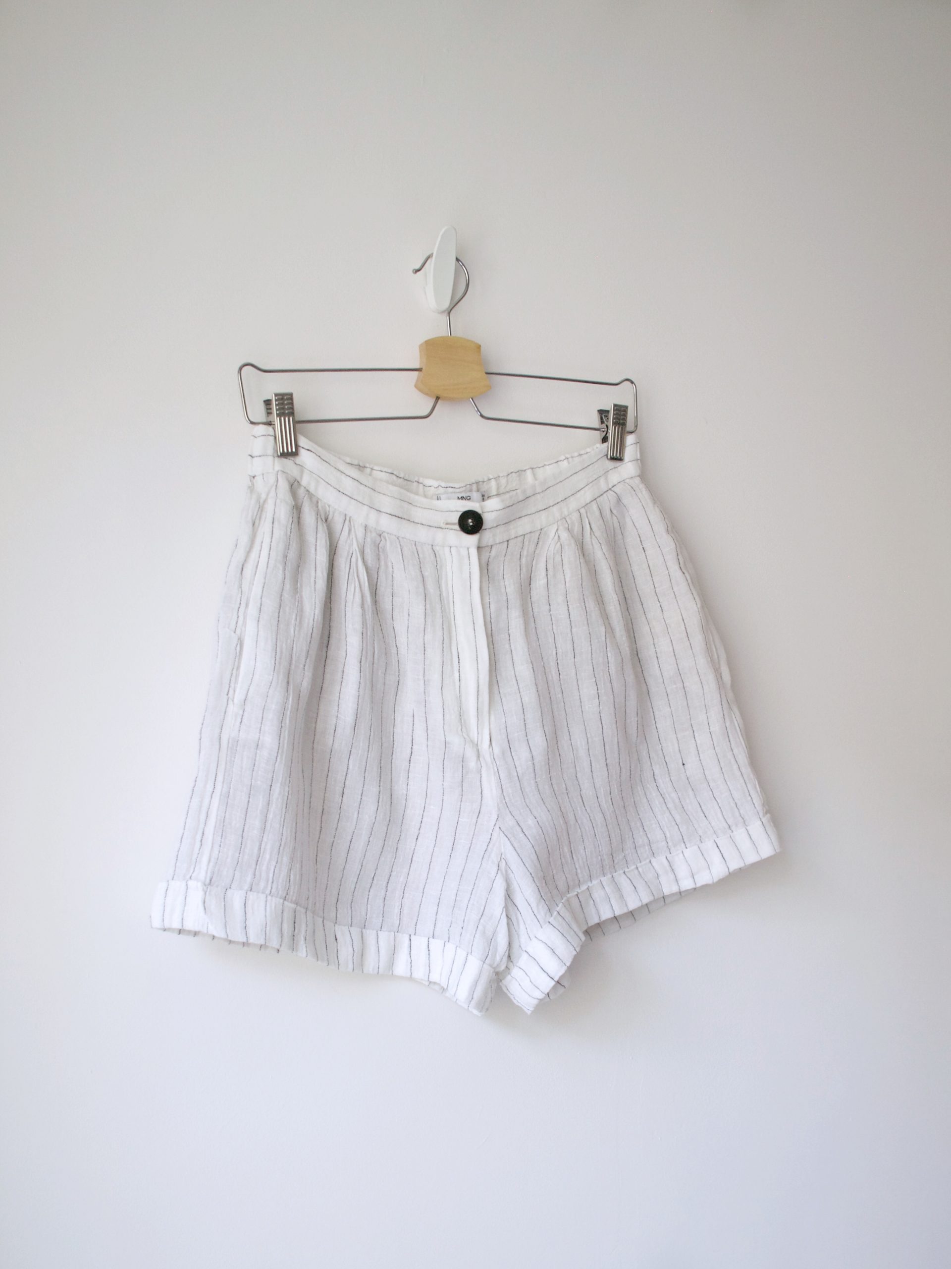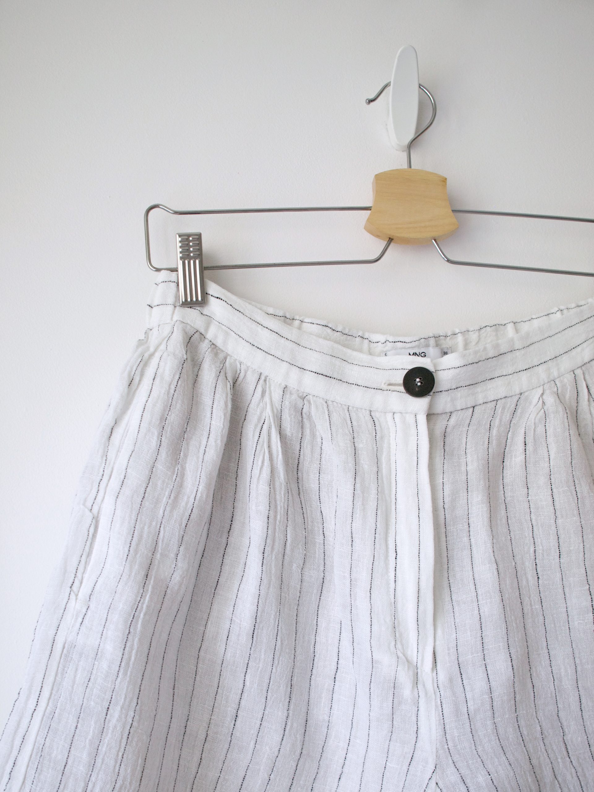 Spodenki w paski marki Mango. Rozmiar z metki: 38 Skład: len, podszewka poliester Stan: bez wad Szerokość w pasie 35-38 cm Szerokość w biodrach 52 cm Długość całkowita 38 cm
