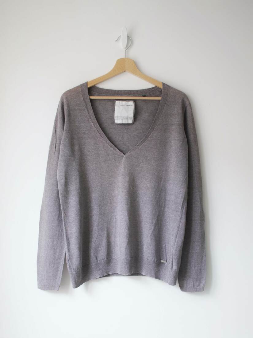 Klasyczny sweter M&S z dekoltem w serek. Skład to 100% kaszmir, bardzo dobry stan, jest minimalnie sfilcowany, nie jest to zauważalne, po prostu jest trochę sztywniejszy.