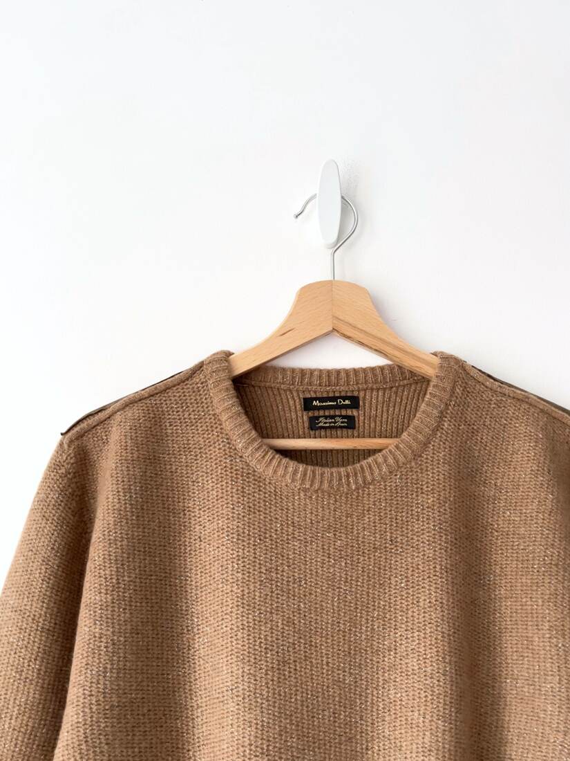 Gruby sweter marki Massimo Dutti. Wykonany z wełny z wiskozy oraz poliamidu. Na ramionach ma małe naszywki. Polecam na r. L-XL. Bardzo dobry stan.