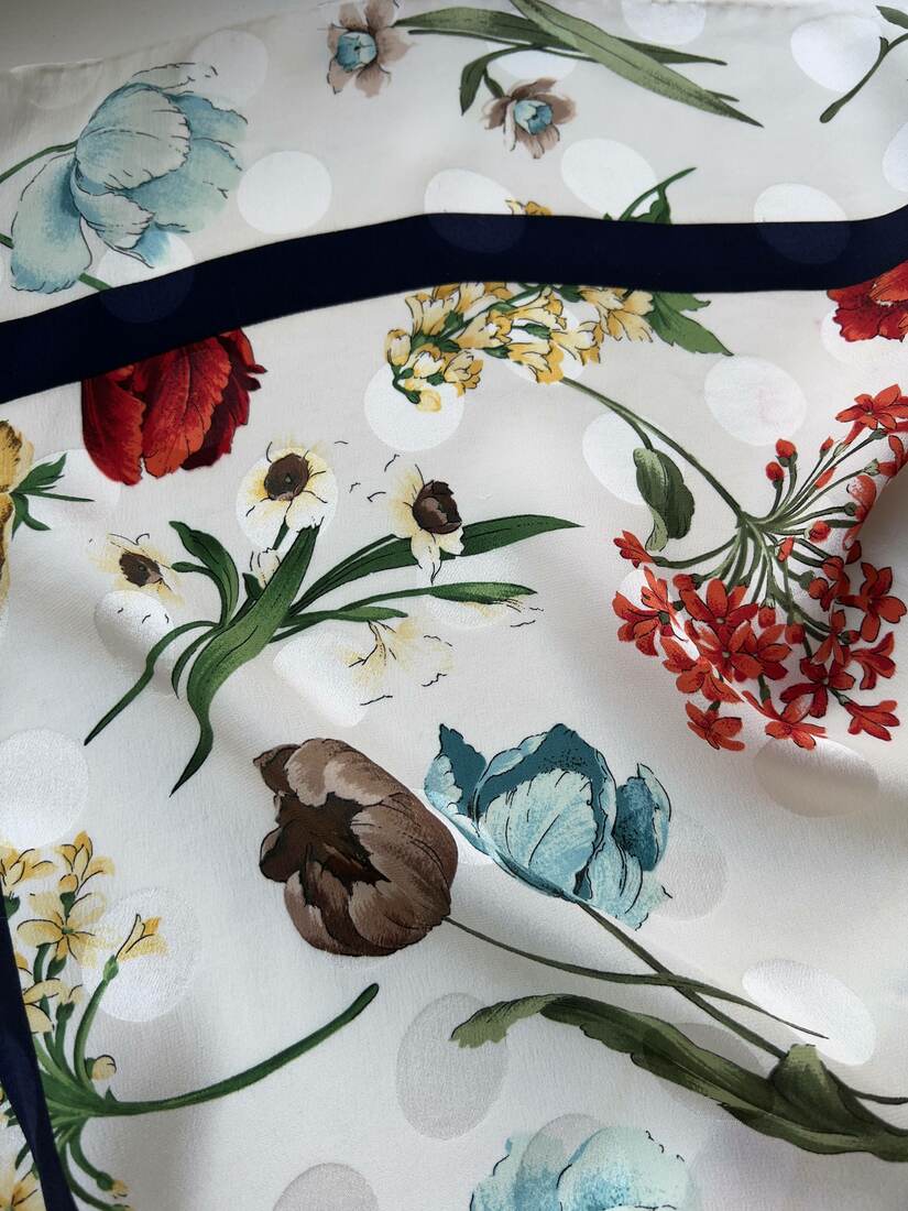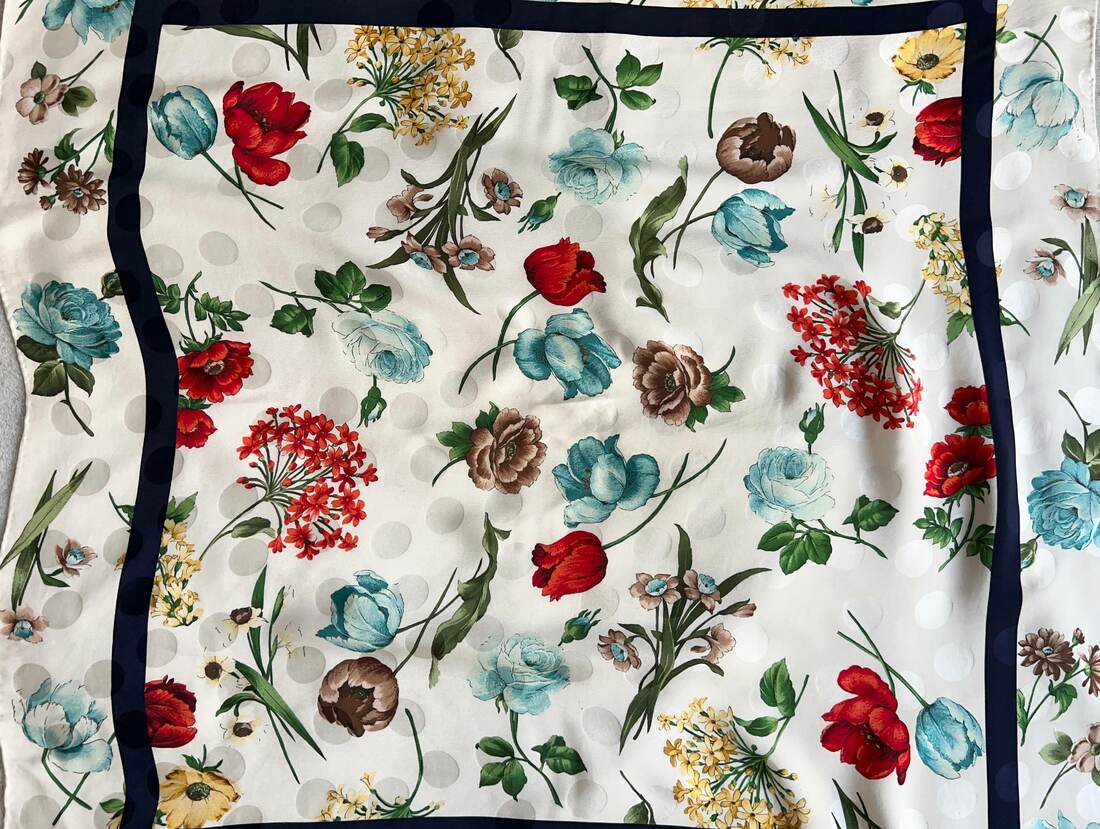 Duża jedwabna chusta vintage, marka Medici. Ręcznie rolowana. W niektórych miejscach są delikatne przebarwienia, nie widoczne w noszeniu.