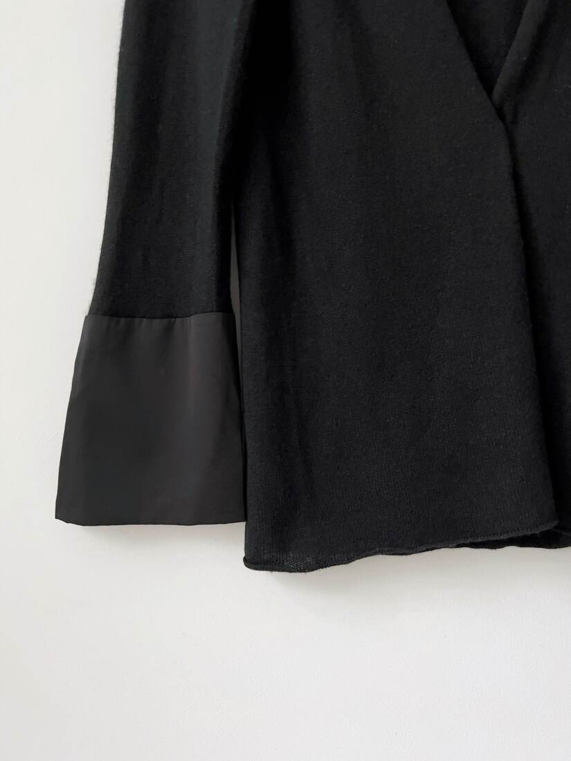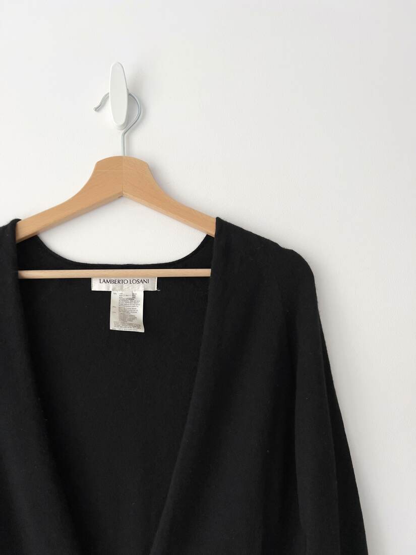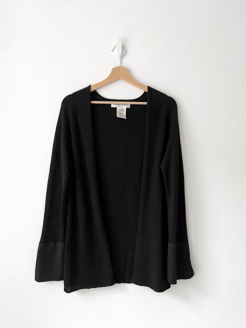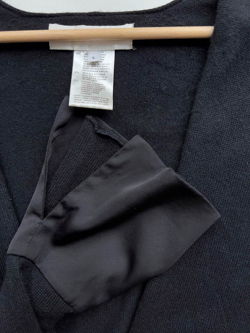 Sweterek narzutka ekskluzywnej marki Lamberto Losani. Wykonany z bardzo miłej w dotyku mieszanki wełny merino, jedwabiu oraz kaszmiru. Poszerzane rękawy wykończone jedwabiem. Rozmiar z metki L, dość uniwersalny.