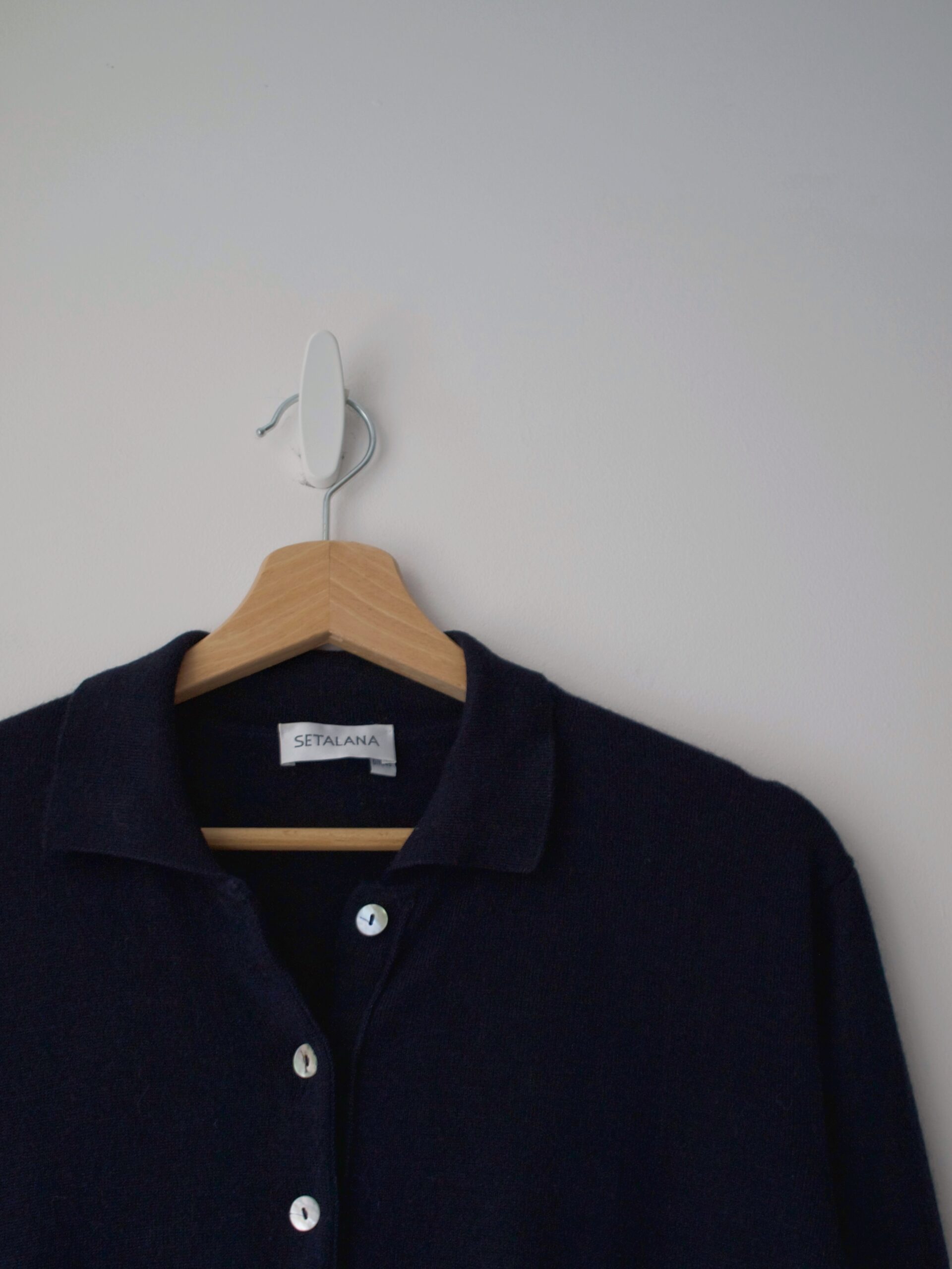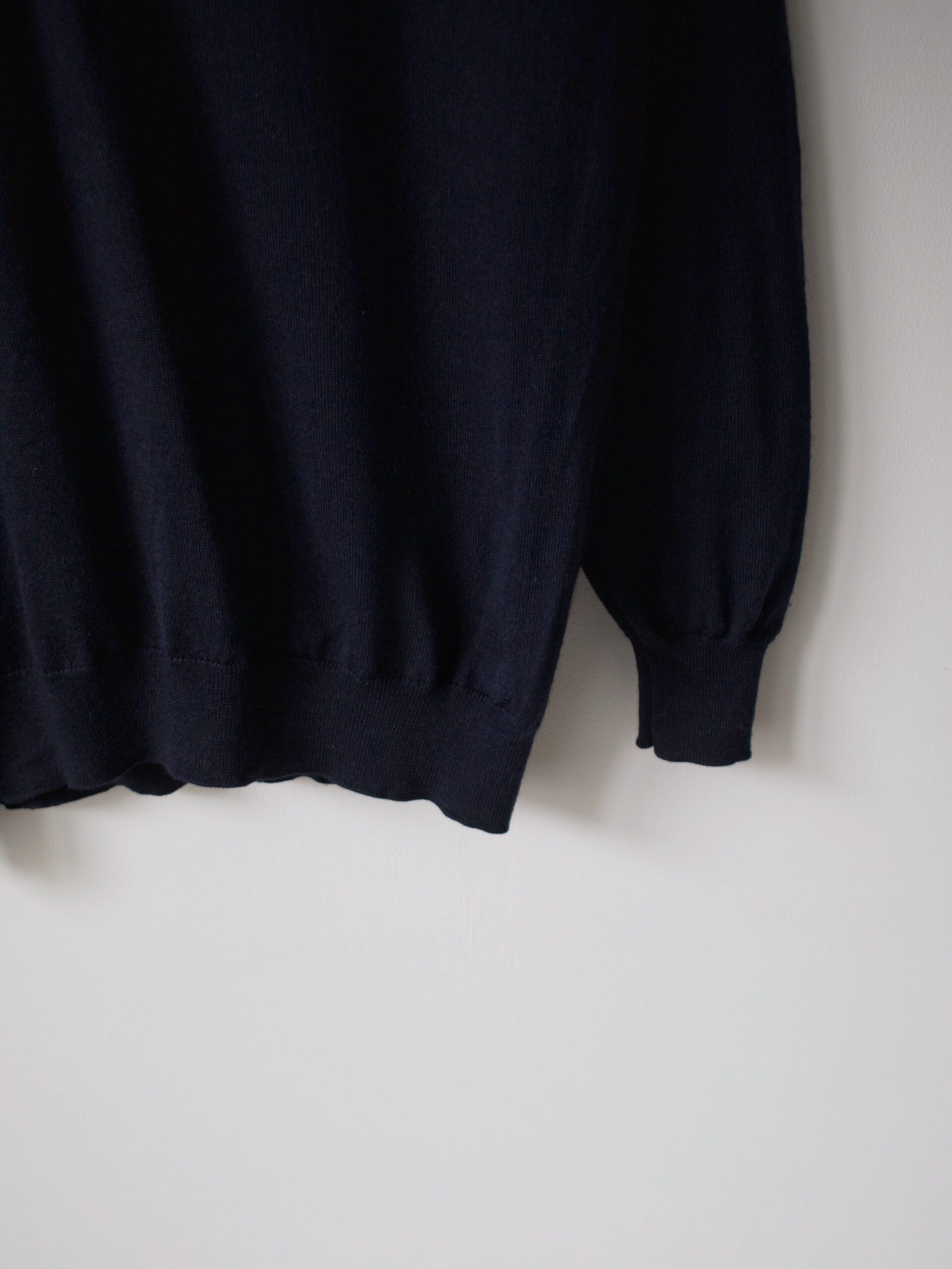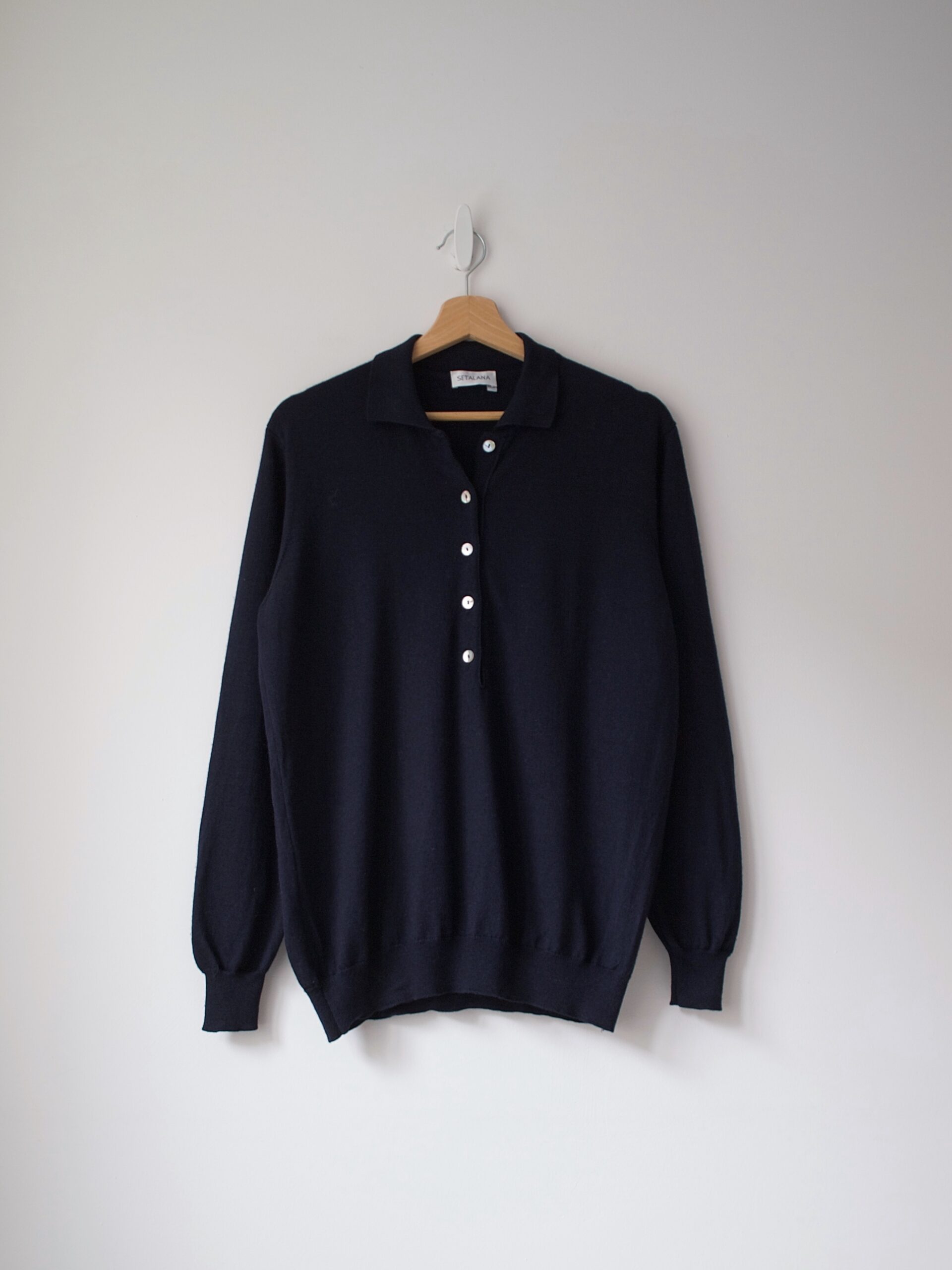 Sweter polo, wykonany z miłej w dotyku mieszanki wełny z merynosów, jedwabiu oraz kaszmiru. Kolor granatowy.
