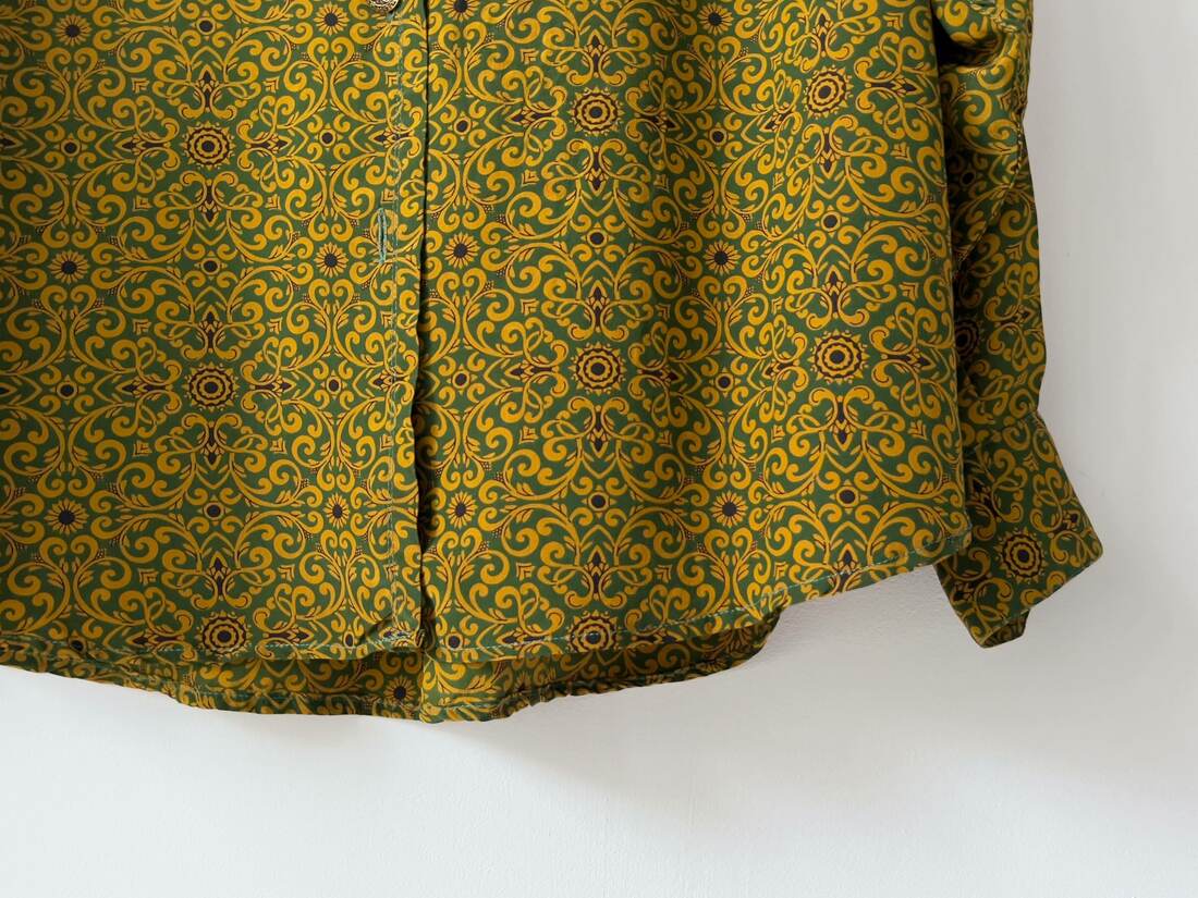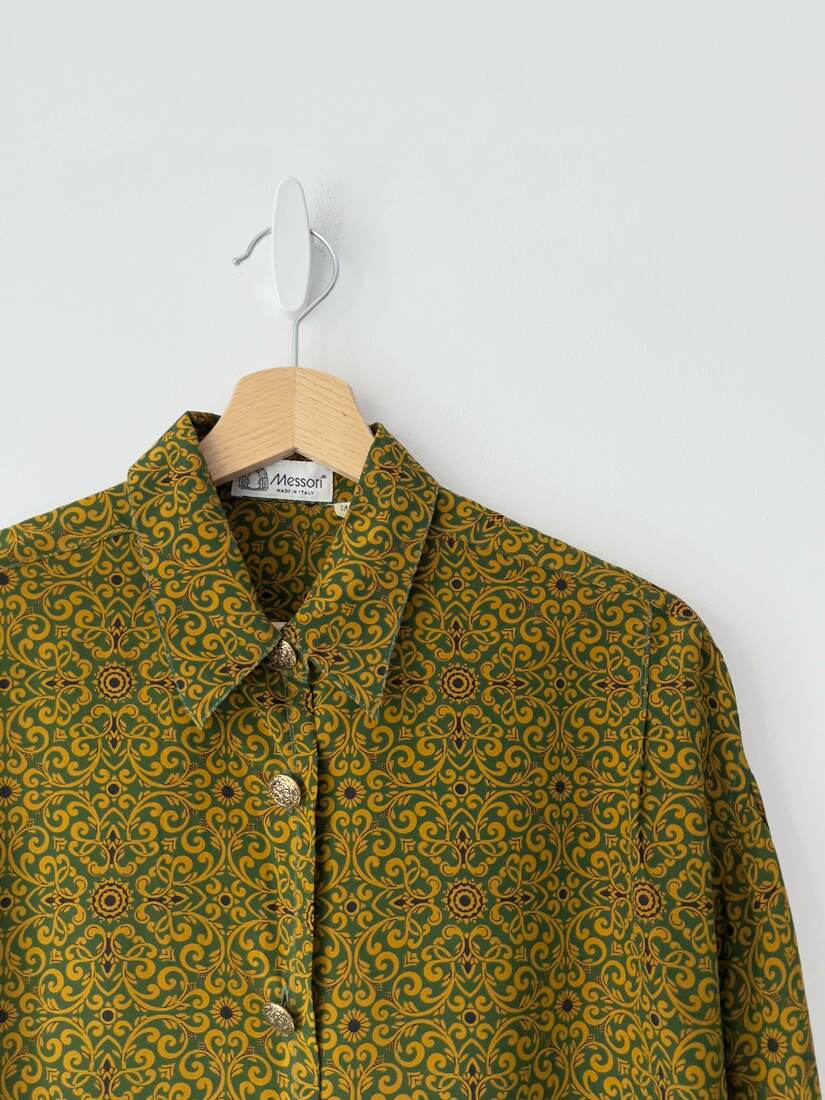 Wzorzysta jedwabna koszula. Wyprodukowana we Włoszech, w atelier Messori, które kwalifikuję się w produkcji luksusowych ubrań na zamówienie. Prawdopodobnie model vintage. Rozmiar z metki M, luźny fason. Brak dolnego guzika, poza tym bez wad.