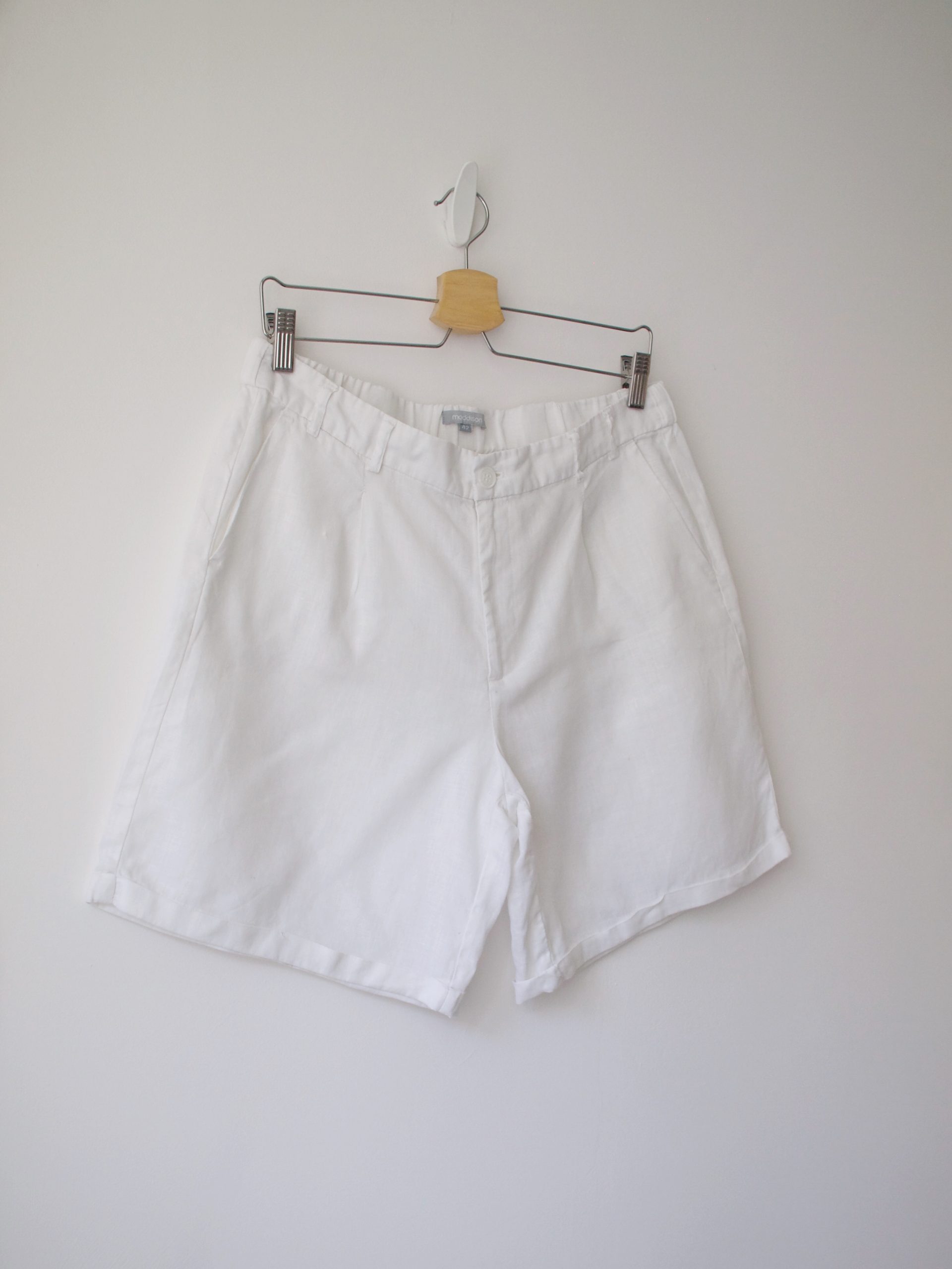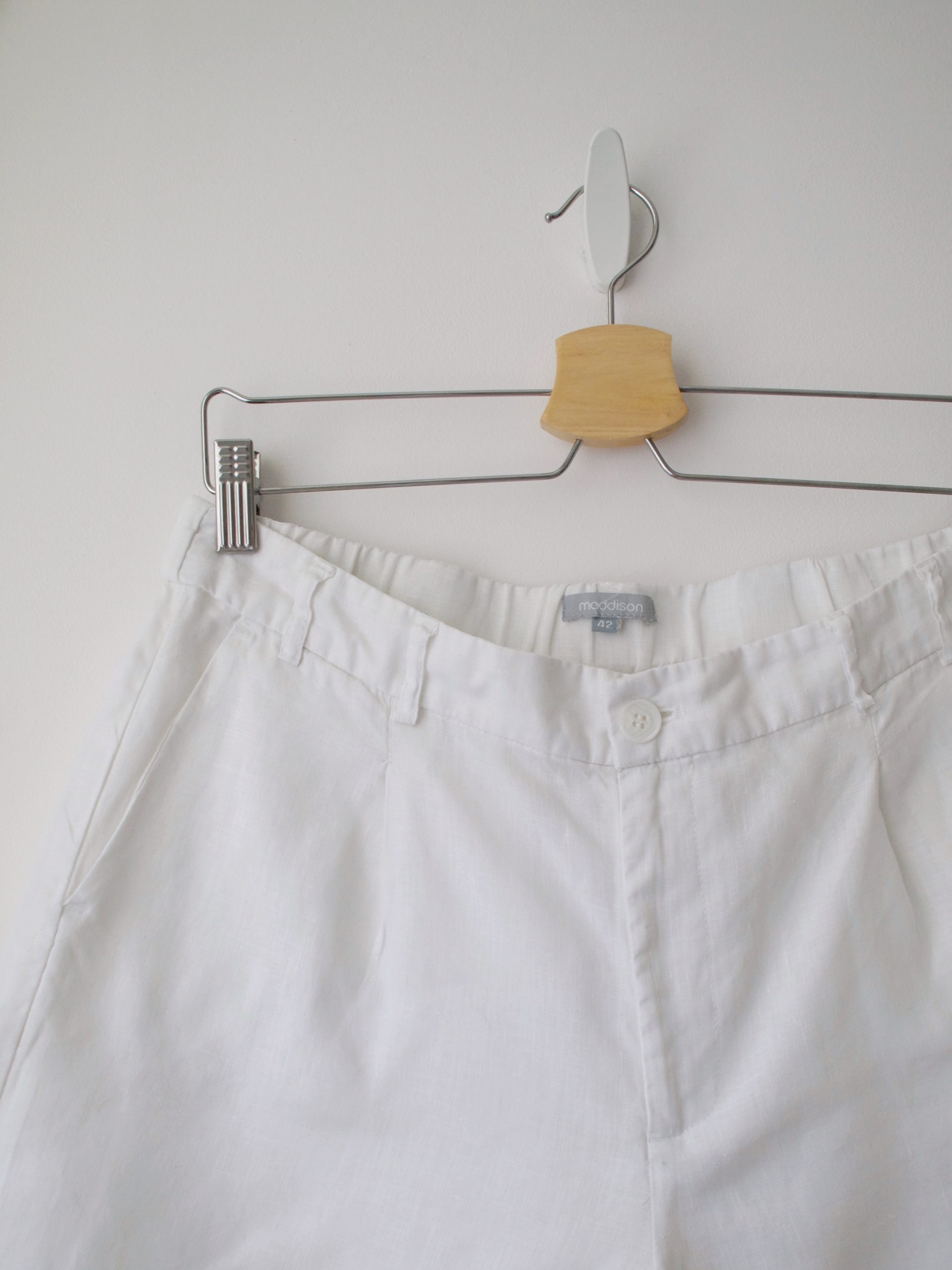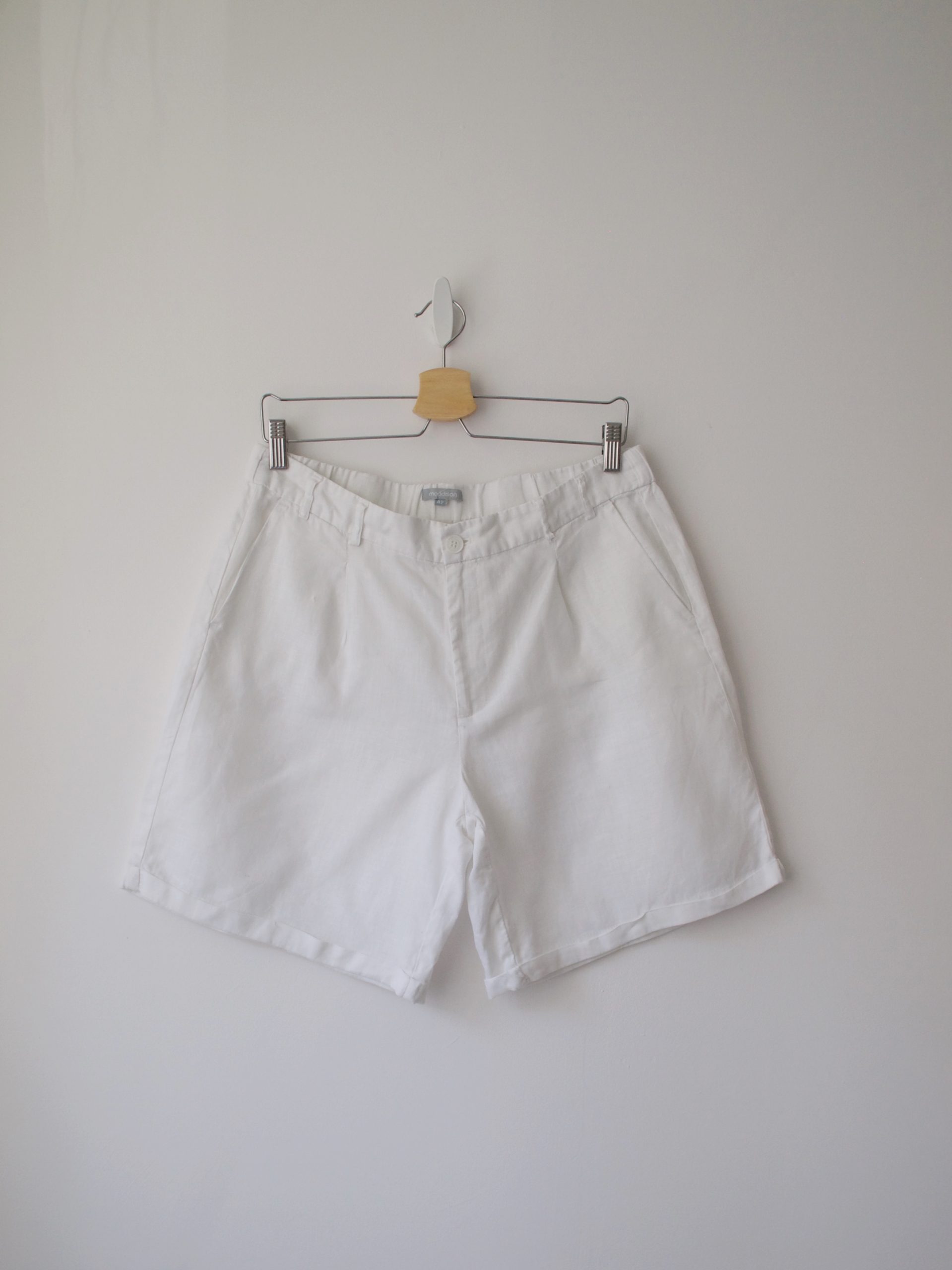 Lniane spodenki marki Maddison. Rozmiar z metki: 42 Skład: 100% len Stan: bez wad Szerokość w pasie 41 cm Szerokość w biodrach 58 cm Długość całkowita 46 cm